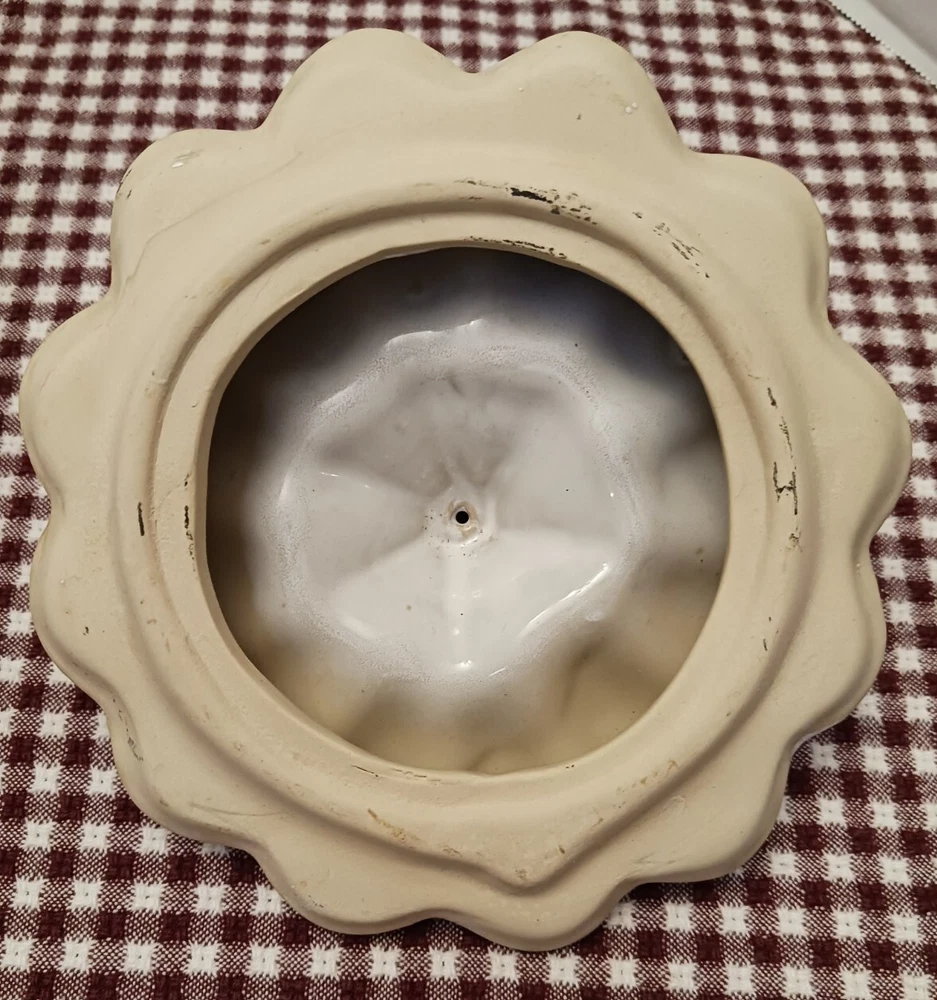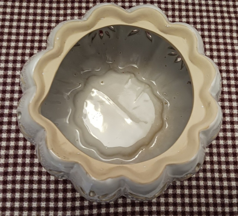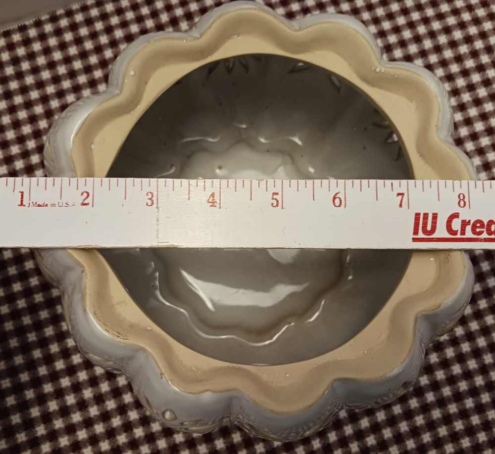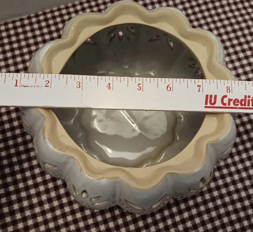 Ceramic White Pumpkin Luminary Candle Holder Smoke free, pet free home Approximately 9 inches wide and 8 inches tall Candle not included Unglazed underside of lid and unglazed bottom of pumpkin show some discoloration scratches from use No chips or cracks