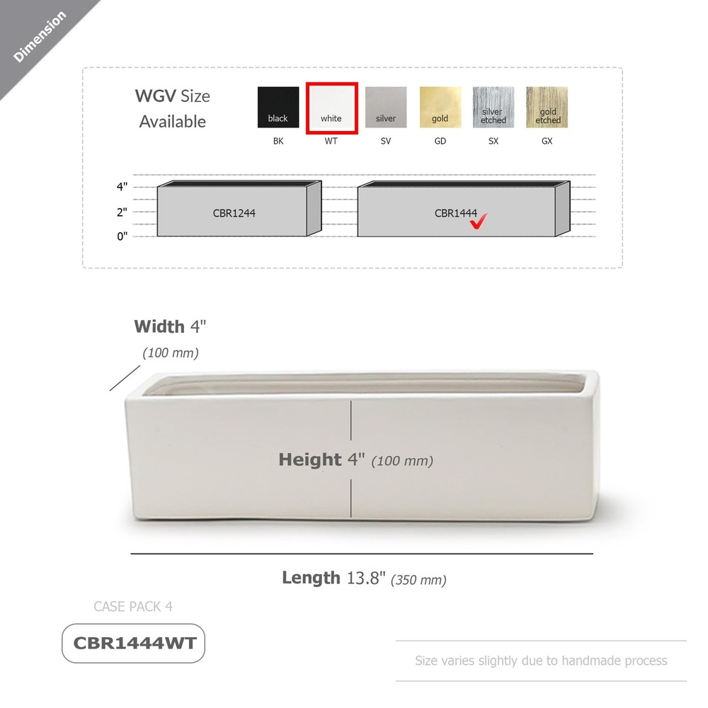 WGV International DBA Wholesale Glass Vases International’s () ceramic Long Rectangle planters and pots are exclusively designed to be unique, functional heirlooms for those who seek to add a textured vase style to any setting. By using foundational ceramic crafting principles of precision, dedication, and creativity has created a beautifully inspired line that contains beautiful bold colors. This line includes textured vases smooth surfaces that bring whimsy and movement to your interior design. Royal colors bring instant style and design to these trendy chic vases making them perfect for all types of settings and usages. All Wholesale Glass Vases International’s ceramic cylinder vases make great wedding gift ideas, wedding centerpieces, tabletop decoration, entryway vase, flower vase, or home office decor. These traditional pieces give your home office decor a modernly trendy facelift. Add flowers if you wish, but these cylinder vases can also stand alone as a stand alone table vase. Shop all ’s ceramic cylinder planter vase pots for more planter vase, textured vases, and flower vases. WGV ceramic vase decor for home, apartment, or condo. Perfect organic accent for any kitchen, entryway, bathroom, dining room, living room, or master bedroom. Add elegance to your nightstand, bookshelf, coffee table, dining table, patio, or porch. Business Decor: Sophisticated, earthy accent ideal for a reception area, lobby, lounge, entrance, or waiting area. Modern decor for the conference or boardroom, or as a single white ceramic vase at a restaurant for dining tables. Other Uses: Use as a wedding gift, home office decor, flower pot, flower vase, or housewarming gift. Durable Ceramic Construction: Made from sturdy ceramic material for long-lasting use. Versatile Decor: Can be used as a centerpiece, floral vase, or decorative accent for any room. Flower Pot Design: Rectangular shape with raised edges provides a natural look for indoor gardening. Easy to Mount: Can be set on a table or shelf to display your favorite plants or flowers. Vibrant White Color: Eye-catching white finish adds a clean, modern look to any space.