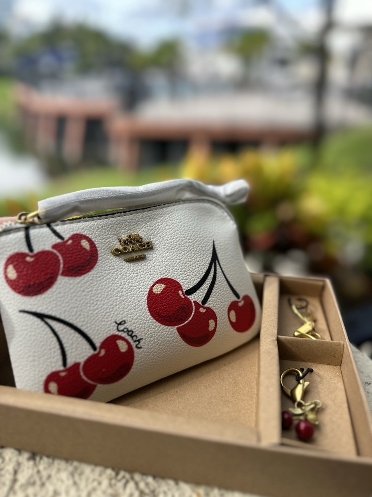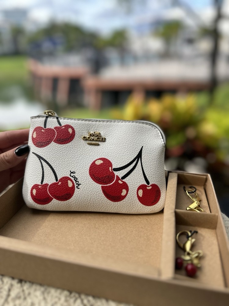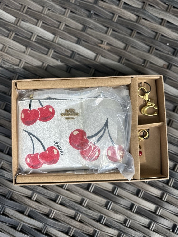 Wallet, Case , Color White, cherry print. keychain , cherry keychain.