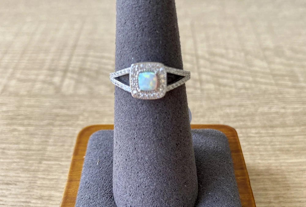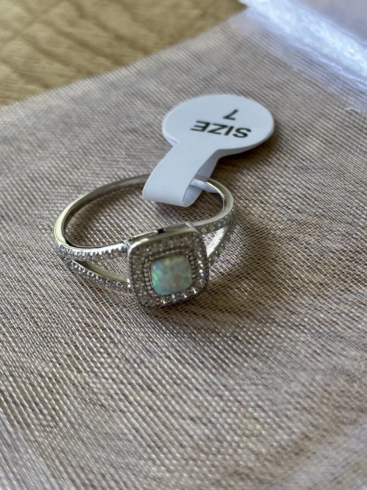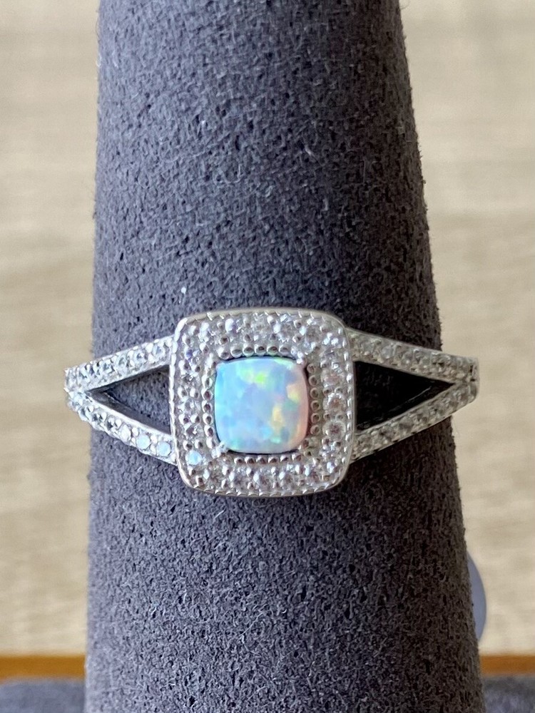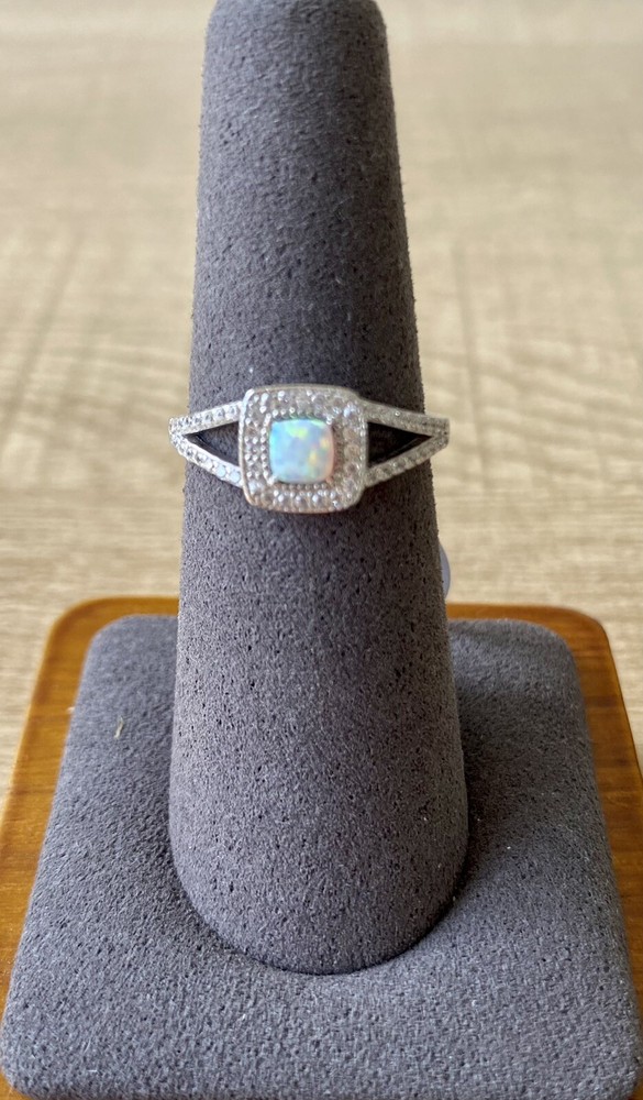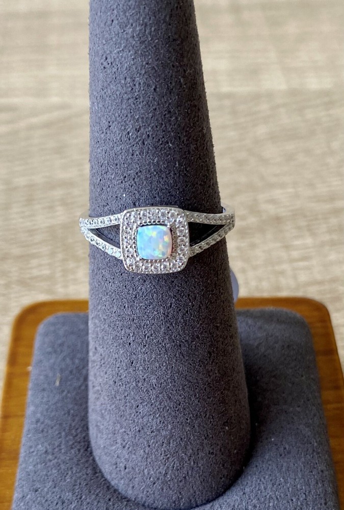 925 sterling silver ring , it features a square-shaped opal with inlaid cubic zirconia stones. The ring is hallmarked and comes in a elegant white colour. The ring is available in a size N All rings come in a gift bag