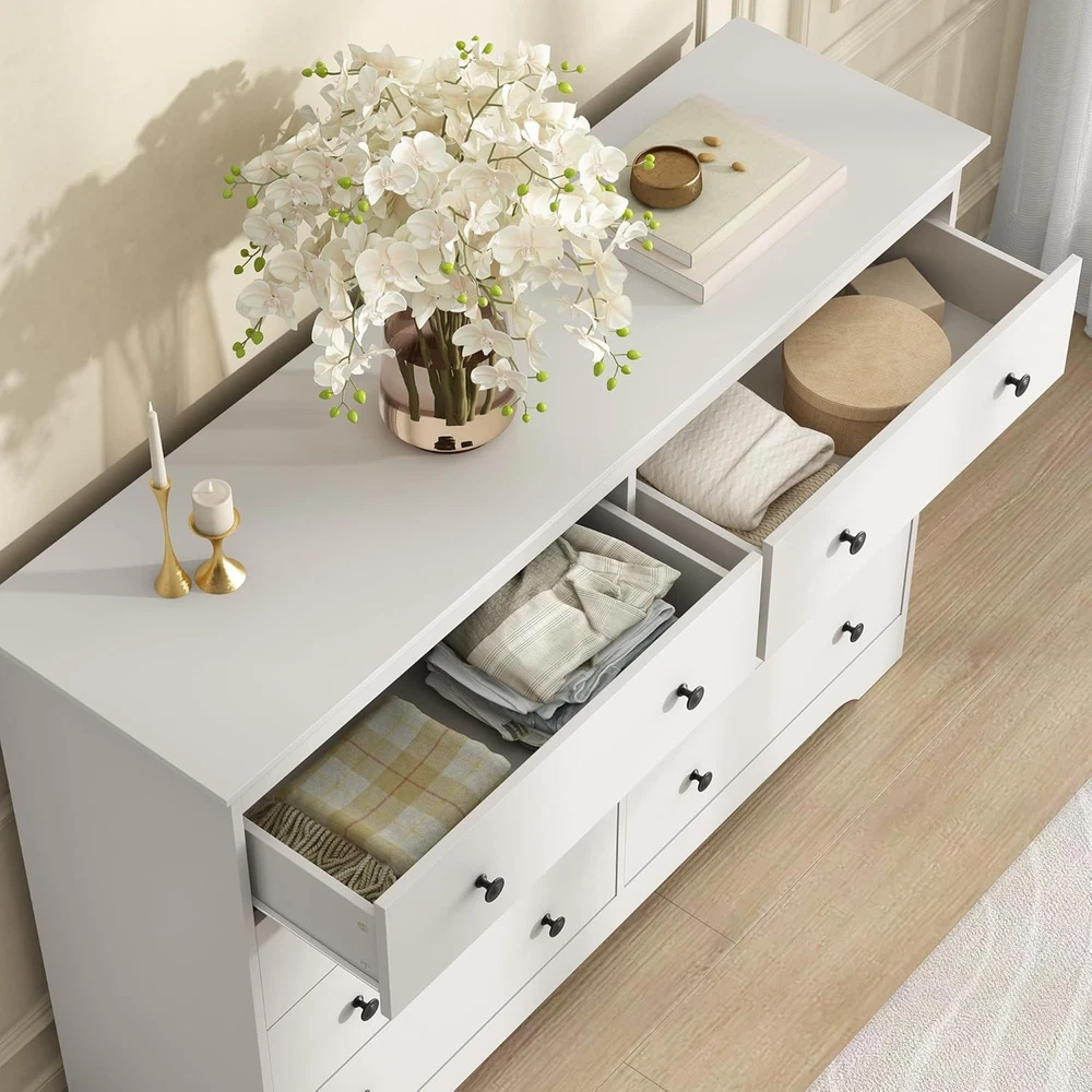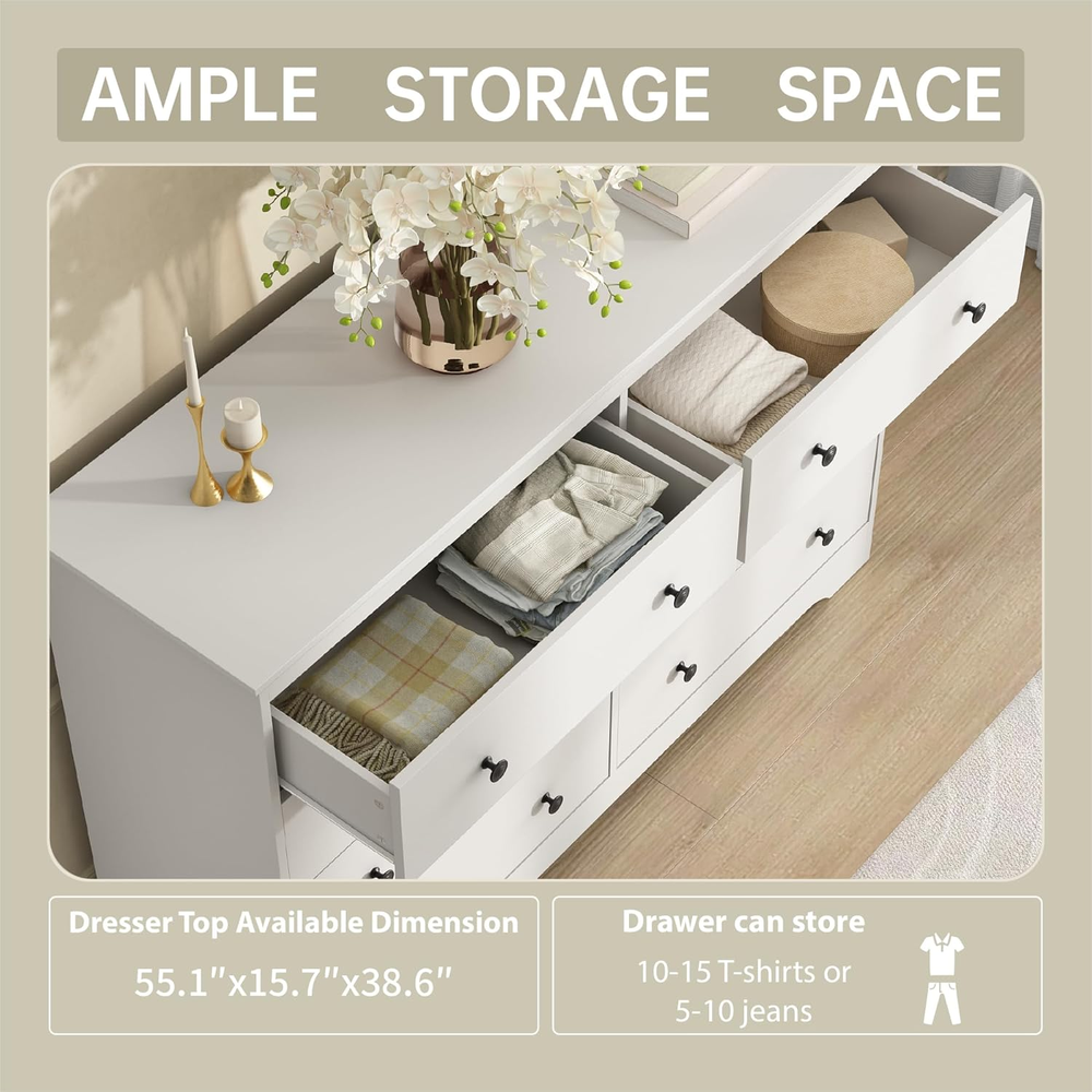 Store New Arrivals Add to Favorite View Feedback Contact White Dresser for Bedroom, 8 Drawer Dresser with Large Drawers, 55 Inch Wide Wood Chest for Living Room, Hallway Description Item model number FH0054WH Room Type Bedroom Assembly Required Yes Color White Target Audience Adult Brand BAZELOR Material Wood Item Weight 110 pounds Model Name Dresser Number of Drawers 8 Size 15.8"D x 55.1"W x 39"H (8 Drawers) Finish Type Lacquered Product Dimensions 15.75"D x 55.1"W x 38.97"H Manufacturer BAZELOR [Modern Dresser]: The dresser for the bedroom features an elegant and eye-catching design. This modern white dresser, with its striking bright white finish and classic black knobs, brings the charm that all cozy rooms desire. The wide dresser features clean, simple lines that make it blend into any style, from modern to traditional. [Sturdy Frame]: The white dresser is made of high-quality engineered wood, which is scratch-resistant and water-resistant. The integrated dresser legs and anti-toppling device made the dresser not slide easily, providing great durability and stability. The top surface of the dresser can hold 150 lbs and each drawer can hold 35 lbs. [Multifunctional Design]: This 8 drawer dresser offers a wide range of possibilities to complement your home. With 8 smooth-gliding drawers, our wood modern dresser offers efficient storage solutions. It can be used as a makeup cabinet in the bedroom, a TV stand in the living room. Also, it can be put in any home corner such as the playroom, nurseries, hallway, entryway. [Large Storage Capacity]: This storage chest provides you with 8 large drawers, It can help you conveniently store your clothes, beddings, cosmetics, jewellery etc. to keep your space tidy. Also, the huge countertop that is 55 inches wide can accommodate anything, including a television set. [Easy to Assemble]: Chest of drawers includes easy to understand instructions describing the parts and screws needed for each step so you can assemble it with ease. If you have any problems with the assembly, please feel free to contact us. Product description 8 Drawers Modern Dresser Overall dimensions: 55.1 in x 15.7 in x 38.6 in Desktop weight capacity: 150 lbs This 8 - drawer storage dresser has a clean, timeless design—simple yet stylish, blending classic charm with practicality. Ideal for any room, it works as a bedroom storage unit, a living - room side table, or fits right in dining rooms, hallways, kids’ spaces, and home offices. Keep clutter at bay with ample drawer space. Large Storage Space Our dresser greatly increasing the storage space and allowing you to categorize socks, clothes or plush toys. Modern Metal Handles The modern metal handles with a shiny finish make your dresser look more sophisticated. ABOUT US We offer the best prices around on high quality products. Our E-store includes media such as books, movies, music and games while offering electronics, toys, sporting apparel, clothing, tools, general home, garden items and more. SHIPPING We are always working hard to ensure your package arrives as soon as possible. Please understand that some factors like weather, high postal traffic, and the performance of shipping companies are outside of our control. RETURNS We offer a 30-Day Return Policy on items which you are not completely satisfied with. You have the option for a full-refund or an exchange of the item. No returns are available on items shipped outside of the USA. PAYMENT We accept PayPal. CONTACT US This page content is yet to come Please ad us to your favorite seller and visit again later Thank You CUSTOMER SATISFACTION We try our very best to make sure every customer is completely satisfied. If there's a problem, message us! We're happy to help. WE ACCEPT Copyright © 2021 AutoDS. | All Rights Reserved