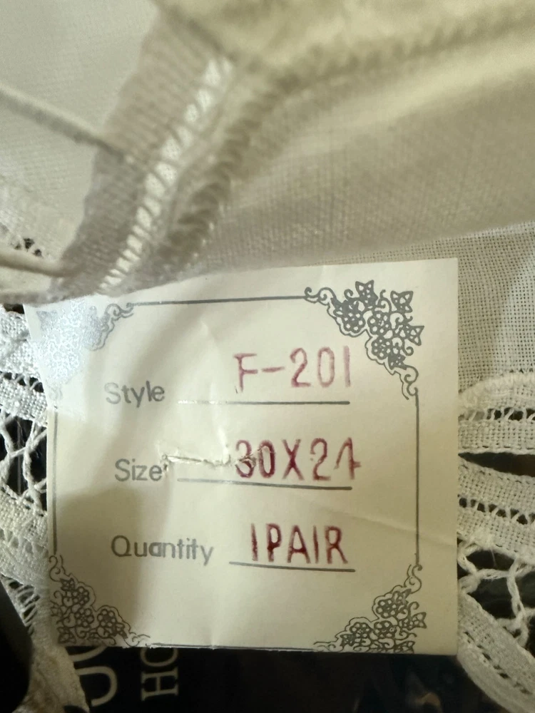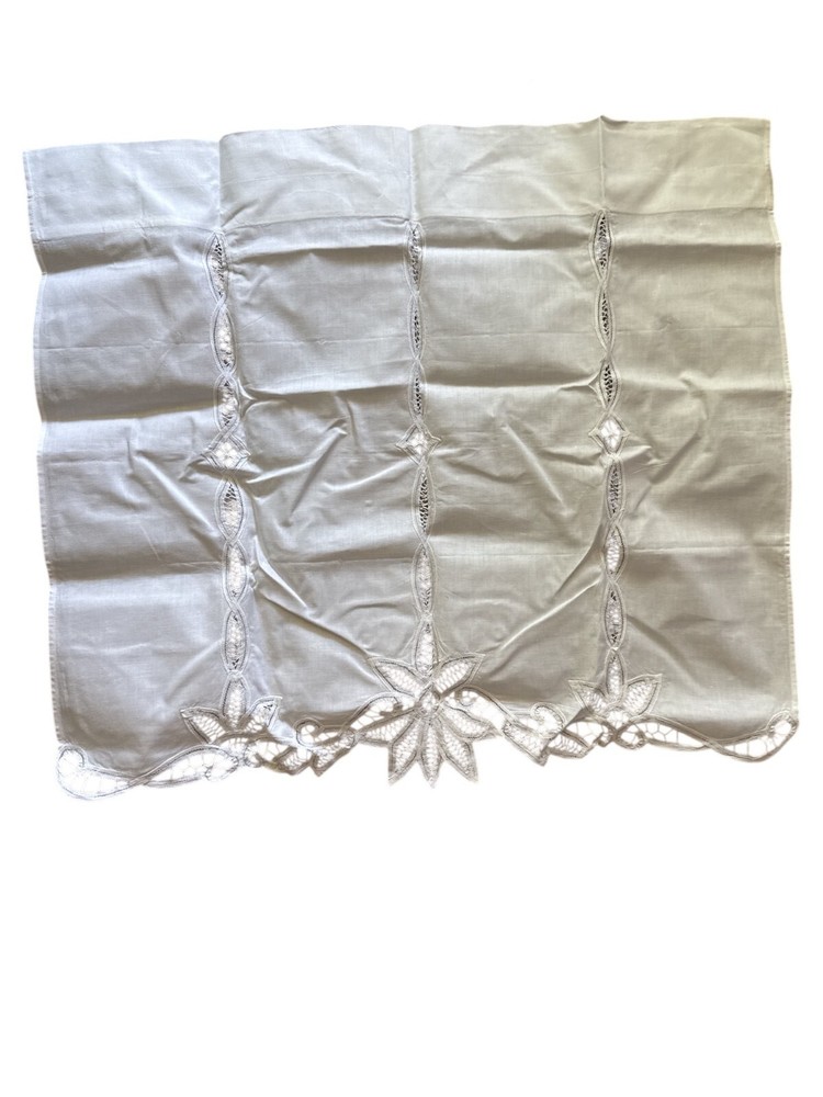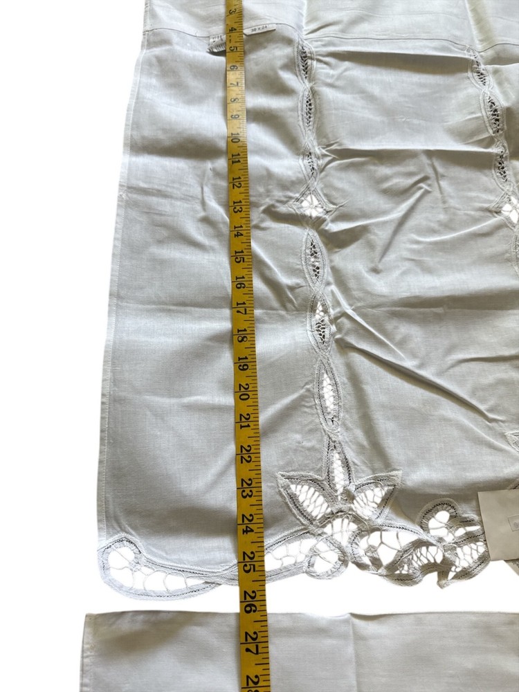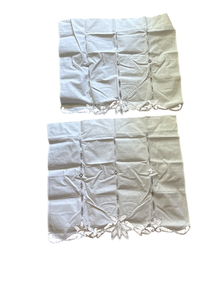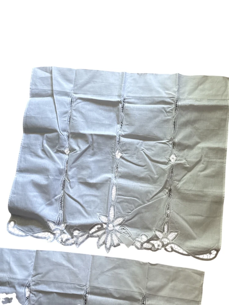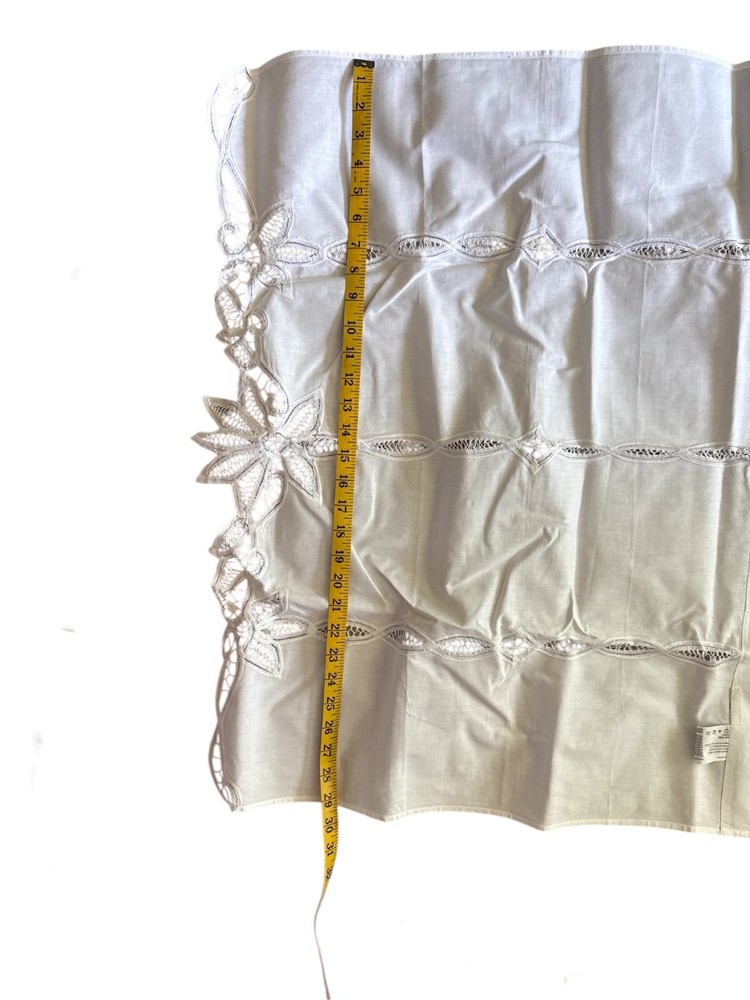 A delicate pair of white embroidered window curtains with intricate floral designs. The craftsmanship and soft linen material bring elegance to any setting. • Dimensions: 26” x 29” each • Made with soft, durable linen • Embroidered floral design with lace accents • Lightweight and easy One table runner shows slight creasing due to storage. Both are in beautiful condition with no visible tears or stains.