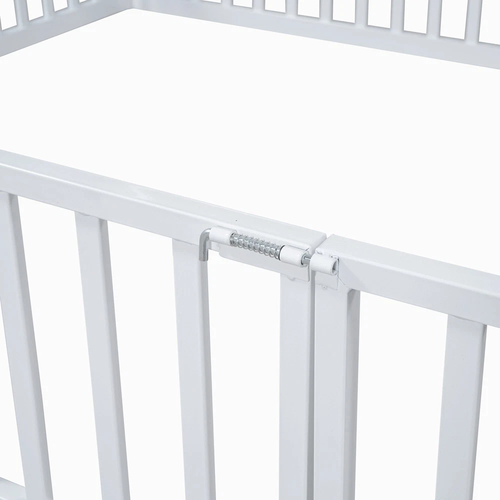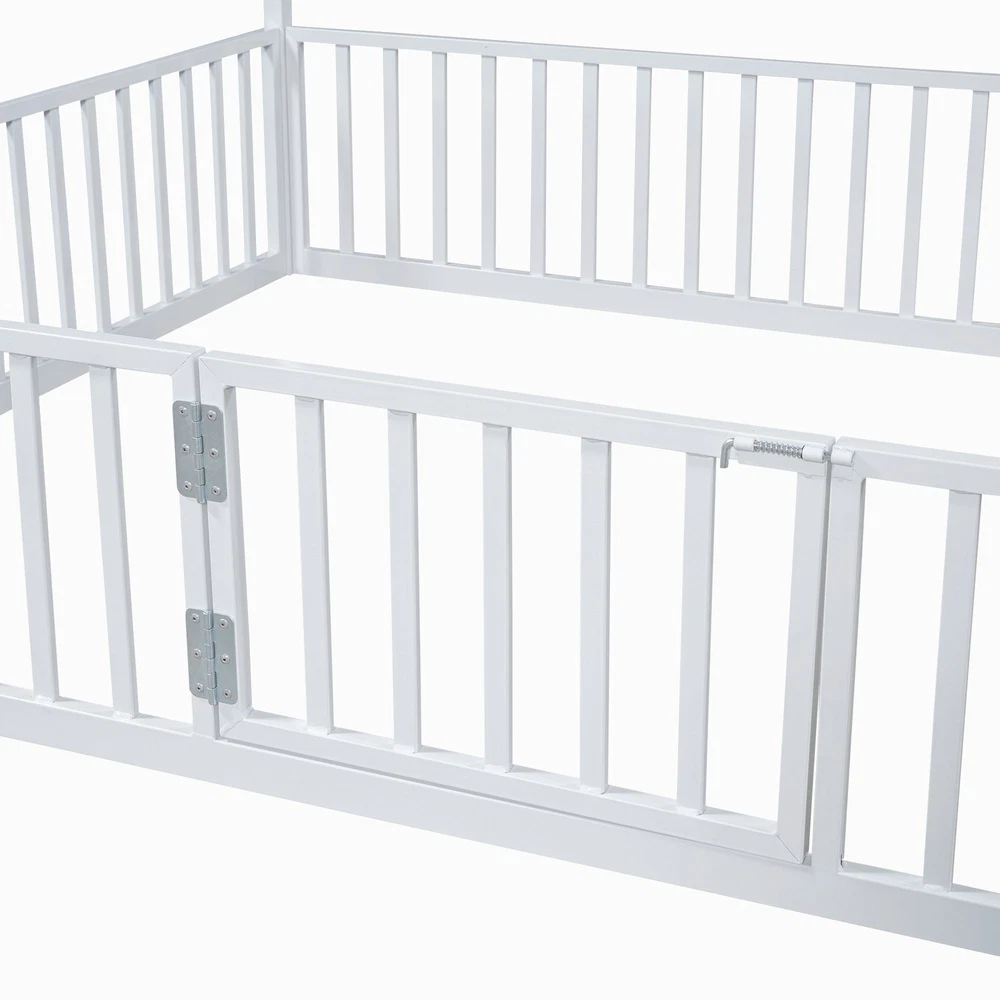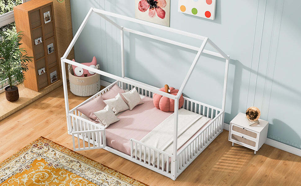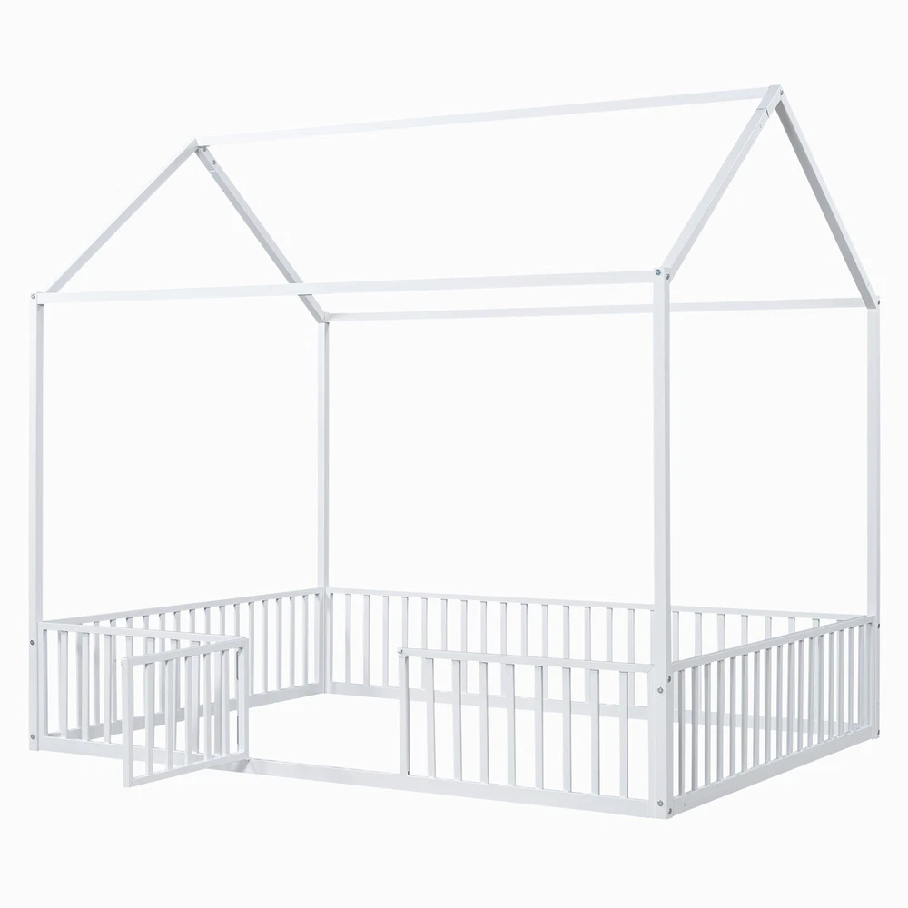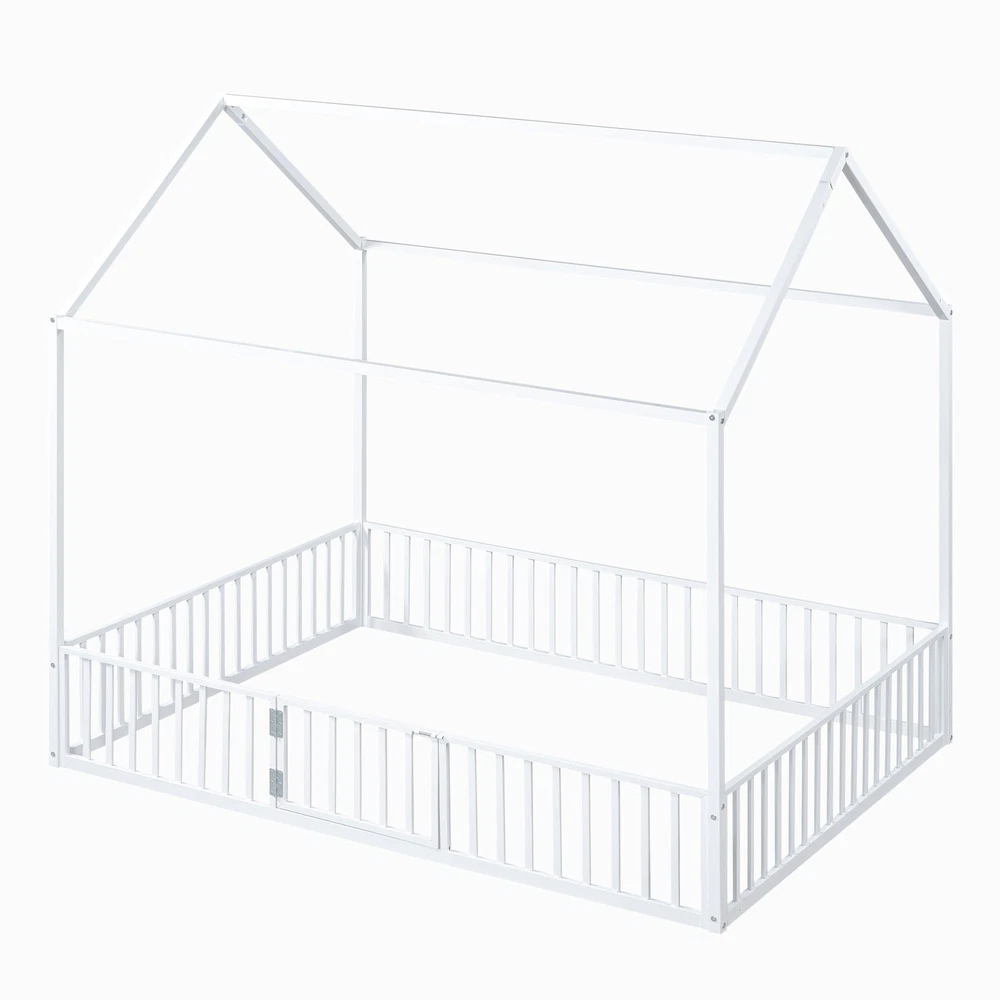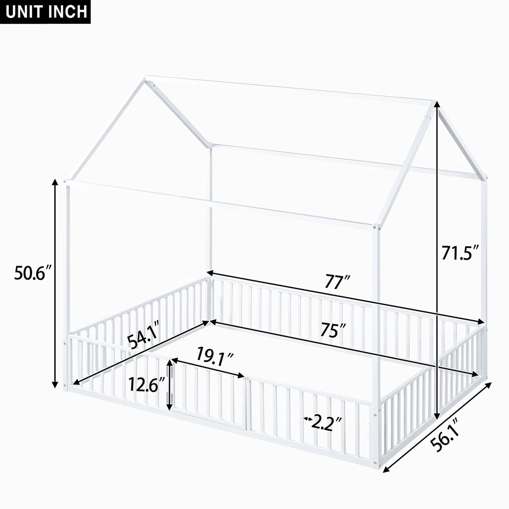 Specifications Place of Origin #originPlace# Main Color White Main Material Metal Dangerous Goods #dangerFlag# Dimensions & Weights Assembled Length (in.) 77.00 Assembled Width (in.) 56.10 Assembled Height (in.) 71.50 Weight (lbs) 72.00 Product Features [House-Shaped Design] The house bed featuring a classic house-shaped, this imaginative bed is equipped with a whimsical sky roof and uniquely shaped guardrail for a fun bedroom environment that your child will love. [Distressed Washed Design] This house bed has a distressed washed design, which gives a very special feeling and makes this bed unique. [A Better Space to Play] You can choose not to put the mattress in the bed frame, but let the child freely DIY this space to fully stimulate the child's creativity. [Fence with Door] The bed is fenced around the perimeter, but it is not a completely enclosed space because it has a small door over the fence. Kids can enter and exit freely through this small door. [Solid Construction] The house platform bed crafted from high-quality metal can last for long time use. The roof and fence are made from metal, ensuring strong stability and durability. Description Full Size Metal House Bed with Fence and Door With a roof, fence and a small door that can be opened and closed, this bed offers an enclosed play area perfect for exploring their imagination. This bed has a washed old design, regardless of gender, suitable for different people. This bed comes with a fence and a sturdy metal frame, providing a safe space for your child to get a good night sleep. Description Material Metal Size Full Color White Numbers of Package 1 Spring Box No need Assembly Required Yes <