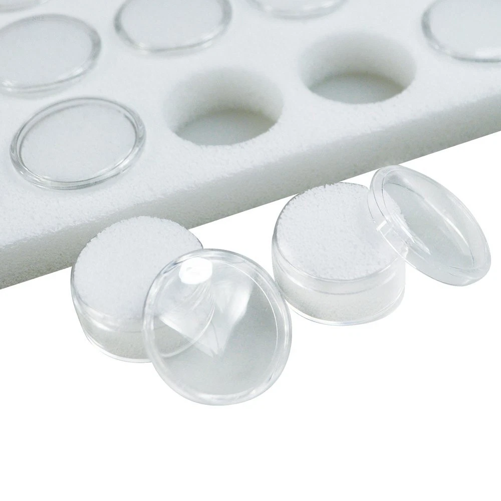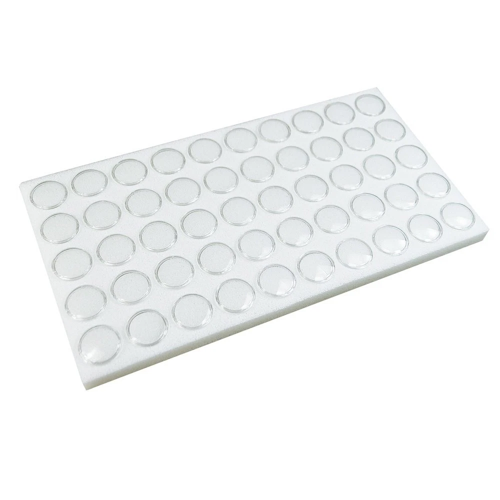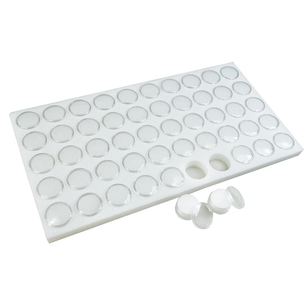 PRODUCT DESCRIPTION-This is a new gemstone insert for Tray that contains foam removable clear plastic round jars PRODUCT USES-Can be used with standard jewelry tray.Perfect for display of Gemstones, Jewelry Findings, Watch Parts and pins, precious stones, Body Jewelry, Beads and coins in Showcases & Counter-tops. TRAY LINER-will fit into any of our full-sized trays. This product contains a foam 50 liner with acrylic jars with removable on and off lids, and each jar contains a foam insert. Use this liner to protect and organize gemstones, beads, and body jewelry! These acrylic jars are a great solution for keeping your products separated by size, color, and type. SIZE- Jars measure 1 1/8" diameter. Tray liner measures 14 1/2" x 7 3/4" x 3/4". MATERIAL- 50 Acrylic Clear jars with tight Lid and white foam insert and Standard size White foam liner.