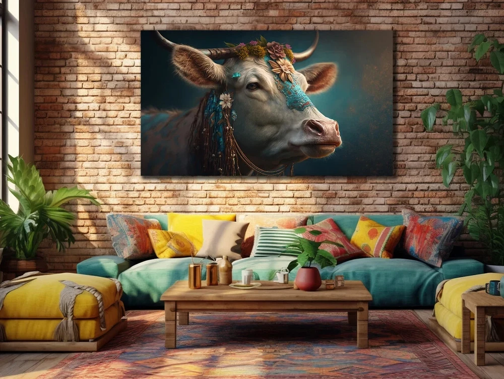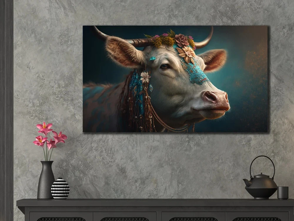 White Highland Cow Face Floral Paint Unframed Canvas Print Australian Wall Art