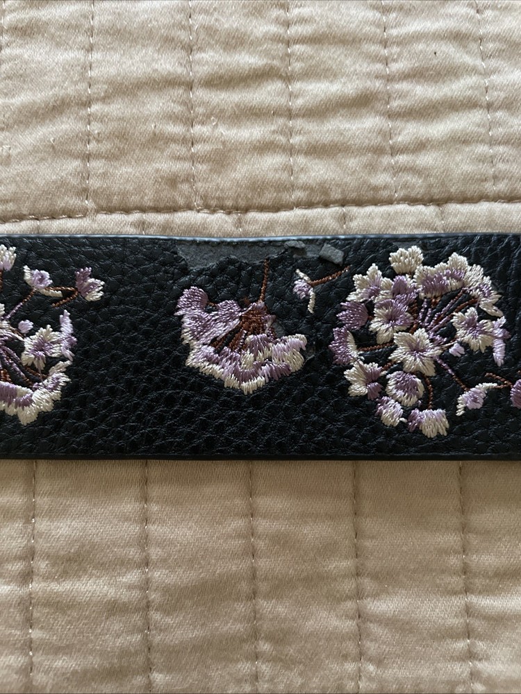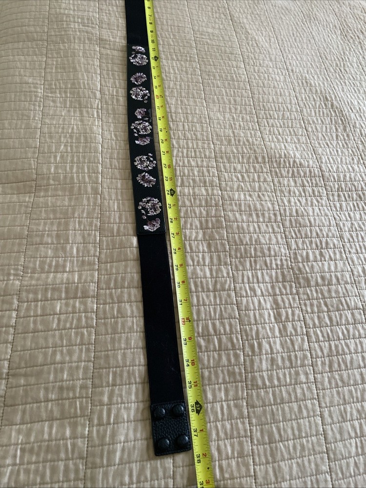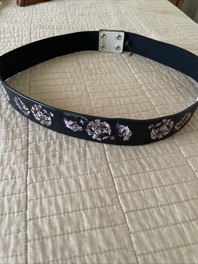 The White House Black Market Elastic Waist Belt in size XL features a stylish black leather and floral lilac design, perfect for adding a touch of feminine flair to any outfit. Made from genuine leather in the back and elastic material on the sides, this belt is both comfortable and stylish. The metal hardware adds a touch of sophistication to the waist belt, making it a versatile accessory for any woman's wardrobe. Perfect for those with a plus size waist, this belt is both fashionable and functional, making it a must-have accessory for any wardrobe. Good preowned condition with a small visual defect as shown on the photo.
