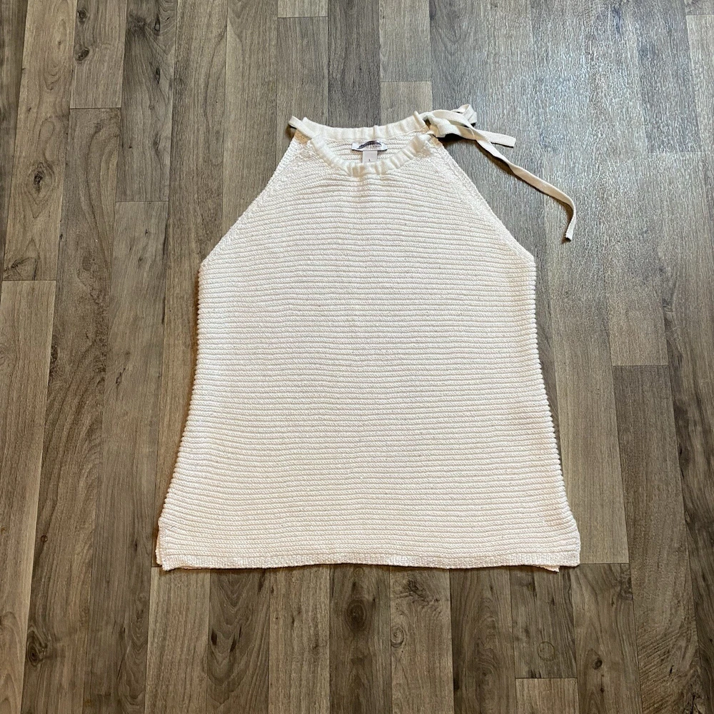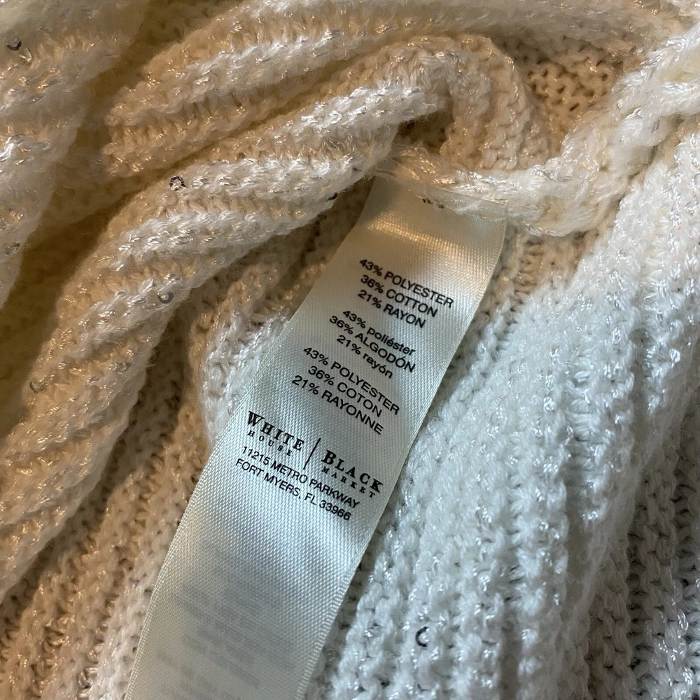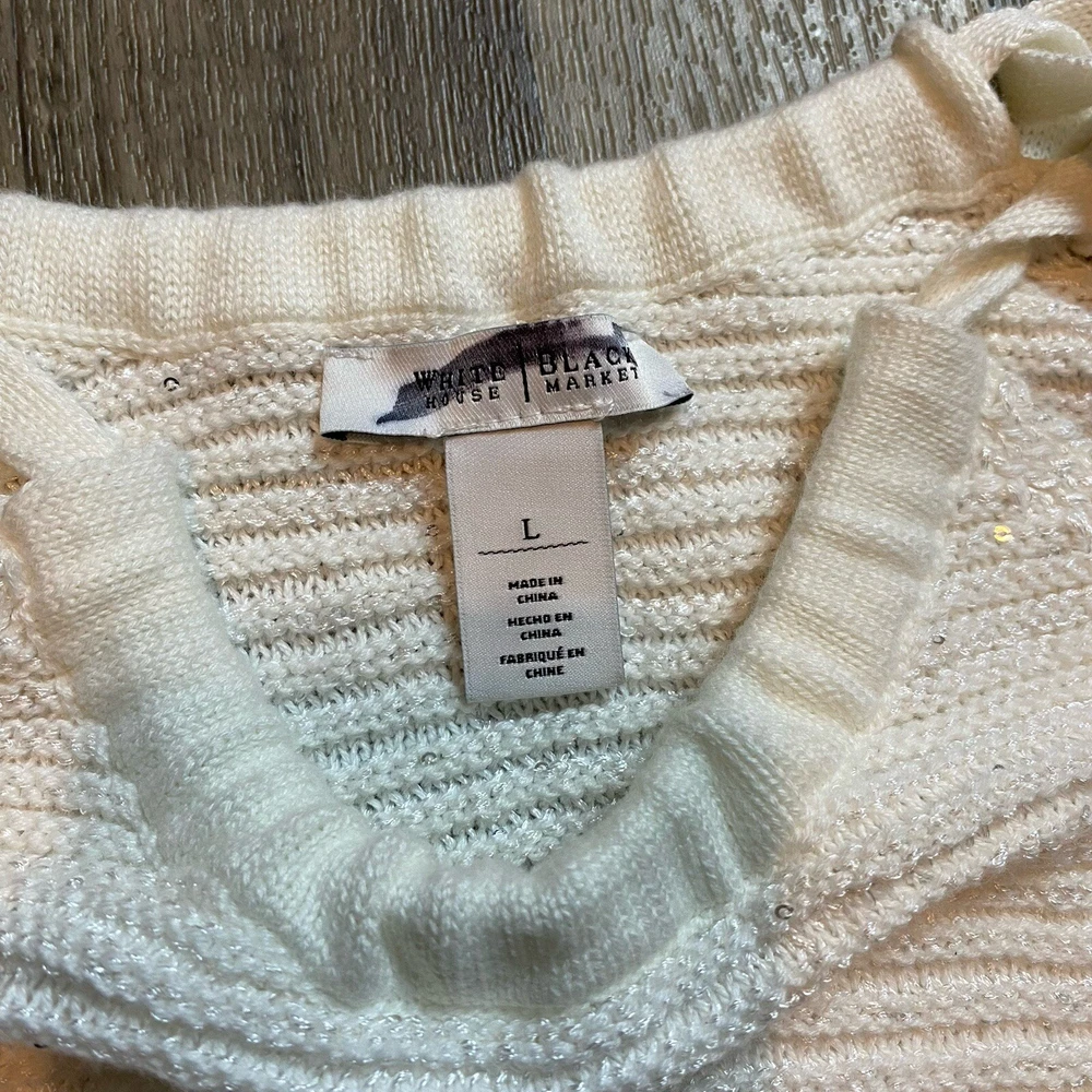 White House Black Market Women’s Size Large Knit Halter Blouse White with subtle sparkly sequins throughout Ties around the neck to the side Polyester cotton rayon blend Excellent Condition Pit to pit: 18 inches Total Length: 23 inches
