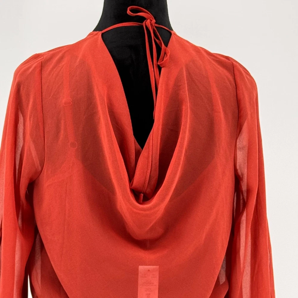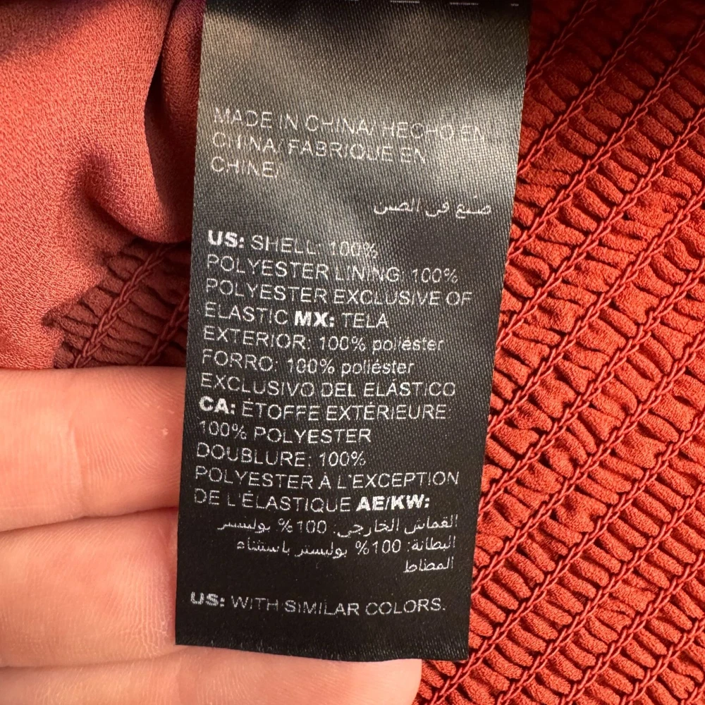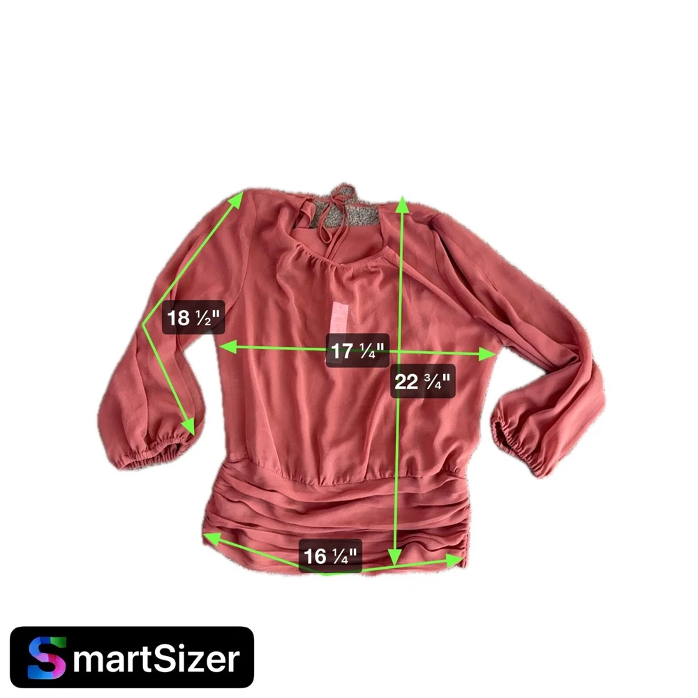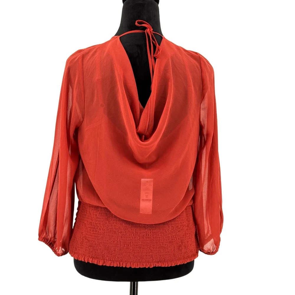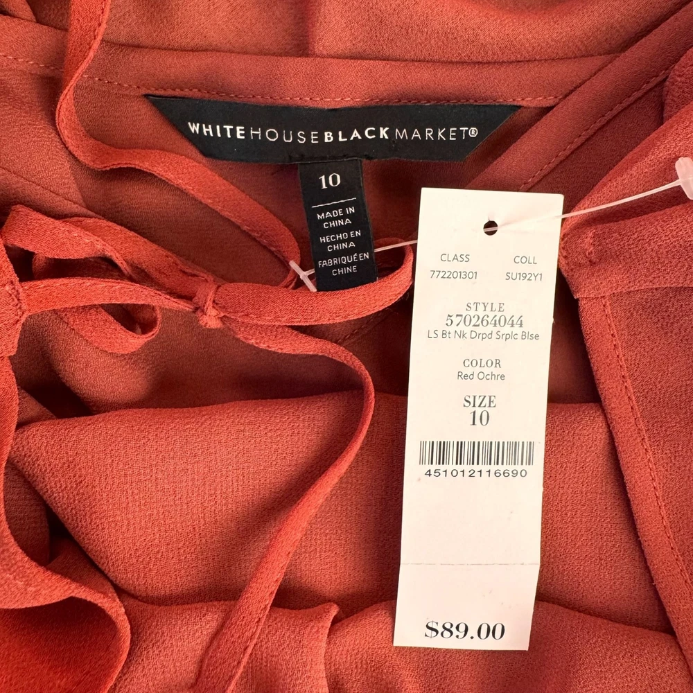 In the land of fashion wonders, this White House Black Market blouse weaves a tale of sophistication with its flowing red ochre hue. The lightweight polyester fabric, combined with the elegant draping details, offers a timeless charm. A wardrobe staple for those who appreciate elegance in simplicity. • Red Ochre Color • 100% Polyester • Long Sleeves • Ruched Waist • Keyhole Back • Round Neckline Bust = 17 1/4 inches, Waist = 16 1/4 inches, Length = 22 3/4 inches, Sleeve Length = 18 1/2 inches.