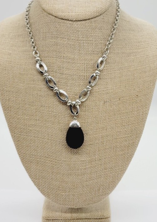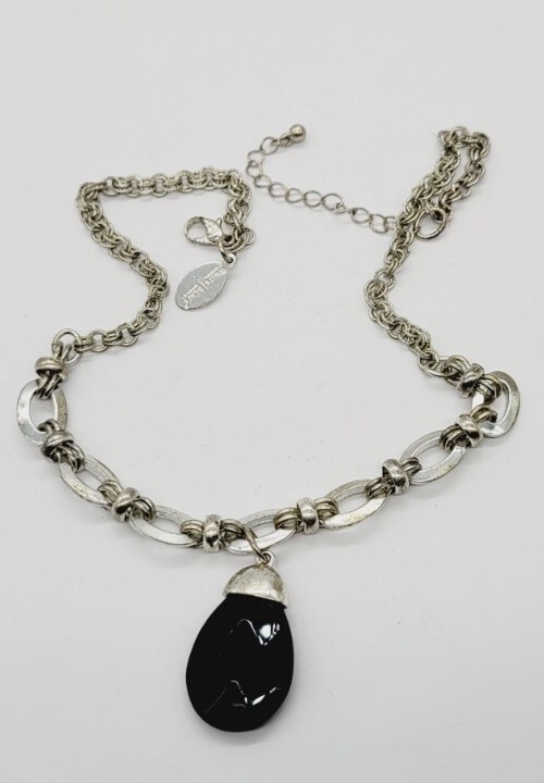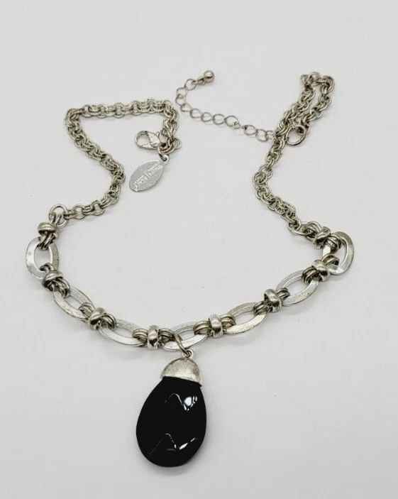 White House Black Market Silver Faux Onyx Medallion Necklace 18 Inches