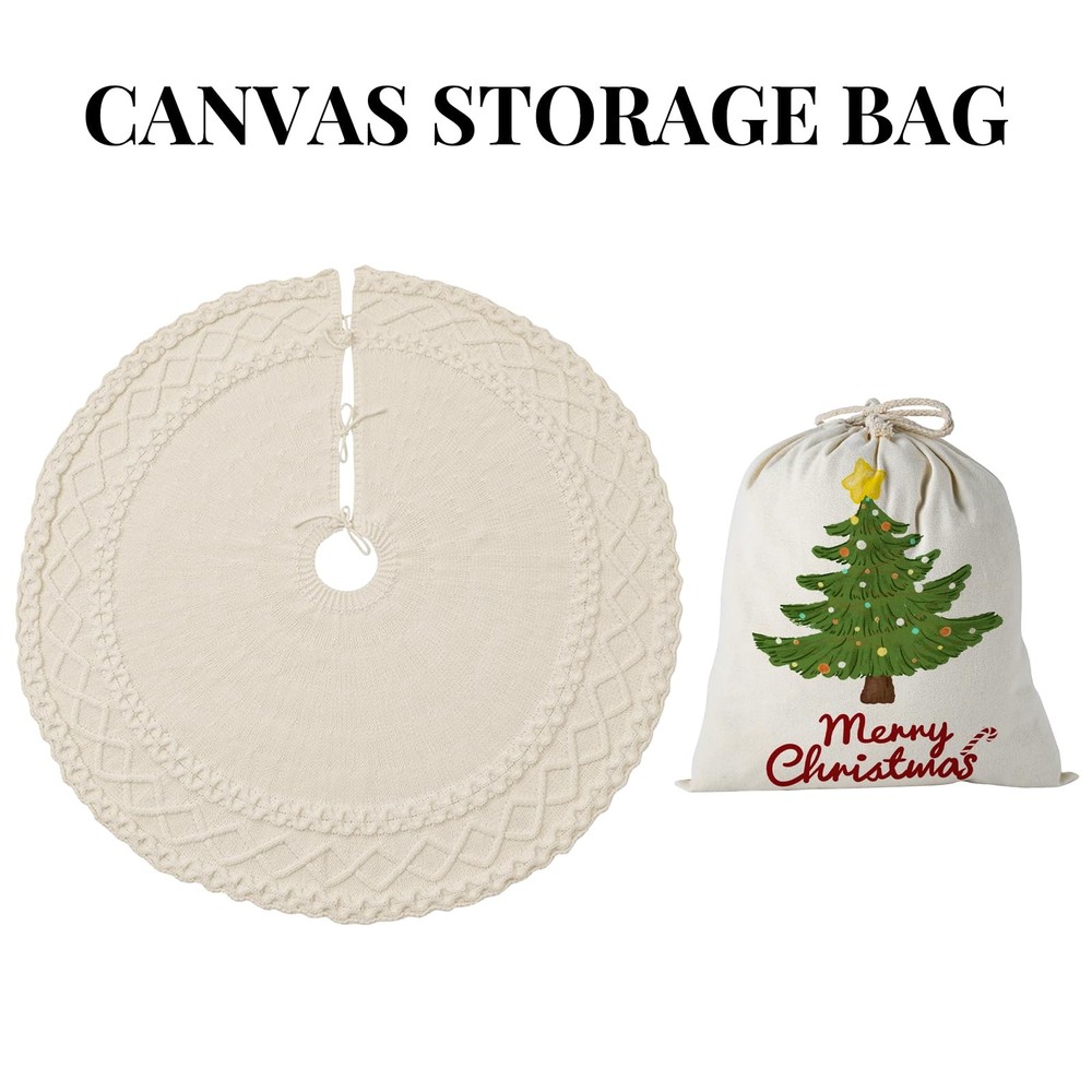 Merry Christmas - Crave that warm, welcoming farmhouse Christmas feel? Our cable knit tree skirt is your answer! Classic cable knit handcrafted Christmas collection, this tree skirt is 48 inches featuring a soft touch and authentic knitting, dress your home décor with warm and cozy vibes. Merry Christmas - Crave that warm, welcoming farmhouse Christmas feel? Our cable knit tree skirt is your answer! Classic cable knit handcrafted Christmas collection, this tree skirt is 48 inches featuring a soft touch and authentic knitting, dress your home décor with warm and cozy vibes. High-Quality Knitted Tree Skirt - Crafted with high-quality knitted heavy yarn, the Christmas tree skirt is thicker and more shaped, more durable against the ground, and not easy to fade. It protects floors from pine needles while creating that cherished, fireside ambiance. The thickened knitting process has a better shape to fit the ground, with the prepared Christmas gifts are placed for decoring your Xmas! Perfect Size - Knitted Christmas Tree Skirt measures about 48 inches in diameter, fits for 5-7 ft trees. Large enough for you to put more gifts you want on it and keep your floors clean. Packaged with a cute storage bag, you can storage it easily for next year use. Elegant Design - The edge crochet process makes this knit tree skirt different from the traditional round Christmas tree skirt, which is much more elegant. Three darling bow ties ensure it stays perfectly placed. Unwrap the magic, smooth out the journey wrinkles, and let it transform your space into a storybook Christmas scene. Xmas Decor & Warm Christmas Gift - Ideal Christmas tree decorations to decorate your Christmas tree, home, living room, bedroom, wedding, garden. Perfect gifts for men, women, family, kids and everyone you love. Bring heartwarming, down-home holiday joy to life!