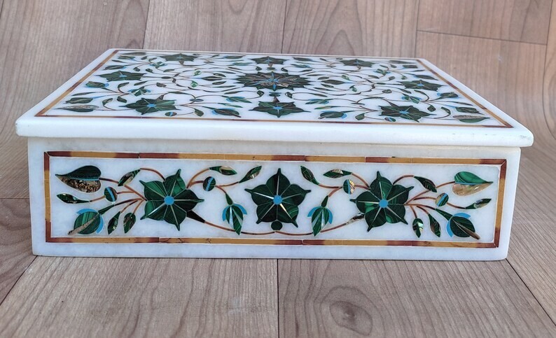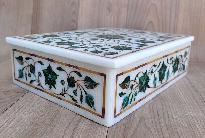 Welcome To Stone-Craft-Creations Shop Description Very unique Art by Indian Artist Marble Jewelry Box Used Material: Marble & Multi Semi Precious Gemstones Inlaid Size: 6"x4"x 2" inch Color: White Shape: Rectangle Pattern: Handmade Room: Bedroom, Dining Room, Hallway, Home Office/Study, Kid’s Bedroom, Kitchen, Laundry/Utility Room, Living Room,Patio, Playroom Packaging: Wood & Foam Export Packing Shipping: Air Can be customize ,Please message your desired size Process of Making Marble Inlay 1. We are inlaying semiprecious stones in three different colors of marble White Marble,Black Marble & green marble. 2. The Marble used to inlay the semiprecious stone comes from city of Makrana, Rajasthan India. 3. First we cut the marble in different shape example Round,Octagonal,rectangle,oval & square shape. 4. After cutting the marble we paint the surface of marble with Hina(red Color) so we can sketch the geometry on the surface of Marble. 5. With the Help Of emery wheel we cut,polish & shape the semiprecious in different forms of flowers,buds,leafs & stems all the cutting of the semiprecious stones are manually cut by the artisans. 6. After cutting the semiprecious stones we assemble them to complete the motif & then the semiprecious stones are placed on the surface of marble so we can trace them on the surface of marble to make the exact size of the cavities once the stones are traced we remove the stones from the surface of marble & then manually we chisels the marble with the diamond chisels & tungsten carbide chisels once the cavities are completed we place the semiprecious stone in the cavities to check the depth of the stones. 7. When we are fully sure that the stone fits well in the cavities we use special kind glue to fix the semiprecious stones into the marble. 8. After completing the inlays into the marble we first rub the surface of marble with sandstone & then we polish the surface of marble with sandpaper which brings the natural shine on the surface of marble & to the semiprecious stone & we use wax polish to make the surface shiny. 9. Most interesting expect of this pietre dure( marble inlay with hard stone) all the designs are made by the artisans are purely an imagination of artist once made they cannot make another one exactly the same it will look similar but will not be the same. 10. This beautiful art is a dying art of Agra,India the artisans those make this beautiful art are the descendants of those families who built the Tajmahal in 17 century Tajmahal is a monument of love & you can easily see the artwork done with the same technique on the walls of the Tajmahal. 11. I Invite you to come to Agra,India & visit the beautiful Tajmahal & you will surely be impressed & we request you give us a chance to show you the true handmade art of Agra by our artisans. 12. When you are purchasing this beautiful handmade Marble inlay art you will always be happy because all the pcs made by our artisans with love,hope & happiness. 13. You will always be enjoying the beautiful handmade marble inlay artwork secondly you will be supporting the local artisans of Agra,India to keep this beautiful dying art Alive. 14. All the purchase benefits the artisans & the buyer as there is no middle men in selling & buying. Inspiration/Story Behind This Product 1. This beautiful inlay art is a dying art of Agra,India the artisans those make this beautiful art are the descendants of those families who built the Tajmahal in 17 century Tajmahal is a monument of love & and one of the seven wonders in the world you can easily see the artwork done with the same technique on the walls of the Tajmahal. Note 1.The marble inlay table is made in Agra, India. 2.The marble inlay table will be delivered by FedEx or DHL free of cost door to door. 3.If there is any local tax,custom duties or Vat will be paid by the buyer at the destination. 4.The parcel is dispatch with proper packing & fully insured covering all kind of risk. 5.This marble table illuminates if the light arrangement is made under the plate. 6.It is an art piece which will be a beauty & the conversation pieces at home. 7.If You Are Looking Something Customize, Let Us Know We Will Make For You As Per Your Design, Size & Shape. 8. This is only Table Top & Base/Leg is not included. If you want stand/leg also, please contact us For Wholesale or corporate Inquiry please contact us. Thank you very much for admiring beautiful handmade marble inlay art. Please recommend your friends & family members to visit our ebay store this art is Dying art of Agra & we need your participation to keep this dying art alive. Thanking you in anticipation for your great support. If you are in Agra please email us we love to show you the process of marble inlay work at our premises