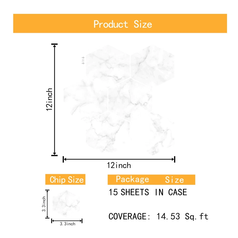 WHITE BACKSPLASH PEEL AND STICK BACKSPLASH TILE FOR KITCHEN WALL 👍 WOULD YOU WANT TO QUICKLY TRANSFORM OR DECORATE YOUR HOME? 👍 ▸White marble hexagon backsplash tiles is extra thick and durable. ▸Peel and stick tile backsplash for kitchen wall is suitable for kitchen, bathroom, laundry, accent wall, stairs, bedroom, DIY decor, living room, etc. 📝 SPECIFICATION 📝 >> Finish: Glossy >> Design: White Marble Hexagon >> Feature: Peel and Stick, Self-adhesive, Waterproof, Oil-proof, Removable, Sticky, Thick, Durable, Repositioned, Easy to Clean, Easy to Use, Bubble-free. >> Application: Suitable for decorating and transforming kitchen, bathroom, floor, countertop, coffee table, vanity, cabinet, built-ins, walls, dresser, drawer, wrapping paper, DIY project, and more. ✂️ INSTALL STEPS ✂️ 1. Firstly, clean the surface to make sure it is smooth flat and dry. Measure the area, leave an extra length before cutting the backsplash tile. 2. Secondly, Peel off the backing little by little while using a soft cloth to smooth the tiles as you go. 3. Finally, use a hairdryer to ""stretch"" the edges and seal them under the countertop overhang. 😀 WARM TIPS 😀 ▸To avoid color difference please buy enough boxes at a time to ensure they come from the same batch. ▸Product pictures may have slight differences in color from the actual product as monitors vary. ▸Please ensure that the covered surface is smooth and clean. Textured surface will affect the adhesion of the peel and stick backsplash tile. ▸Please contact us through Amazon if you are unsatisfied with the kitchen backsplash peel and stick for any reason, and we will solve it in the first time. 🐑 -【Size】:The size of each backsplash tile peel and stick is 12" wide by 12" long. 1 box of 15pcs hexagon peel and stick backsplash covers about 14.53 sq.ft. Strong coverage and a variety of styles to choose from. 🐑 -【Features】:Kitchen backsplash tiles peel and stick is durable, soft, easy to cut, waterproof, oilproof, and removable. Easy to wipe to remove stains and protect the kitchen, laundry, bathroom back splashes. 🐑 -【Application】:White marble kitchen backsplash is great for kitchen, bathroom, laundry room, stair, basement, bedroom, living room, garage, RV, fireplace, camper, and more. Both renter and homeowner friendly. 🐑 -【Easy to Use】:Peel and stick tile backsplash is nice for new users and super easy to operate! Just peel the back film and stick it to the surface you want. no grout, no glue, and removable. Easy to cut with sharp utility knife or scissors. 🐑 -【Customer Service】:If you are not satisfied with peel and stick backsplash tiles or have any other questions, please feel free to contact us and we will try our best to help.