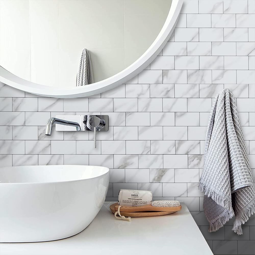 1. These marble-look peel-and-stick tiles are a game-changer for quick home upgrades! The thick PVC material feels sturdy, and the adhesive backing makes installation a breeze—no grout or special tools needed. They resist scratches, heat, and splashes, perfect for kitchens and bathrooms. Cleaning is effortless—just wipe with a damp cloth. Loved how easy they were to cut and position. The sleek white design instantly elevates any space. Highly recommend for a budget-friendly, stylish DIY project!