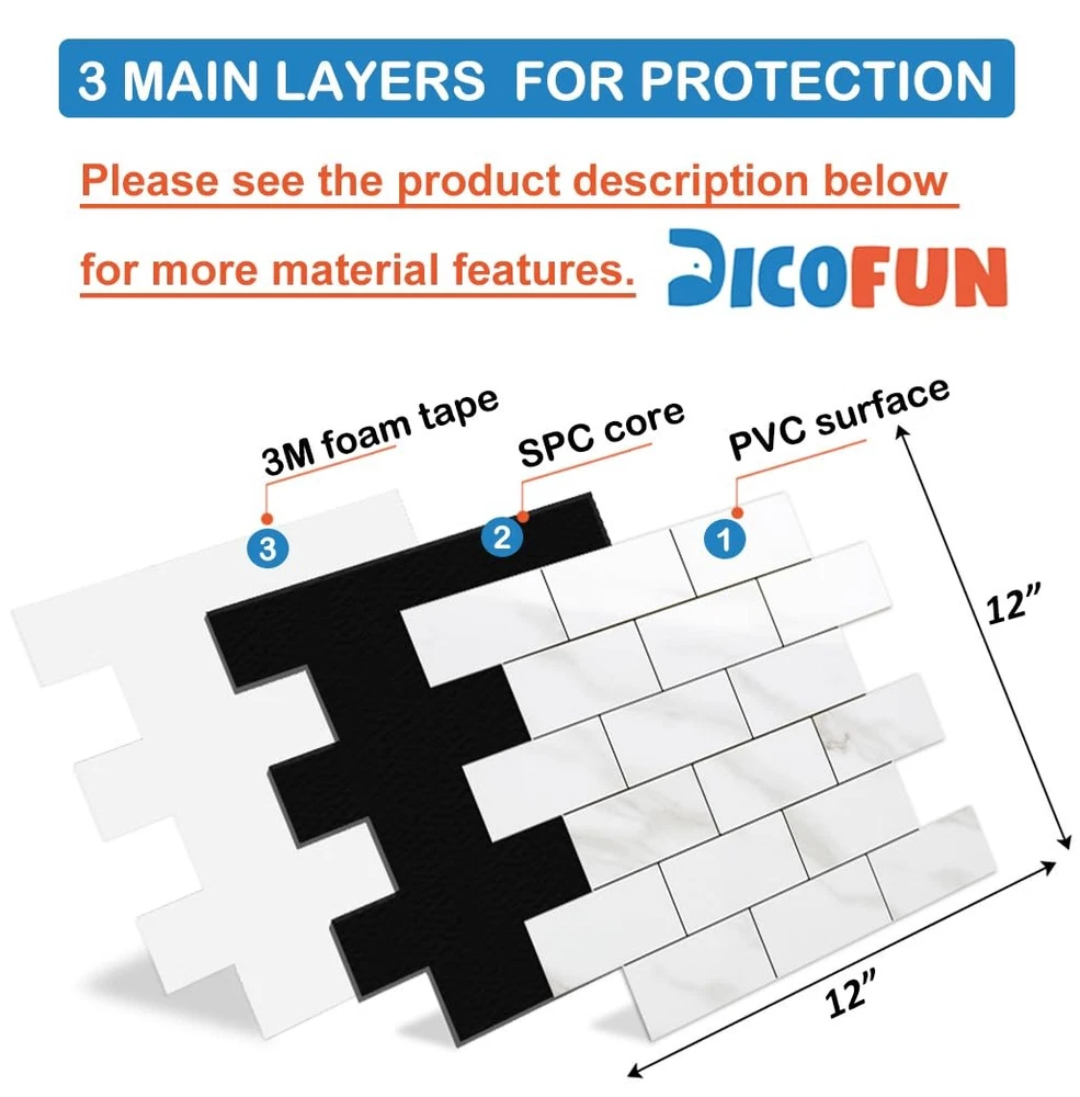 Form Factor: Subway Tiles Weight: 5.71 Pounds UPC: Does not apply Size: 12"X12"X0.12" Item Shape: Subway Installation Type: Peel And Stick Unit Count: 10.0 Edge Style: Square Edge Coverage: 9.6 Square Feet Package Dimensions LxWxH: 13.74x13.54x1.65 Inches Style: Modern Finish Type: Polished Pattern: Ceramic Recommended Uses For Product: Bathroom, Kitchen Brand: Dicofun Type: Does not apply Material: Polyvinyl Chloride (Pvc) gtin13: Does not apply Item Package Quantity: 10 Color: Polished White Marble