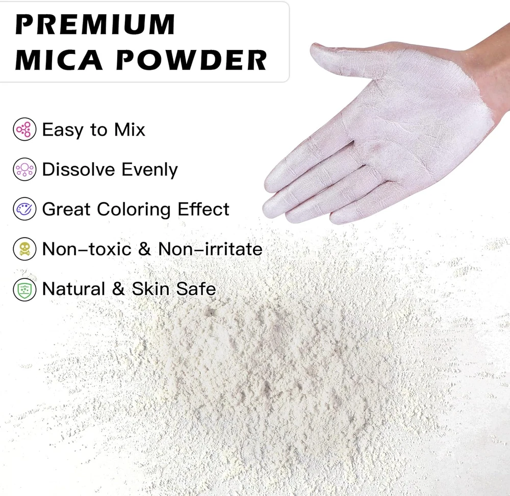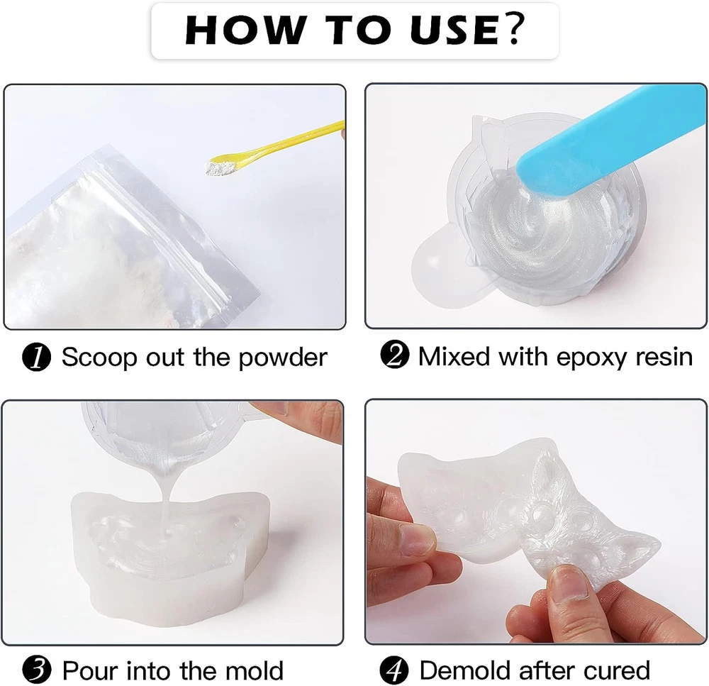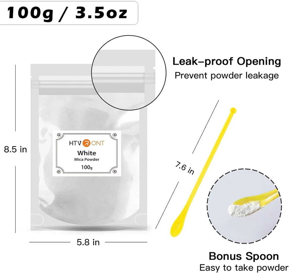 3.5 OZ LARGE CAPACITY WHITE MICA POWDER: HTVRONT offer you 3.5 oz/100g large capacity shiny mica pigment powder, which is huge enough for almost any size project and can meet your long-term use needs. Classic white epoxy pigment makes your arts more textured. Come to join us and share your creative handicrafts made with HTVRONT mica powder pigment Easy to Mix: Our mica powder for epoxy resin is will not tarnish or fade. Mica pigment powder for epoxy resin are rich, uniform gloss and evenly structured in color, just a little bit mica powder pigment goes a long way, very easy to mix and dissolve without clumps. Different color mica powders are blend well together to create new colors and offer endless-possibility for your craft projects RESEALABLE BAG AND SPOON: White mica powder comes in a resealable ziplock bag, which prevent pigment powder leakage during transportation, also makes it easier to open, pour and close when use. Resealable bag keeps water, moisture and dust out, keep the resin mica powder organized and clean. We also offer you a free spoon to help you take out shimmer mica powder easily. What's more, Each resin pigment powder has a clear label to help you find the color quickly USE WIDELY: Epoxy resin pigment powder is great for epoxy resin art, tumbler, coaster, painting, soap, bath bomb, candle, acrylics, cosmetic, nail polish and so on. These resin pigment powder can be mixed with just about any medium and applied to most surfaces to create sparkly shiny finish, which makes your handicrafts more colorful shimmer and attractive WONDERFUL GIFT: This resin powder pigment is a great choice for those who love to create customized works. Great gift for wedding, Halloween, Christmas, Easter, birthday, gift for women, girls, family, couple, wife or any event Product Description
