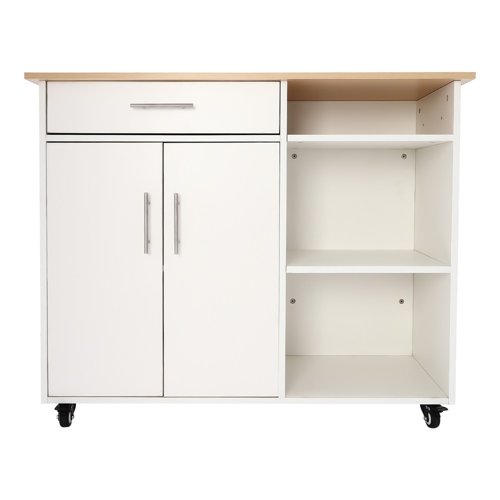 WELCOME Description If you want to keep your kitchen organized or increase your kitchen storage space, then please take a look at this kitchen island cart from us. Our product is made of high-quality materials, durable, and structurally stable. Open compartments, large capacity cabinets and drawers increase your storage space. The contemporary exterior design makes it blend in with the most modern home decor. Four silent universal wheels provide you with the convenience to move this product. It will be an ideal assistant in your kitchen. Key Features Made to Last: Made of high-quality ecological board and hardware, this product is sturdy and wear-resistant , not easy to corrode and deform, ensuring a long service life. Multi-functional: The kitchen island cart makes the kitchen more than just a place to cook, but also a space for relaxation and emotional interaction. It's also super functional: countertops, storage cabinets, a dining area, and an additional side table for drinks and supplies during gatherings. Large Capacity: One drawer, three open compartments and a two-story cabinet provide ample storage space, where you can put small appliances, pots and pans, etc. for storage. Easy to Move: The 4 silent universal wheels make it easy to move it to where you need it. Two of the wheels with brakes can hold it in place. Strong Load-bearing Capacity: Each layer of the compartment can bear up to 55.12 lbs, so you don't need to worry about even placing heavy objects such as household appliances. Modern Appearance: The simple rectangular construction and classic white color scheme allow it to blend in with most modern home decor styles. Excellent Storage Assistant: The combination of drawers, open compartments, and cabinets allows you to categorize and organize napkins, utensils, small appliances, and other various kitchen items to keep your kitchen neat and organized. Effortless Cleaning: It has a smooth surface and an open structure, so you only need to wipe the dust or residue with a towel. Ideal Gift: With good performance and a modern appearance, it can be used as an ideal housewarming gift for parents, friends, and lovers so that they can also enjoy a more exquisite life. Details Practical Handles: The handles on the cabinet doors and the drawer are easy for you to open and close, providing easy access to your items. Towel Rack: It not only provides you with space to store your towels but also serves as a handle to easily move your cart. Application This product is suitable for home kitchens, restaurants, hotels, etc. Specification Material: Ecological Boards, Hardware Color: White Style: Modern Assembly Required: Yes Mounting Type: Free Standing Number of Wheels: 4 (2 with Brakes) First Compartment Height: 15cm/6in Second and Third Compartment Height: 31cm/12.2in Table Size: 106.68*45.72cm/42*18in Cabinet Door Size: 63.5*30.48cm/25*12in Drawer External Size: 61*28*15cm/24*11*6in Drawer Internal Size: 48*28*8cm/19*11*3.2in Product Height: 92.46cm/36.4in Package Size: 110*48*16cm/43.31*18.9*6.3in Each Layer Load Capacity: 25kg/55.12lbs Gross Weight: 16kg/35.27lbs Net Weight: 15kg/33.07lbs Package Included 1* Kitchen Island Cart 4* Wheels Other Accessories for Assembly Notes Please confirm whether the size of our product meets your requirements before you buy it. Please allow the slight color difference caused by the shooting light and 1-3cm error due to manual measurement, and make sure you do not mind before ordering. Payment Delivery details Terms of sales About us Contact us Payment We accept ebay payment 。 Fees such as import duties, taxes are not included in the item price or shipping costs. These charges are the buyer's responsibility. Delivery details Shipping: 2-9 working days to: USA Terms of sales We maintain high standards of excellence and strive for hundred percent customer satisfaction. Feedback is very important to us. We hope that you contact us immediately before you give neutral or negative feedback, so that we can address your concerns. It is impossible to address issues if we do not know about them! About us Your satis faction is our ultimate goal. We work hard to earn your trust and future business. Our certified technicians have tested each item before shipping. The unit comes with 1 year limited warranty on all manufacturing defects. a) If you receive a defective item, you may return it or ask for a discount. Please contact us within 14 days after you receive the package. b) What you returned must be intact and in its original packaging as re? u. Customer is responsible for shipping costs of the returned item. c) We will cover the cost of shipping back t with the shipping rate indicated in the registration page. We will send you a new unit or refund the full payment you paid. Thank you. Contact us Business Hour Business Hour: Monday To Friday: 8:30 AM to 5:00 PM (Beijing China time) Due to time zones, our reply to your questions may not be immediately. But within above working time, we will reply your email within 24 hours. If it's non-workdays, please kindly be patient and wait till Monday. Please contact us with ebay message. Please feel free to contact us if you have any questions. Monday To Friday: 8:30 AM to 5:00 PM (Beijing China time) Due to time zones, our reply to your questions may not be immediately. But within above working time, we will reply your email within 24 hours. If it's non-workdays, please kindly be patient and wait till Monday. Please contact us with ebay message. Please feel free to contact us if you have any questions.