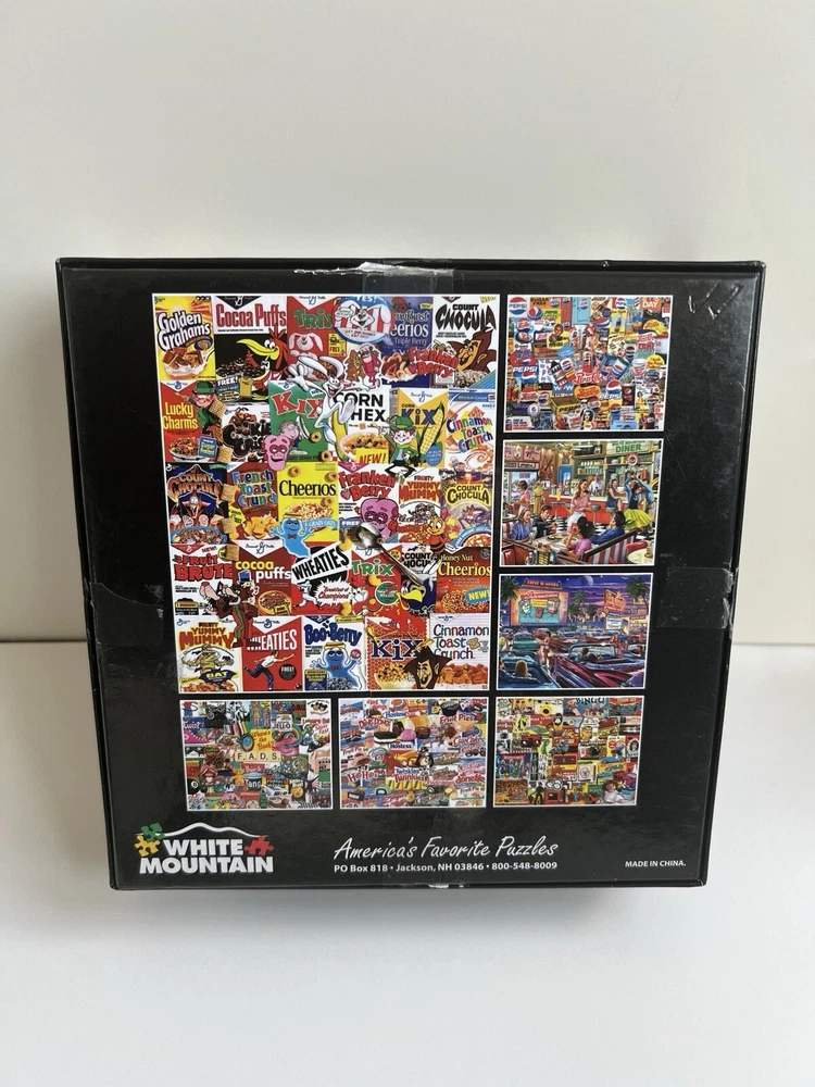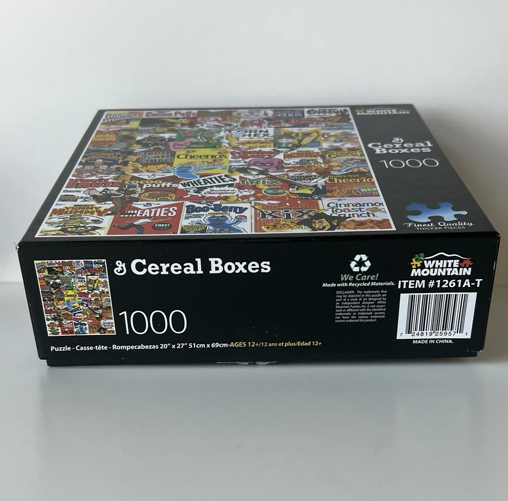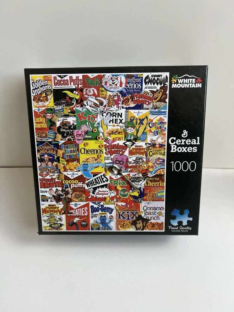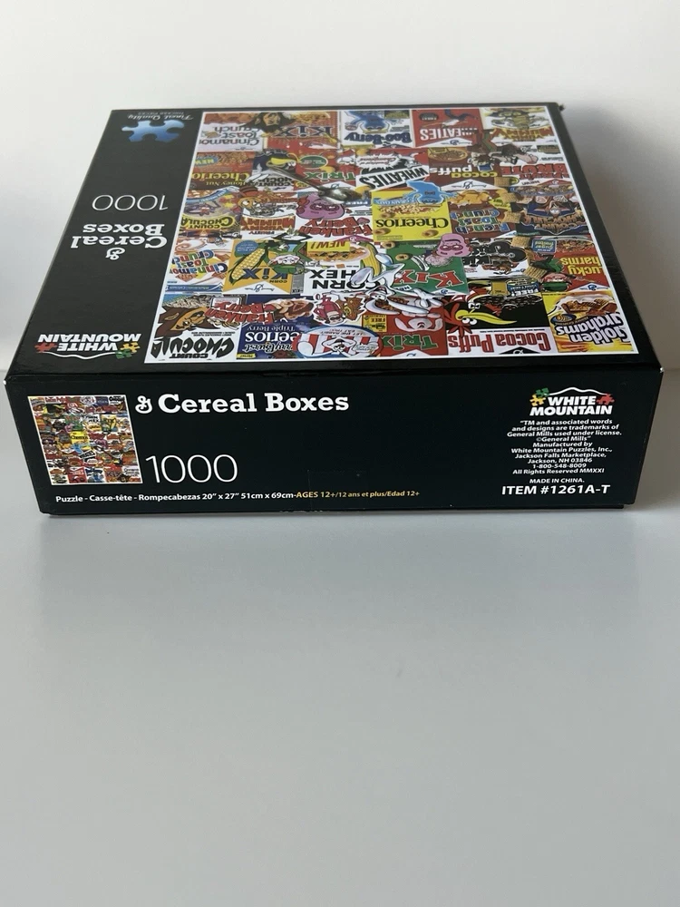 The White Mountain General Mills Cereal Boxes puzzle features 1000 thicker pieces showcasing vintage cereal boxes. Item # 1261A-T Puzzle Size: 20” x 27” Pieces are put in ziplock bag. Counted to ensure complete puzzle. Smoke free, pet free home.