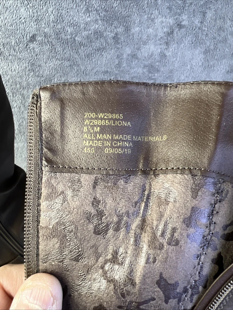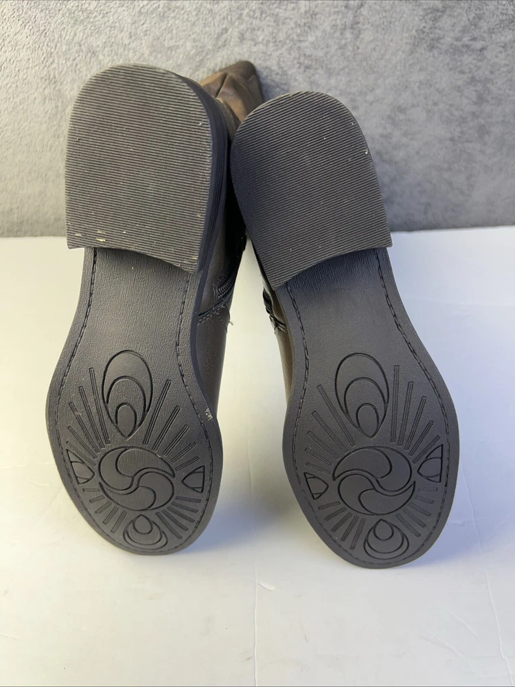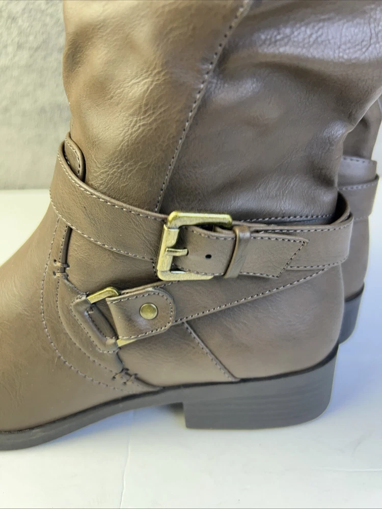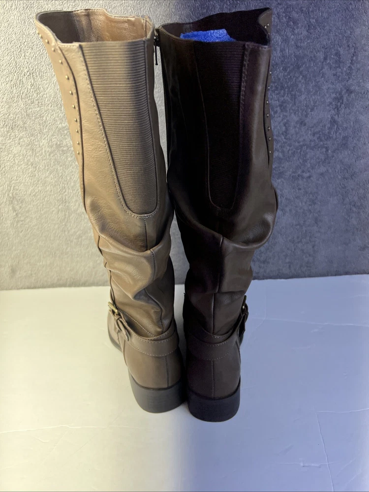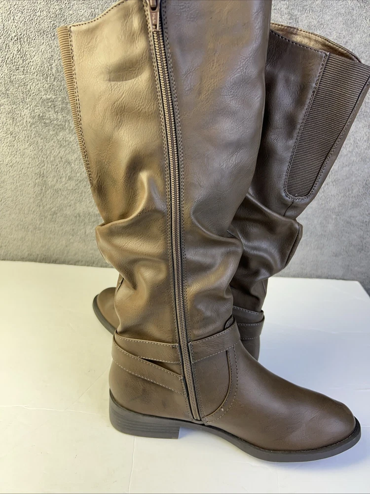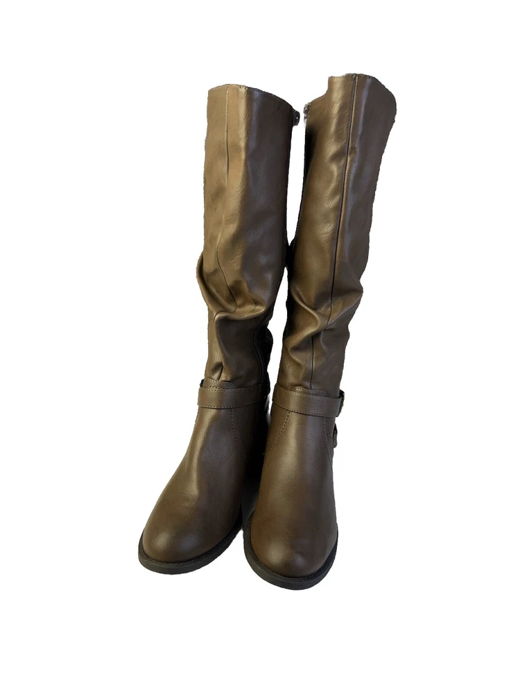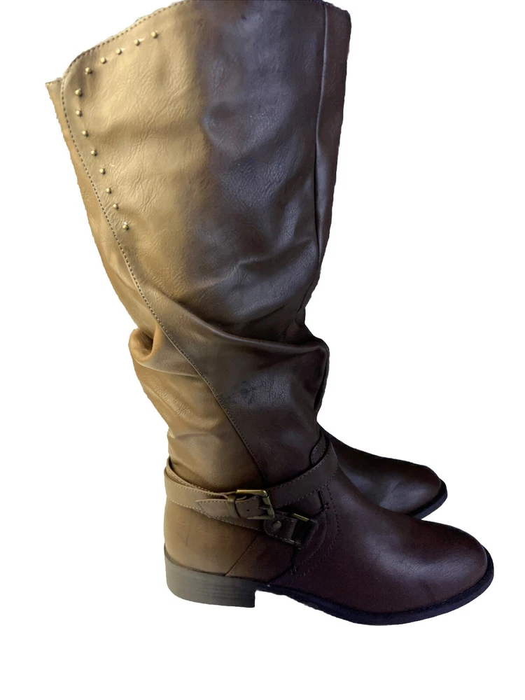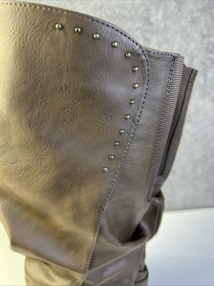 The White Mountain Leto Brown Slouch Riding Boot is a stylish and versatile footwear option for women in size 8.5 (US) or 6.5 (UK). With an almond toe shape and mid heel height of 2 inches, these boots feature a ruffle, studded accents, and a zipper closure for added flair. Made of leather with a fabric lining, they offer comfort and a fashionable look suitable for travel, casual outings, workwear, or business attire. The knee-high design and equestrian theme make them a great choice for all seasons.