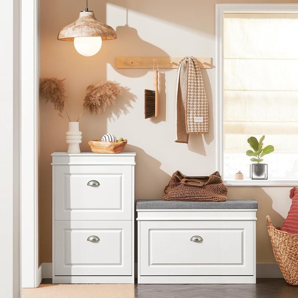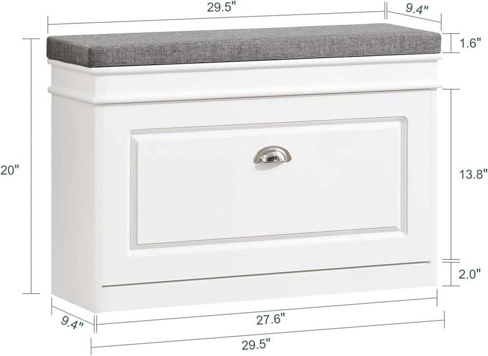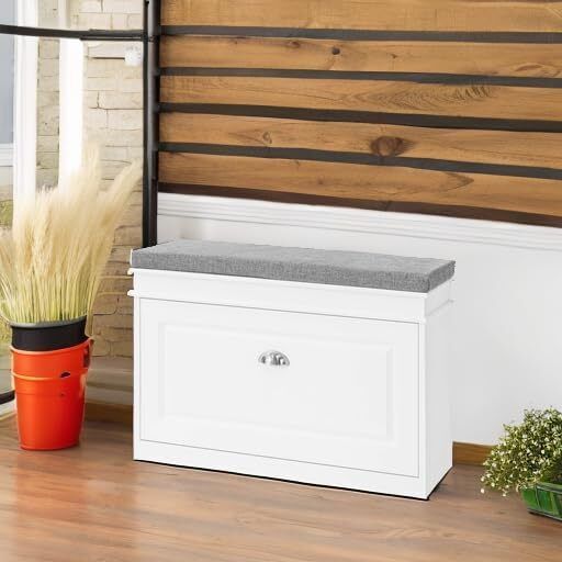 Product Dimensions 40"D x 30"W x 40"H Color White Size 1 Drawer (L) Furniture Finish Grey,White Seat Height 51 Centimeters Material Engineered Wood Frame Material Engineered Wood Style 1-Drawer Item Weight 13 Kilograms About this item [Entryway Bench with Shoe Storage]: This white hidden shoe bench with 1 flip drawer shoe cabinet and removable seat cushion. Crafted for both elegance and practicality, this storage bench provides a stylish solution for organizing your home. [Flip Drawers Shoe Shoe Storage Bench]: Featuring with 1 flip drawers, the shoe rack bench adopts a space-saving flip drawer design, which is easy to open and close. The shelf in each drawer is removable to meet your different shoes storage needs. Compared with ordinary shoe bench, this narrow shoe bench can put shoes more elegantly in the flip shoe cabinet. [Padded Cushion Seat]: The thick soft cloth cushion with fillings provides comfort and convenience for the storage bench. The cushion is covered by breathable linen fabric and filled with soft foam. Enables you to sit comfortably on the shoe cabinet bench to change shoes instead of squatting, and take a short break while taking off your shoes when back home after a busy day. [Sturdy & Durable]: Storage bench is crafted of high-quality MDF, the boards have thickness to keep the bench damaged. It boasts excellent waterproof and dust-proof features, ensuring durability over time. Product Dimensions 40"D x 30"W x 40"H Color White Size 1 Drawer (L) Furniture Finish Grey,White Seat Height 51 Centimeters Brand Haotian Leg Style Straight Product Care Instructions Wipe with Damp Cloth Maximum Weight Recommendation 3.3E+2 Pounds Seating Capacity 2 Item Weight 28.6 pounds