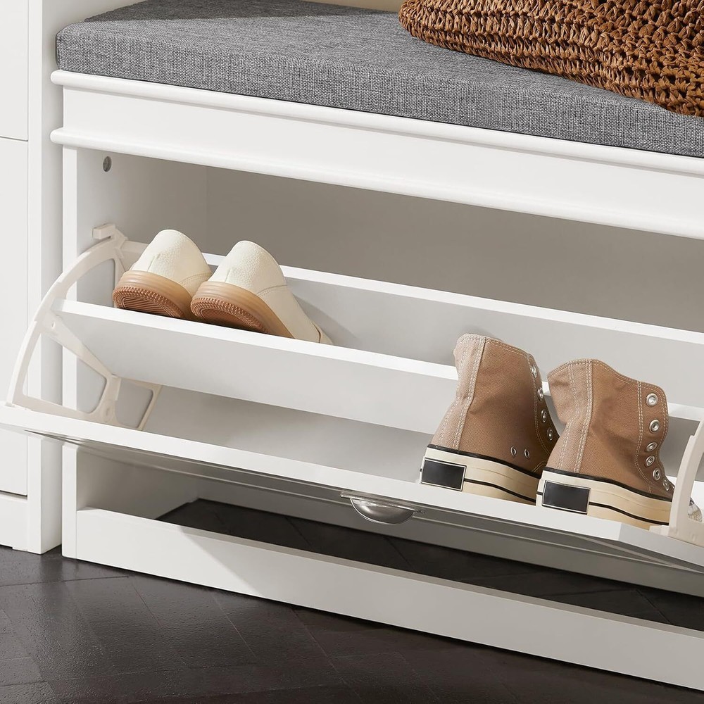 White Narrow Shoe Storage Bench with Cushion for Entryway