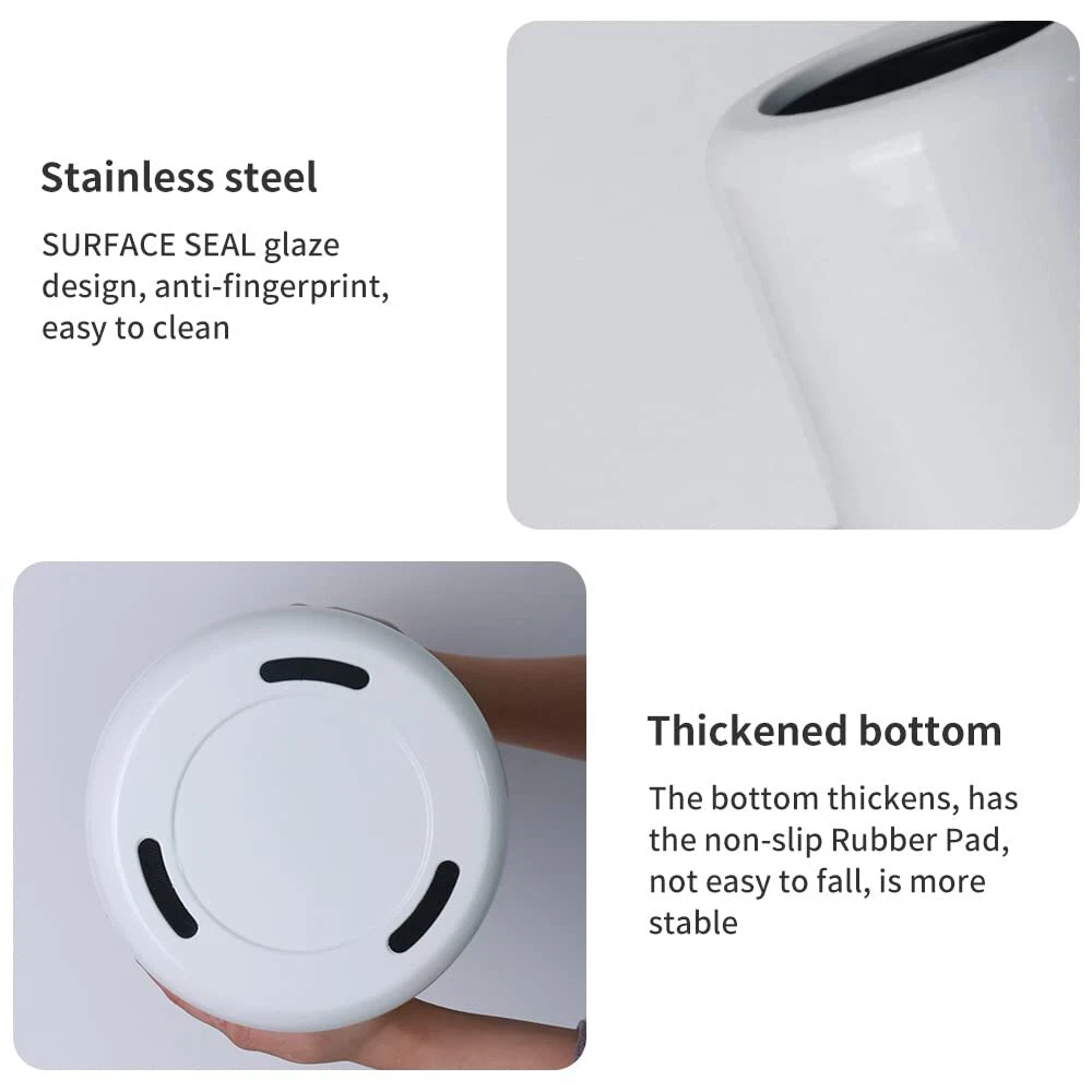 Product Description White Open Top Trash Can,10L/2.6Gal, Wastebasket Bin,Garbage Can For Bathroom,Living Room,Office,Kitchen,Bedroom,Hotel (White) 【 Unique Shape】---Artistic Design, Integrated Into Life, The Round Base And The Barrel Are Connected Together, A Trash Can Like A Handicraft, Adding A Good Enjoyment To Your Home Life 【 Waterproof And Rust-Proof】---The Outer Cylinder Is Made Of High-Strength Thickened Metal And The Inner Cylinder Is Made Of Environmentally Friendly Plastic Material, Which Is Waterproof And Rust-Proof 【Rich Colors】 ----We Can Provide Gold, Black, White, Rose Gold And Other Colors, Which Can Be Matched According To The Decoration Style, Suitable For Bathrooms, Living Rooms, Bedrooms, Hotels, Shops And Other Indoor Occasions 【 Size】: Diameter*Height 8.4*13.5In Weight 1.8Kg 1 Roll Of Drawstring Garbage Bag For Each Bucket 【Hidden Garbage Bgas】:Dual Compartment Design,Outer Cylinder Over Inner Cylinder,Garbage Bags Are Waterproof And Rust Proof:Both The Inner And Outer Bins Are Waterproof And Durable. About Us We are a reputable seller with many years of experience selling on eBay. Our goal is to provide high-quality products and excellent customer service. Shipping Items will be shipped within 1-3 business days when we received payment. (Orders are not processed on weekends & holidays) Tracking information will be sent once item is shipped. Delivery time depends on destination and other factors Item is shipped to ebay address. Leaving correct address can minimize delay. For international shipping and shipping to Guam, Hawaii and Alaska, Please contact us before placing the order. International buyers please note: Import duties, taxes and charges are not included in the item price or shipping charges. These charges are buyer’s responsibility. We will try our best to reduce the risk of the custom duties. Local pick-up is unavailable at the moment. Contact Us We reply any email messages within 1 business / working days(off-duty at weekend). If you do not get a response from us, then please check your junk or spam mailbox. Our Business hours: Mon-Fri 9:00-18:00, UTC/GMT +8 hours. Please contact us either by clicking "contact seller" in the "purchase history" section or simply click "ask a question" at the bottom of this page. If you are unsatisfied with our item or service, please contact us before leaving any feedback. We are committed to resolve all issues in a friendly and satisfactory manner.