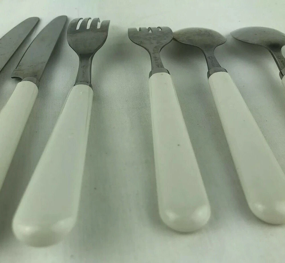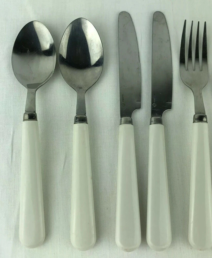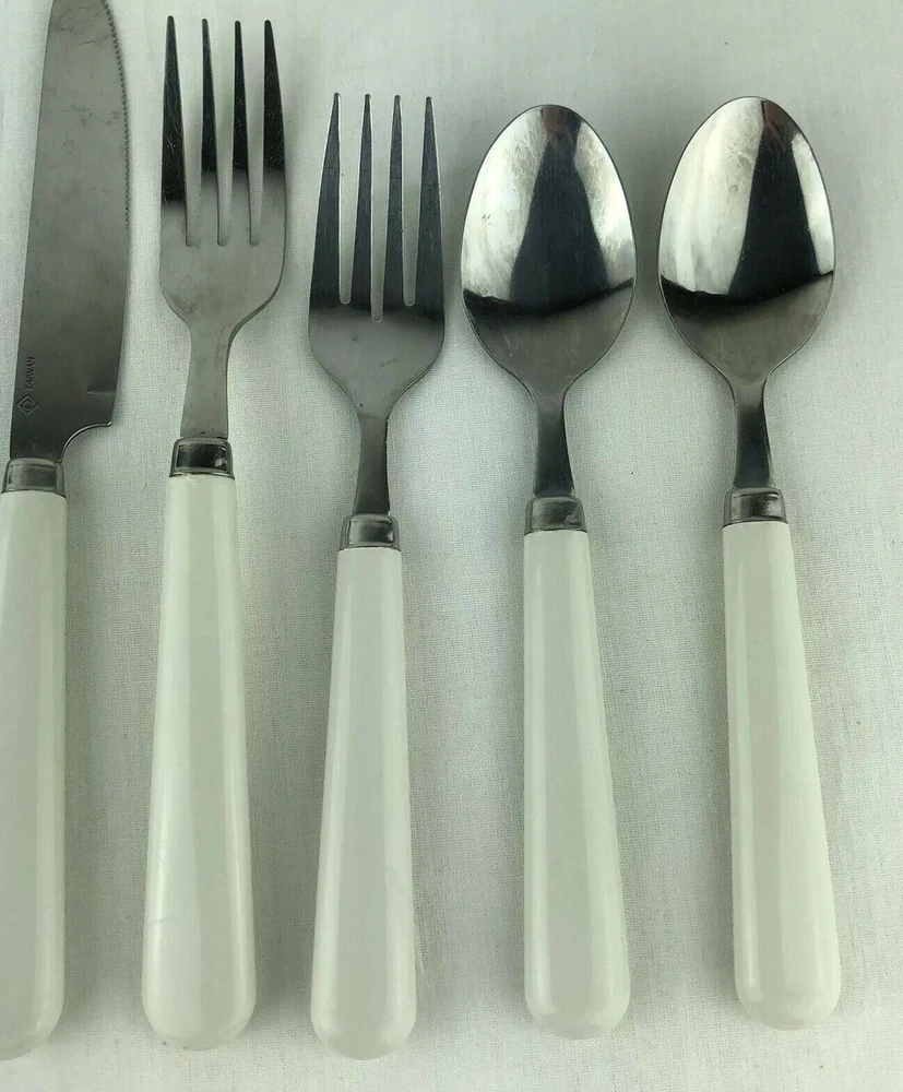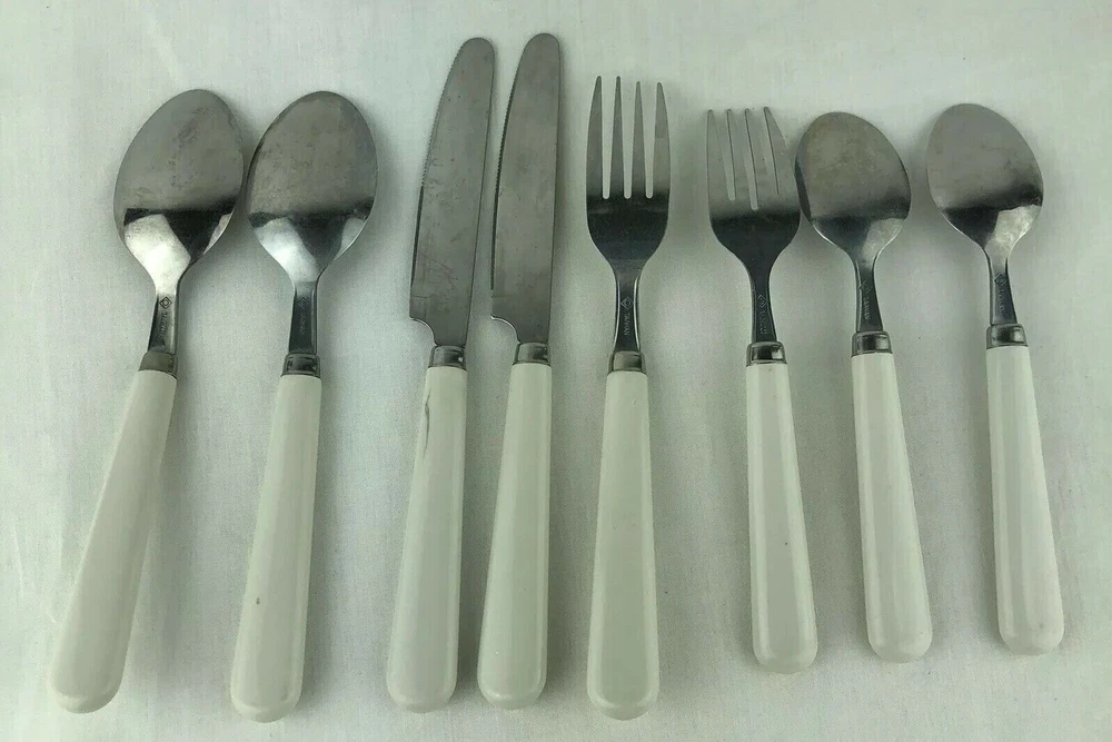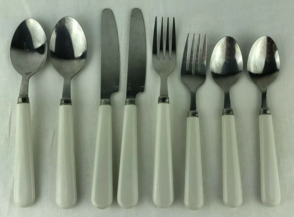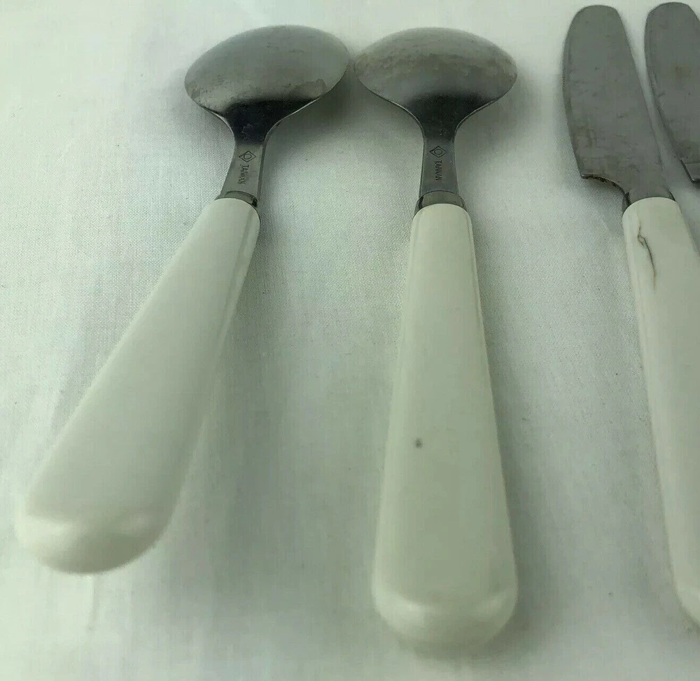 8 Piece Set. Set includes: 1 dinner fork, 1 salad fork, 2 tablespoons, 2 teaspoons and 2 dinner knives. Marked: Taiwan. Please see pictures for details as this is part of my description.