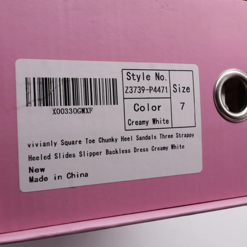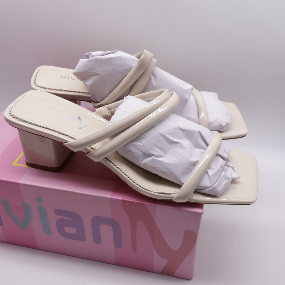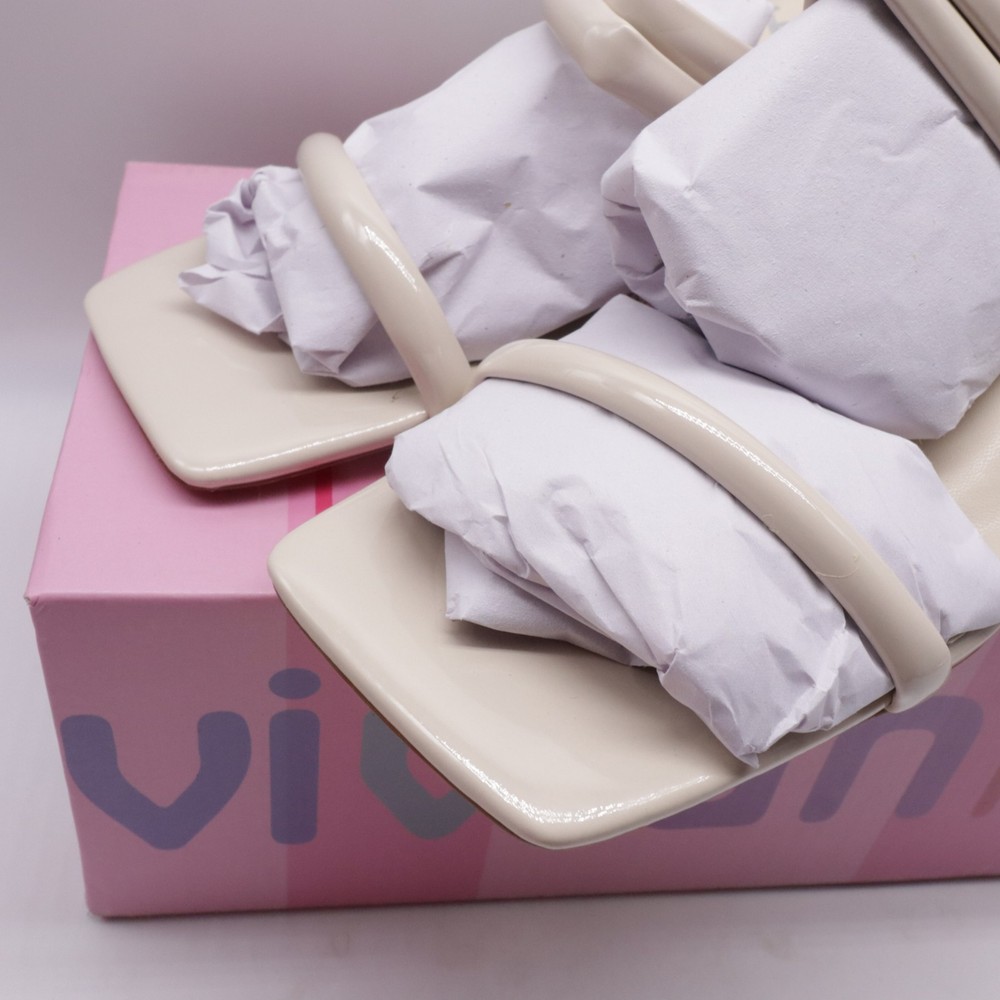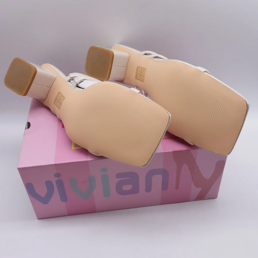 These ivory white square toe strappy chunky heel sandals are designed for women in size 7. They feature a slip-on style with a mid-height block heel for comfortable wear. The sandals are made of faux leather with a strappy design, perfect for adding a stylish touch to any outfit.