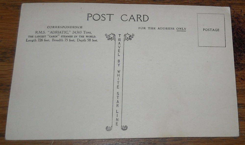WHITE STAR LINE TWIN SCREW RMS ADRIATIC Vintage Postcard g ood, UNpostmarked condition. I have many other postcards listed and will be glad to combine to save on shipping. Please contact me before you pay and I will combine.