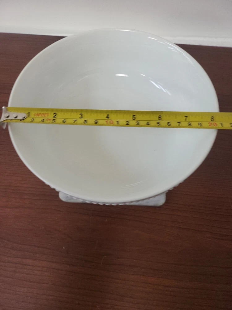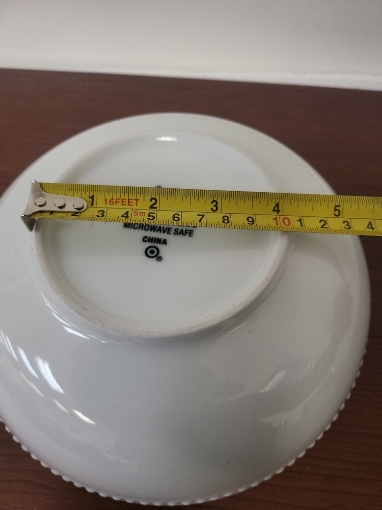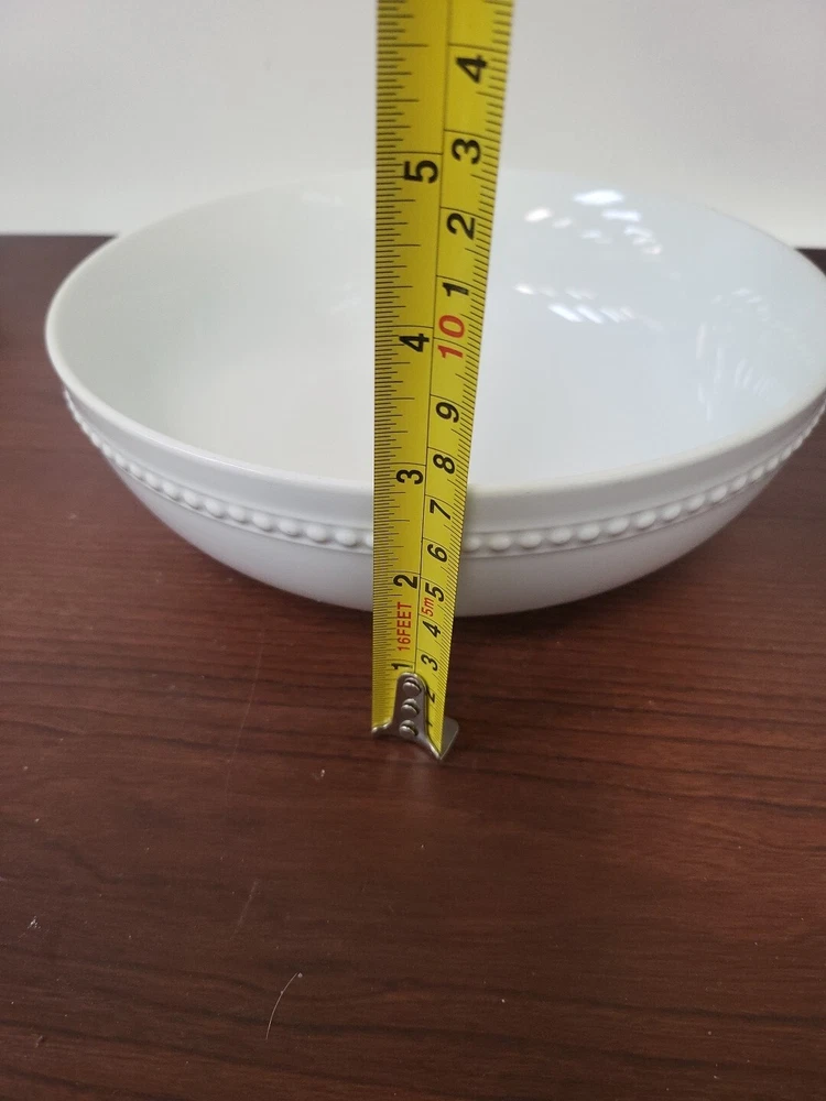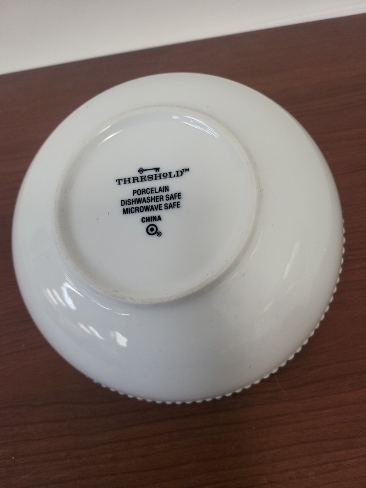This is a White Beaded Cereal Bowl from the brand Threshold. It is made of porcelain with a glossy finish and features a decorative design. The bowl is round in shape, measures 2.75 inches in height and 8.25 inches in width, and has a capacity of 40 oz. It is microwave and dishwasher safe, suitable for all occasions, and is an original piece of art pottery from the 21st Century.
