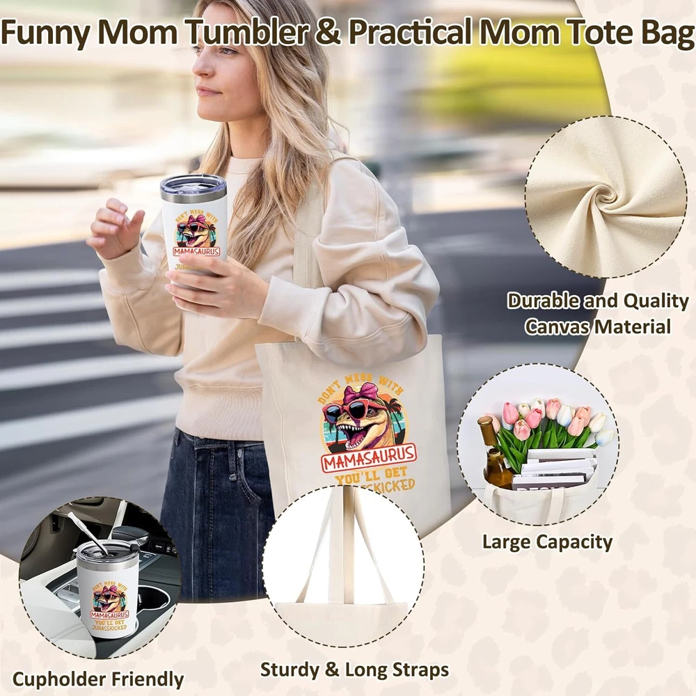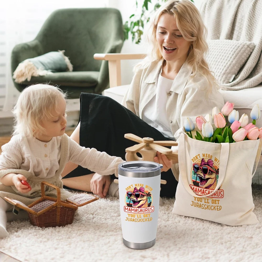 Mom Christmas Gifts, Best Mamasaurus Tumbler Gift, Funny Christmas Gifts for Mom Wife from Daughter Son, Unique Popular Christmas Presents Gifts Ideas for Wife Women(20Oz, White) - Mother's Day, New Year, Christmas, Holiday, Birthday, Valentine's Day 【Best Happy Mother's Day Gift Set】: Show love with our " Mamasaurus" gift set. This Containing ① 1* exquisite gift box ② 1* Mamasaurus tumbler ③ 1* big capacity tote bag ④2* lids & 2* straws ⑤1* straw brush &1* tumbler brush. Skillfully packaged, a whimsical yet loving gift for your spectacular mom. 【Unique Gifts Ideas for Mom】: Our wearing "PINK SUNGLASSES" Mamasaurus and nutrition facts label design celebrates a mom's love, care, and dedication! Perfect appreciation gifts for your mom, or your wife, sister, friends, daughter who are outstanding mothers! 【Chic & Sturdy Mother's Tote Bag】: Measuring 14 x 13.4 inches with an 8.8-inch handle for a comfortable grip, our durable tote is decorated with lively graphics and is a breeze to maintain. It's the quintessential companion for a mother's life. 【18/8 Stainless Steel & Superior Insulation】: This 20oz tumbler, crafted from durable 18/8 stainless steel, features double-wall vacuum insulation, keeping drinks hot for 6 hours or cold for 10 hours, perfect for any occasion or location.