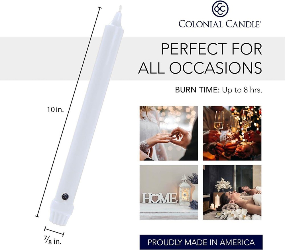 Unscented Taper Candle, Classic Collection, White, 10 In, Pack of 12 - Up to 8 Made from the highest quality wax Sold as "Colonial Candle 10-Inch Classic Tapers, White, 12 Count (Pack of 1)" i.e. "Box of 12 Candle" Keep wick(s) trimmed to 1/4" at all times Never leave burning candles unattended 1.25"W x 10"H Unscented