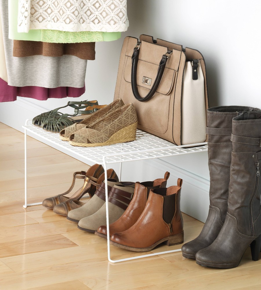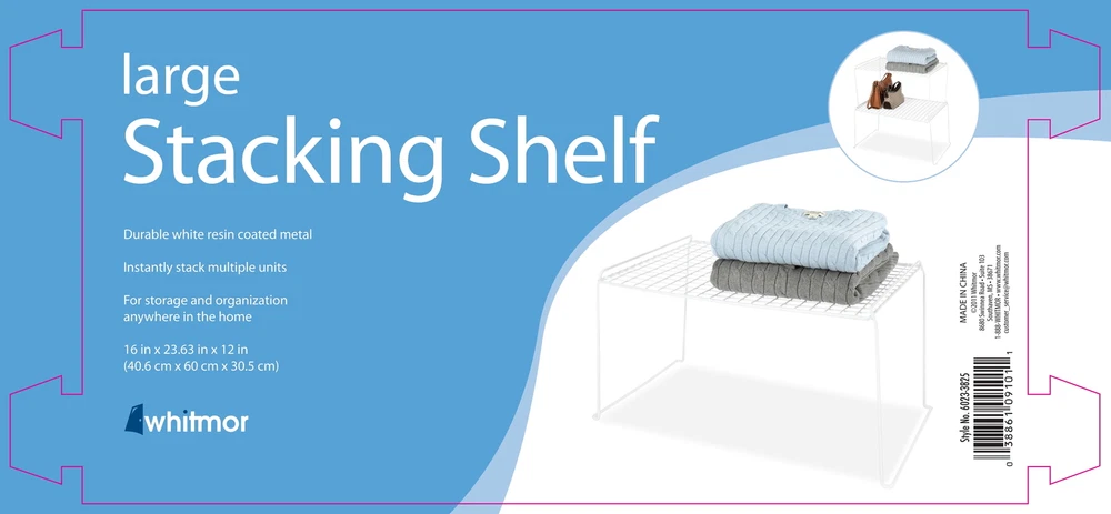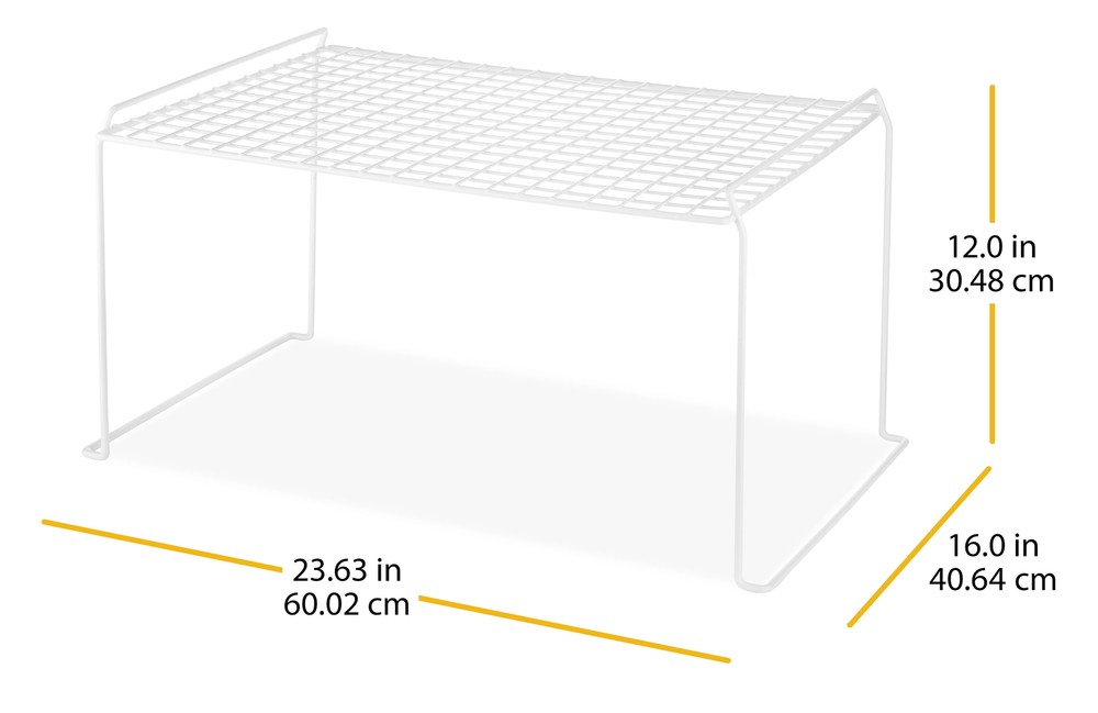 Whitmor's Large Freestanding Stacking Shelf adds a clean, white wire storage shelf to any medium-standing space. This item is perfect for cabinets, cupboards, and table tops, adding another layer wherever needed. Stack as needed to provide the perfect customized shelf solution. Easy to clean, just wipe with a damp cloth and towel dry. Assembled Dimensions: 16 L x 23.63 W x 12.0 H. For Adult Use. No assembly; very easy to use Whitmor's stacking shelf has a durable white resin-coated metal construction Stack multiple shelves to double, even triple, storage in your kitchen, pantry, bathroom, closet, office, and more Organize clothing and accessories, dinner plates and cups, and school and office supplies Fits great under hanging clothes to store shoes and purses. Place this long shelf on closet shelves to organize folded garments and hats Assembled Dimensions: 16 L x 23.63 W x 12.0 H inches For Adult use Style# 6023-3825, Wire Grid Stacking Utility Shelf - Large - White