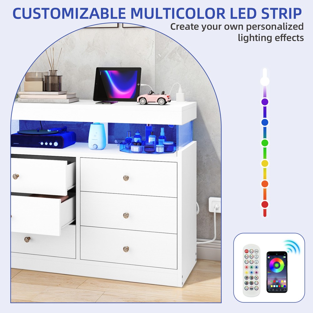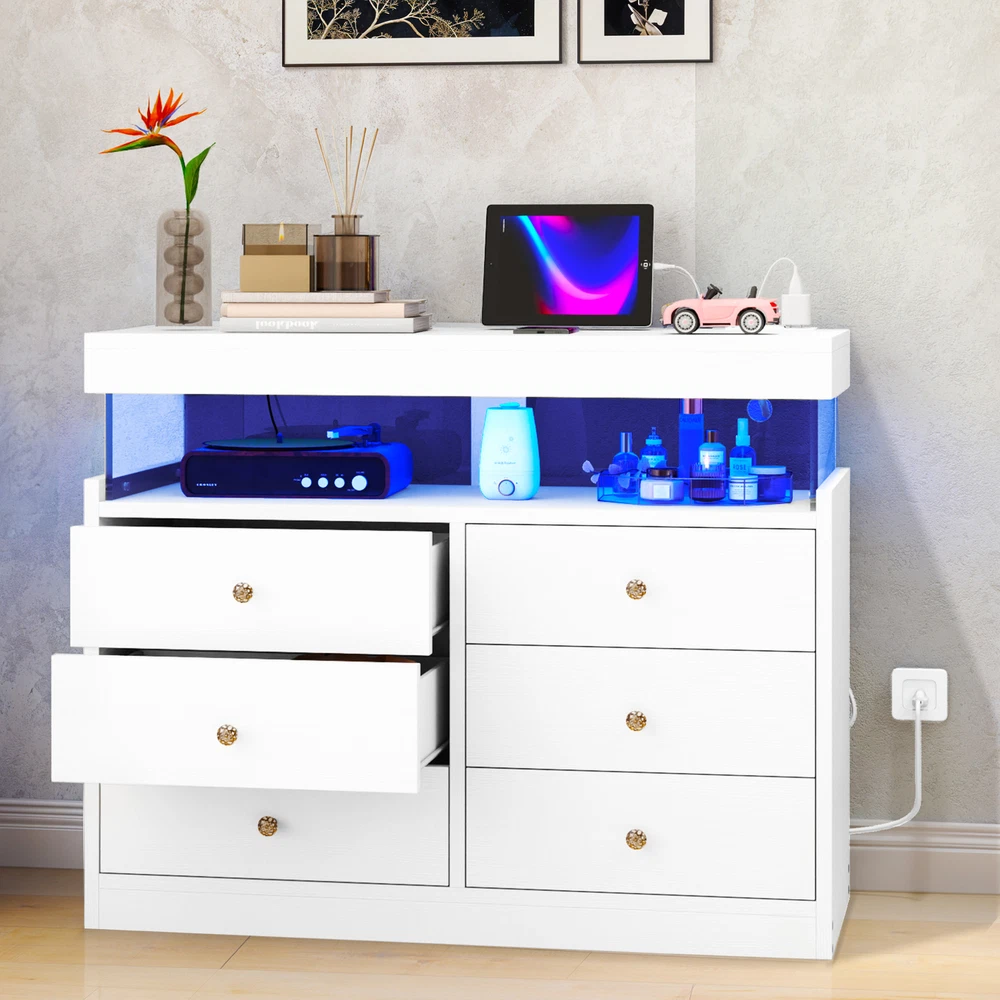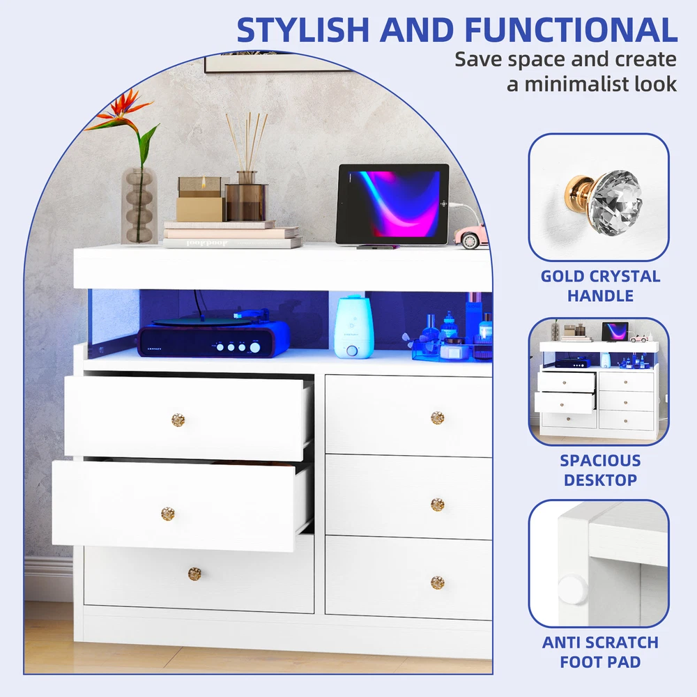 Chests of 6 Drawers White 59" Wooden Storage Dressers Acrylic Open Shelves w/ LED Lights Product Description NOTE: Professional Installation would be Highly Recommended. Description: 1. Color: White 2. Material: Solid + Manufactured Wood 3. Handle Material: Gold Crystal 4. Number of Shelves: 6 5. Number of UL Outlet : 2 6. Number of USB Port : 2 7. Room Placement Recomendation: Bedroom, Living Room, Entryway, Home Office 8. Ideal For : Storage Cabinet, Chest of Drawer, Sideboard Storage, Drawer Dresser, Storage Drawer, Chest of Storage Features: Space-Saving Storage Organizer Declutter in style with this multifunctional cabinet featuring 6 drawers, an open shelf, and a spacious top surface—perfect for keeping essentials organized and within reach. Its sleek, space-saving design enhances any room with a clean, modern look. Dresser with Built-In USB & Power Outlets Power meets practicality in this modern dresser with built-in charging. Designed with 6 spacious drawers, it features 2 USB ports and 2 AC outlets on top—perfect for charging phones, tablets, or lamps without clutter. Comes with a 6.5 ft power cord and UL-listed components for reliable, safe use. A smart solution to keep your room organized and devices powered up . RGB LED Display Dresser Add a sleek, modern vibe to any room with this LED-illuminated dresser, featuring customizable RGB lighting with 15+ colors and brightness levels—perfect for setting the mood. Built-in ambient lighting softly highlights your items through clear acrylic panels, creating a stylish, gallery-like showcase Versatile All-in-One Storage Solution Maximize space with this multi-functional cabinet that adapts to any room. Use it as a dresser in the bedroom, media console in the living room, or organizer in the entryway. Perfect for storing clothes, accessories, electronics, or everyday essentials—its sleek design blends seamlessly into any décor. Whether as a buffet cabinet, closet organizer, or accent piece, this unit offers stylish utility for every space Modern Dresser with Smooth Glide Drawers & Gold Crystal Handles Upgrade your space with a sleek storage solution. This stylish dresser features smooth-gliding drawers with durable ball-bearing slides and is finished with elegant gold crystal handles—combining modern design with everyday functionality . Simple Assembly Storage The Effortless Care Storage Unit is easy to assemble and maintain, providing a hassle-free experience from start to finish with clear instructions included. Dimensions: 1.Product Dimensions: 39.3"L x 15.7"W x 32.8"H 2. Drawer Dimensions : 16.5"L x 13.8"W x 3.9"H 3. Item Weight: 102.8Pounds 4. Largest Drawer Weight Capacity : 25 lb. 5. Power Cord Length: 6.5 feet 6. UL Outlet Capacity : 120V / 12A 7. USB Port Capacity: 5V / 2A Package Included: 1 x Dresser Cabinet 1 x Instructions 1 x Pack of Accessories Notice: There may be some differences between photos and items in term of color because the influence of lighting during the shooting or the settings of the computers’ display screen Shipping 1. Normally the item will be dipatched within 1 business day if payment is cleared before 12pm PST. 2. Please verify the correct shipping address in your PayPal account before making the payment. We only dispatch the item to the address that is sent to us at the time of checkout. 3. We don't ship to Hawaii, Alaska, Puerto Rico, APO/FPO/PO Boxes. 4. We don't provide local pick-up service. 5. Normally we will use USPS, UPS, FedEx & LTL to dispatch items. Payment 1. We accept PayPal and credit card. 2. We will ship to the confirmed Paypal shipping address that is provided with the payment only. Return 1. 30 days Money Back Guarantee. 2. Please contact our customer service to receive a RMA form first if want to return the item. 3. All returned items MUST in new condition with the original package. Contact If has any problem, please contact us by sending an ebay message. Our customer service will resolve the problem as soon as possible. On Feb 1, 2025 at 21:10:15 PST, seller added the following information: On Jun 16, 2025 at 21:40:16 PDT, seller added the following information: