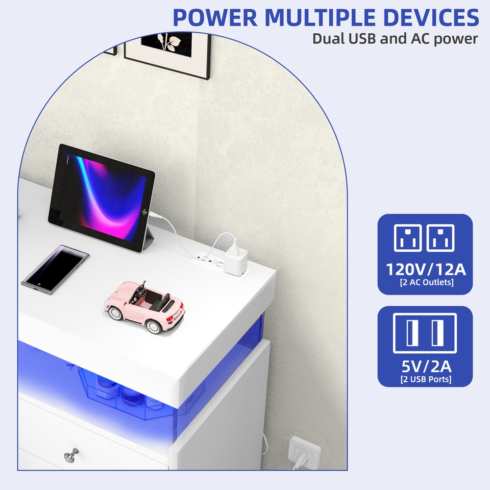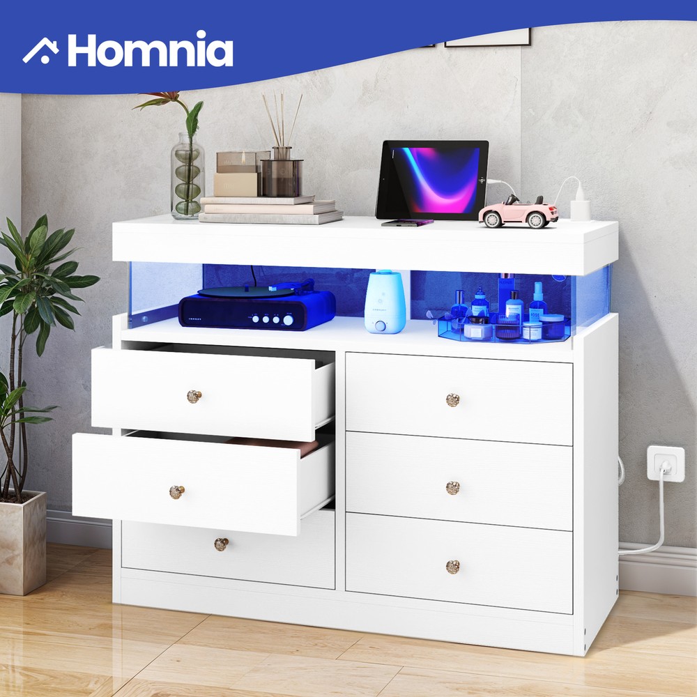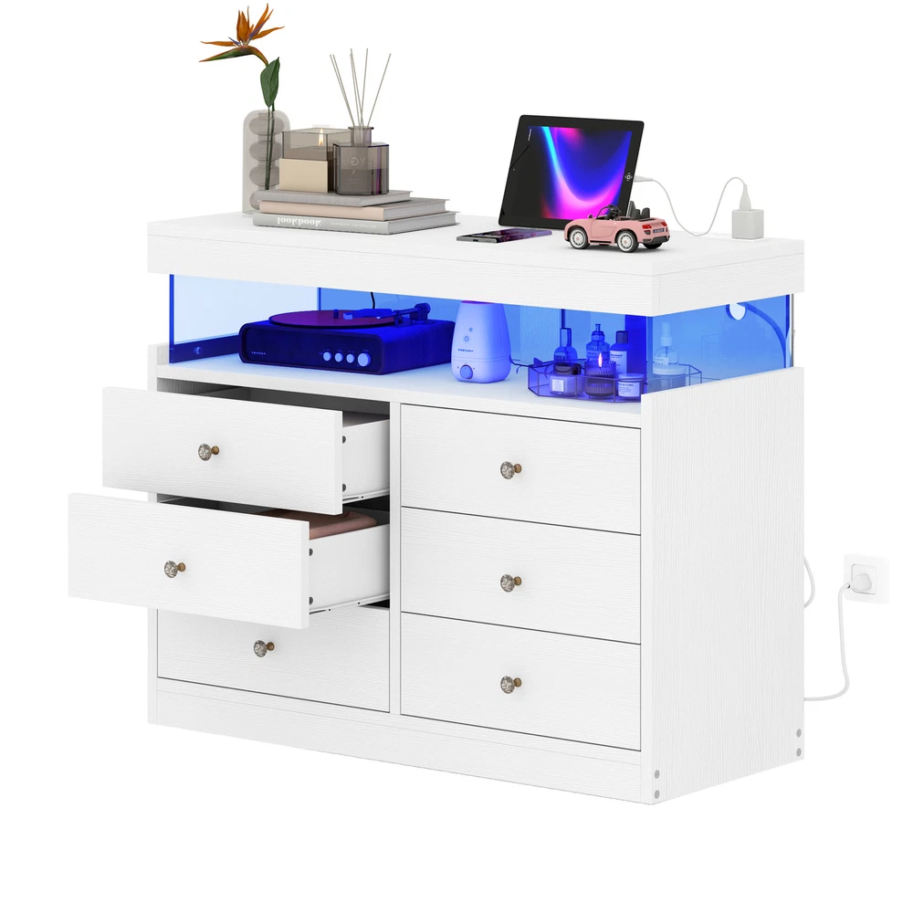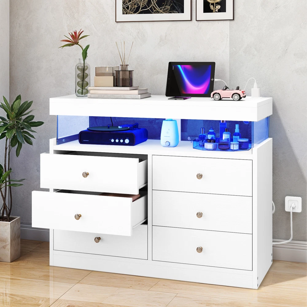 Chests of 6 Drawers White 59" Wooden Storage Dressers Acrylic Open Shelves w/ LED Lights Product Description NOTE: Professional Installation would be Highly Recommended. Description: 1. Color: White 2. Material: Solid + Manufactured Wood 3. Handle Material: Gold Crystal 4. Number of Shelves: 6 5. Number of UL Outlet : 2 6. Number of USB Port : 2 7. Room Placement Recomendation: Bedroom, Living Room, Entryway, Home Office 8. Ideal For : Storage Cabinet, Chest of Drawer, Sideboard Storage, Drawer Dresser, Storage Drawer, Chest of Storage Features: Space-Saving Storage Organizer Declutter in style with this multifunctional cabinet featuring 6 drawers, an open shelf, and a spacious top surface—perfect for keeping essentials organized and within reach. Its sleek, space-saving design enhances any room with a clean, modern look. Dresser with Built-In USB & Power Outlets Power meets practicality in this modern dresser with built-in charging. Designed with 6 spacious drawers, it features 2 USB ports and 2 AC outlets on top—perfect for charging phones, tablets, or lamps without clutter. Comes with a 6.5 ft power cord and UL-listed components for reliable, safe use. A smart solution to keep your room organized and devices powered up . RGB LED Display Dresser Add a sleek, modern vibe to any room with this LED-illuminated dresser, featuring customizable RGB lighting with 15+ colors and brightness levels—perfect for setting the mood. Built-in ambient lighting softly highlights your items through clear acrylic panels, creating a stylish, gallery-like showcase Versatile All-in-One Storage Solution Maximize space with this multi-functional cabinet that adapts to any room. Use it as a dresser in the bedroom, media console in the living room, or organizer in the entryway. Perfect for storing clothes, accessories, electronics, or everyday essentials—its sleek design blends seamlessly into any décor. Whether as a buffet cabinet, closet organizer, or accent piece, this unit offers stylish utility for every space Modern Dresser with Smooth Glide Drawers & Gold Crystal Handles Upgrade your space with a sleek storage solution. This stylish dresser features smooth-gliding drawers with durable ball-bearing slides and is finished with elegant gold crystal handles—combining modern design with everyday functionality . Simple Assembly Storage The Effortless Care Storage Unit is easy to assemble and maintain, providing a hassle-free experience from start to finish with clear instructions included. Dimensions: 1.Product Dimensions: 39.3"L x 15.7"W x 32.8"H 2. Drawer Dimensions : 16.5"L x 13.8"W x 3.9"H 3. Item Weight: 102.8Pounds 4. Largest Drawer Weight Capacity : 25 lb. 5. Power Cord Length: 6.5 feet 6. UL Outlet Capacity : 120V / 12A 7. USB Port Capacity: 5V / 2A Package Included: 1 x Dresser Cabinet 1 x Instructions 1 x Pack of Accessories Notice: There may be some differences between photos and items in term of color because the influence of lighting during the shooting or the settings of the computers’ display screen Shipping 1. Normally the item will be dipatched within 1 business day if payment is cleared before 12pm PST. 2. Please verify the correct shipping address in your PayPal account before making the payment. We only dispatch the item to the address that is sent to us at the time of checkout. 3. We don't ship to Hawaii, Alaska, Puerto Rico, APO/FPO/PO Boxes. 4. We don't provide local pick-up service. 5. Normally we will use USPS, UPS, FedEx & LTL to dispatch items. Payment 1. We accept PayPal and credit card. 2. We will ship to the confirmed Paypal shipping address that is provided with the payment only. Return 1. 30 days Money Back Guarantee. 2. Please contact our customer service to receive a RMA form first if want to return the item. 3. All returned items MUST in new condition with the original package. Contact If has any problem, please contact us by sending an ebay message. Our customer service will resolve the problem as soon as possible. On Feb 1, 2025 at 21:10:15 PST, seller added the following information: On Jun 16, 2025 at 21:40:16 PDT, seller added the following information:
