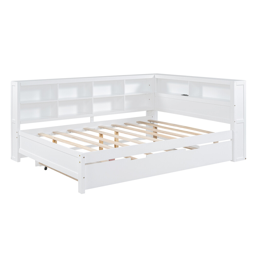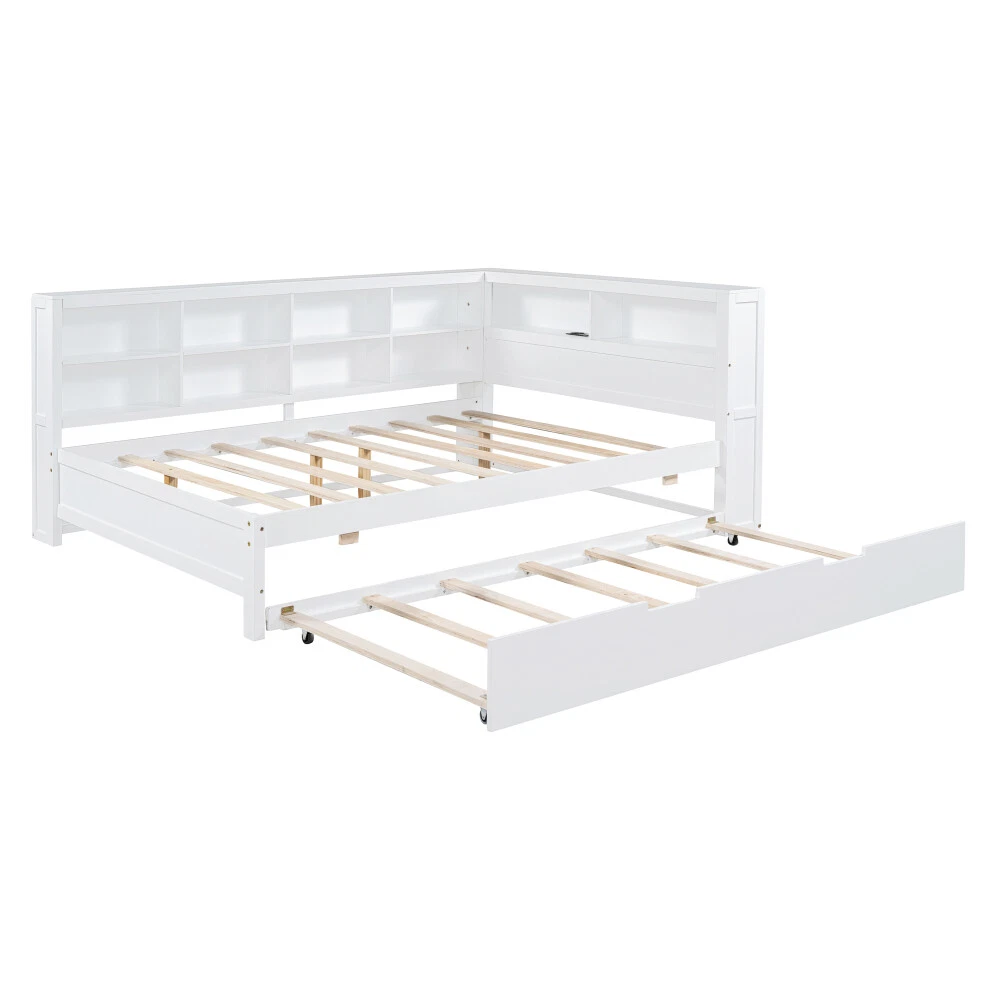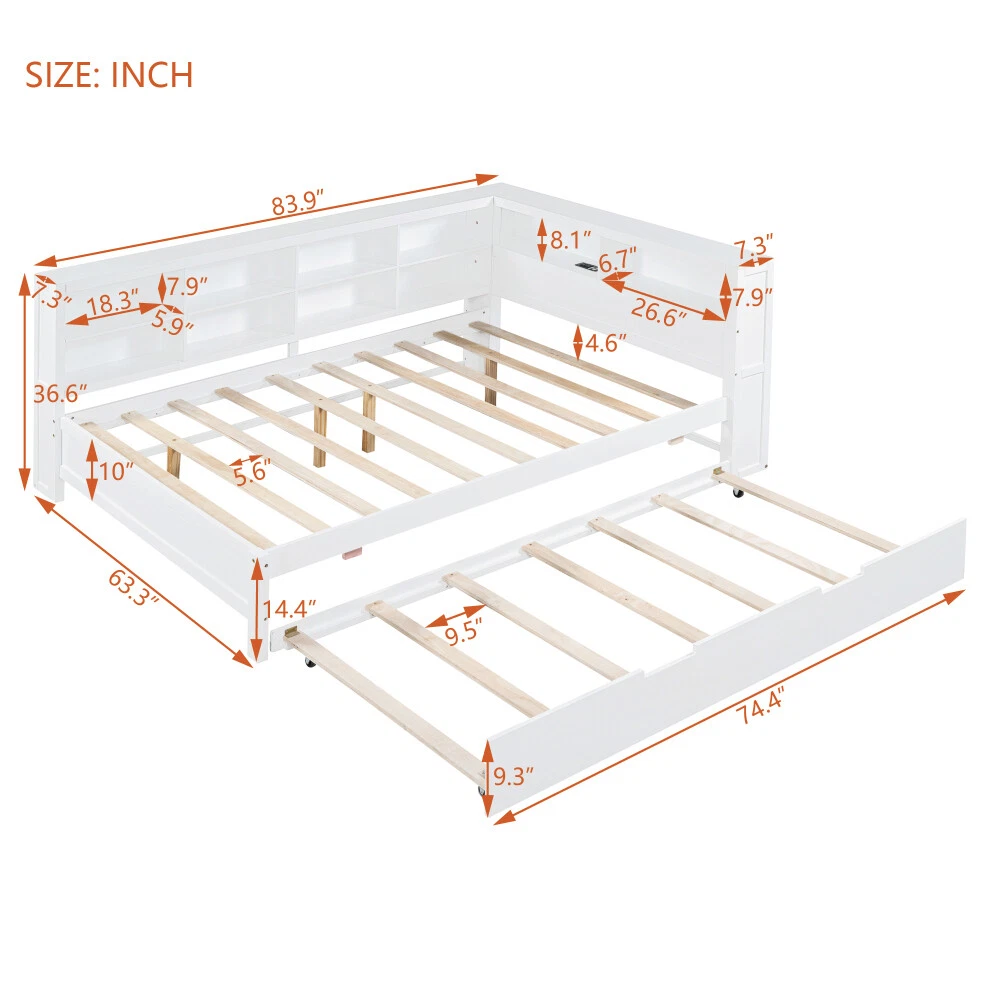 Elegant design: This daybed is designed with pine wood material, available in grey or white color. It is not only suitable for any home decoration, but also designed to last forever. Daybed Frame with Charging Station: This unique full size daybed frame is designed with a USB port charging station to allow you to charge or use electronic devices while you sleep, providing even more convenience and comfort. Space-saving:The daybed includes one trundle, which can be rolled out to provide extra sleeping space. This design is ideal for families with children or users who need to host guests frequently. There is a double-layer storage shelf next to the bed, where users can store bedding, toys and other items. Superior Quality: Made of high-quality MDF, the frame of this bed is not easy to be affected by humidity change and lead to crack. The strong legs, wide boards and 10 slats for bed,not only improve the weight capacity of the bed greatly but also ensure the stability. Product Dimension: Overall Product Dimension: 83.9"L X 63.3"W X 36.6"H. Bed suitable for full size mattresses. Wooden Full Size DayBed with Trundle, DayBed with Storage Shelf and USB Charging Ports, White This day bed is designed with pine wood material, available in grey or white color. It comes with a double-layer shelf for convenient storage and one pull-out bed for extra sleeping space. In addition, it is equipped with a USB charging station for electronic devices. This design is not only practical but also stylish, making it an ideal choice for any modern bedroom. The solid pine wood frame ensures durability and stability, while the sleek and minimalist design adds a touch of elegance to any room.