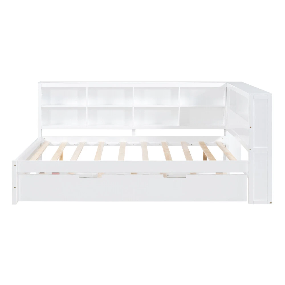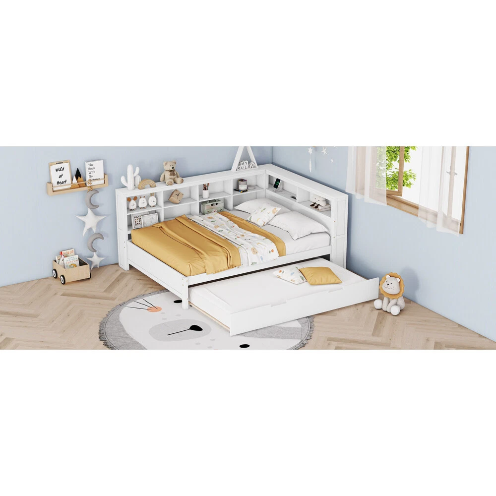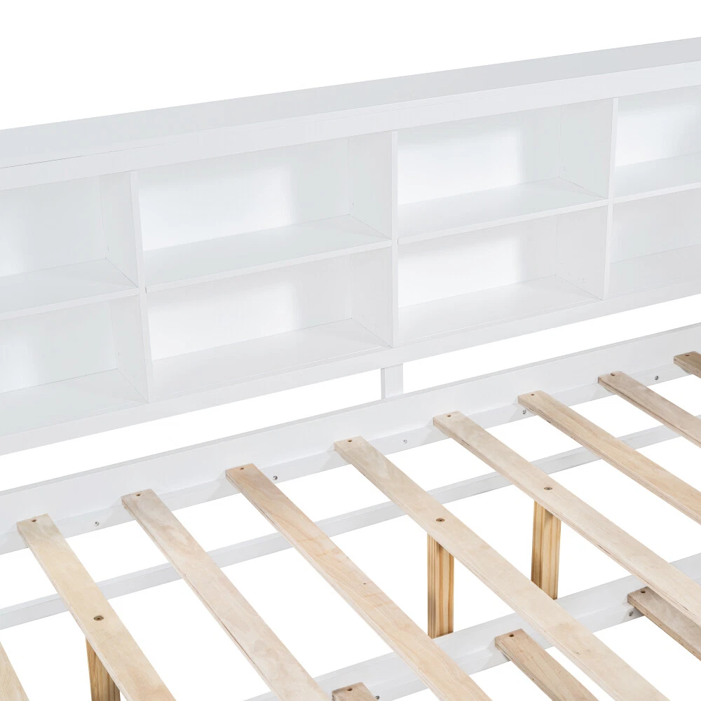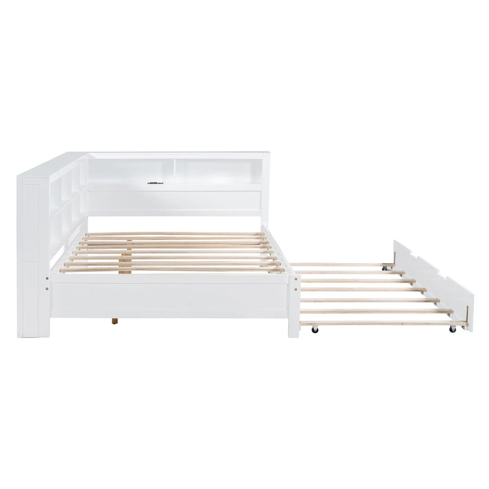 Elegant design: This daybed is designed with pine wood material, available in grey or white color. It is not only suitable for any home decoration, but also designed to last forever. Daybed Frame with Charging Station: This unique full size daybed frame is designed with a USB port charging station to allow you to charge or use electronic devices while you sleep, providing even more convenience and comfort. Space-saving:The daybed includes one trundle, which can be rolled out to provide extra sleeping space. This design is ideal for families with children or users who need to host guests frequently. There is a double-layer storage shelf next to the bed, where users can store bedding, toys and other items. Superior Quality: Made of high-quality MDF, the frame of this bed is not easy to be affected by humidity change and lead to crack. The strong legs, wide boards and 10 slats for bed,not only improve the weight capacity of the bed greatly but also ensure the stability. Product Dimension: Overall Product Dimension: 83.9"L X 63.3"W X 36.6"H. Bed suitable for full size mattresses. Wooden Full Size DayBed with Trundle, DayBed with Storage Shelf and USB Charging Ports, White This day bed is designed with pine wood material, available in grey or white color. It comes with a double-layer shelf for convenient storage and one pull-out bed for extra sleeping space. In addition, it is equipped with a USB charging station for electronic devices. This design is not only practical but also stylish, making it an ideal choice for any modern bedroom. The solid pine wood frame ensures durability and stability, while the sleek and minimalist design adds a touch of elegance to any room.