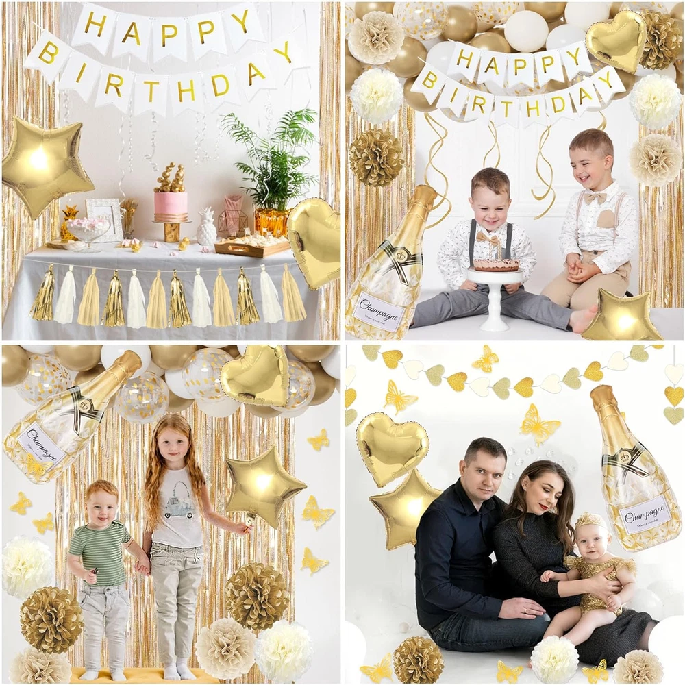 Store New Arrivals Add to Favorite View Feedback Contact Fast deliveries to the customer's home Quality customer service John Make the customers happy! White and Gold Birthday Party Decorations Kit for Women Girls, Gold White Sand Confetti Foil Balloons Happy Birthday Banner Fringe Curtains Butterfly Garland Baptism Communion Supplies Description Gold Birthday Decorations: Our 97pcs valuable gold party decorations kit include 2pcs gold foil fringe curtains, 3pcs gold foil balloons(40"champagne bottle/18"star/18"heart), 20pcs 10"metallic gold balloons, 20pcs 10"white/white sand balloons, 10pcs12"gold confetti balloon, 1pcs happy birthday banner, 1pcs heart banner, 6pcs 6"paper flowers, 15pcs tissue tassels(5gold, 5Khaki, 5ivory white), 12pcs gold butterfly wall decor, 4pcs hanging swirls and 3pcs balloon tools. Multiple Usages: Are you ready to celebrate in style? Look no further than this gold birthday decorations for women girls. Whether it's a milestone like turning 30th, 40th, 50th, or 60th or simply celebrating another year of life like 16th 18th 20th 21st birthday decorations, gold balloon arch has got you covered. Such nice touch to weddings, engagement party decorations, baptism decorations, first communion decorations, anniversary celebrations, butterfly birthday decorations etc. Pretty Birthday Decorations: No golden birthday party decorations are complete without some sparkle, and that's where fringe curtains come in. Adorn your walls with these luxurious gold fringe curtains and happy birthday banner, and enjoy white and gold birthday decorations as they create a dazzling effect. With these eye-catching gold balloon garland together, provide a glamorous backdrop for photos, ensuring that every moment is captured in style. Decent Quality: These white and gold party decorations are made of natural latex gold balloons and reliable paper materials with durability, which will surely grab everyone's attention as they walk into the party. The elegant white sand color combined with the gold accents will create a visually stunning display. Hang up these gold party decorations as a backdrop or drape it across the dessert table to add a touch of sophistication to your setup. Choking Hazard: Children under 8 yrs; can choke or suffocate on uninflated or broken balloons; Adult supervision required; Keep uninflated balloons from children; Discard broken balloons at once Product description 1 Gold Birthday Decorations 2 Gold Party Decorations 3 Gold and White Balloons 4 Weddings Gold Birthday Party Decorations Kit for Women Girls Are you ready to celebrate in style? Look no further than this gold birthday decorations for women girls. Whether it's a milestone like turning 30th, 40th, 50th, or 60th or simply celebrating another year of life like 16th 18th 20th 21st birthday decorations, gold balloon arch has got you covered. Such nice touch to weddings, engagement party decorations, bridal shower decorations, bride to be decorations, anniversary celebrations, butterfly birthday decorations etc. Great Quality Hang up these gold party decorations as a backdrop or drape it across the dessert table to add a touch of sophistication to your setup. Birthday Vibes With these eye-catching gold balloon garland together, provide a glamorous backdrop for photos, ensuring that every moment is captured in style. Easy to Make Hang them from the ceiling or use them as table decorations to add a fun and festive touch to your party space. Multiple Usages Such nice touch to weddings, engagement party decorations, bridal shower decorations, bride to be decorations, anniversary celebrations etc. Item model number SKU-045-1 Unit Count 98.0 Count Style Gold&White Batteries required No Pattern Solid (Gold&White) Product Dimensions 0.1 x 0.1 x 0.1 inches Material Latex, Paper Item Weight 15.5 ounces Color Gold&white Occasion Birthday Included Components Party Decorations ABOUT US We offer the best prices around on high quality products. Our E-store includes media such as books, movies, music and games while offering electronics, toys, sporting apparel, clothing, tools, general home, garden items and more. SHIPPING We are always working hard to ensure your package arrives as soon as possible. Please understand that some factors like weather, high postal traffic, and the performance of shipping companies are outside of our control. We offer free shipping to the lower 48 states and ship within 2 business days of payment, usually sooner. We do not accept P.O. Boxes. Please provide a physical address. For shipping outside of the continental USA, we only use eBay's Global Shipping Program. The item is shipped to KY and then sent to the rest of the world. International customers are responsible for all duties and taxes. Continue to 'check out' to calculate costs for shipping the item to your country. Messages regarding eBay's Global Shipping Program MUST be directed at eBay EXCLUSIVELY. RETURNS We offer a 30-Day Return Policy on items in which you are not completely satisfied with. You have the option of a full-refund or an exchange of the item. No returns are available on items shipped outside of the USA PAYMENT We accept PayPal. CONTACT US This page content is yet to come Please ad us to your favorite seller and visit again later Thank You CUSTOMER SATISFACTION We try our very best to make sure every customer is completely satisfied. If there's a problem, message us! We're happy to help. WE ACCEPT