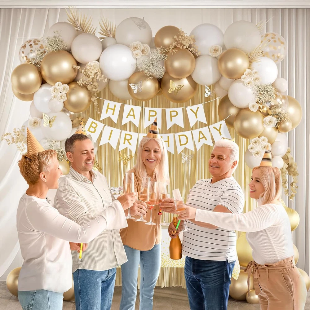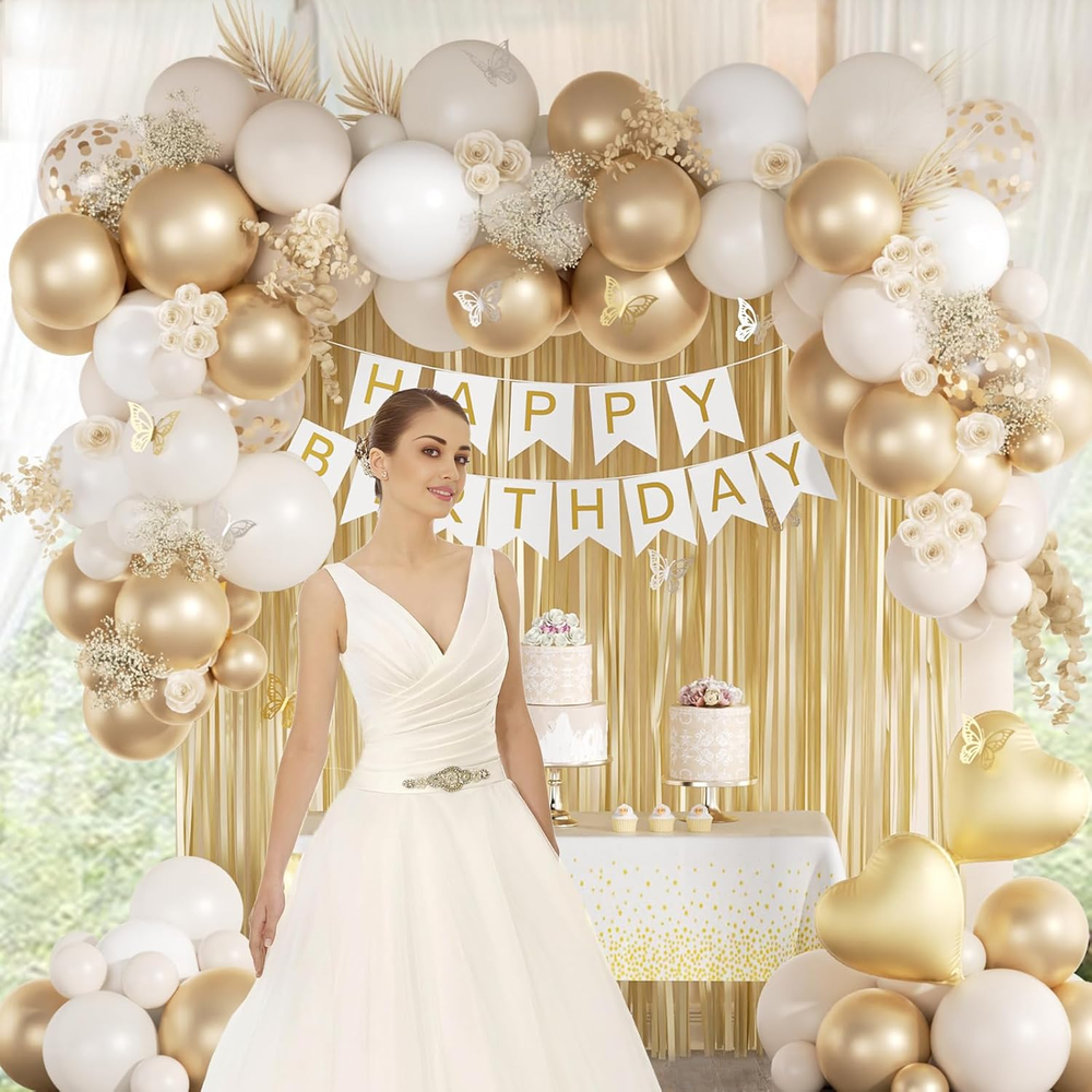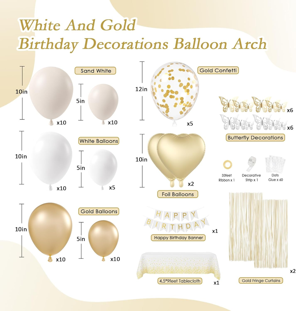 Store New Arrivals Add to Favorite View Feedback Contact Fast deliveries to the customer's home Quality customer service John Make the customers happy! White and Golden Birthday Party Decorations with Happy Birthday Banner Fringe Curtai Tablecloth Butterfly Decorations Foil Balloons Happy Birthday Decorations for Women Description What You Receive:Our white and gold birthday decorations includes 15pcs white balloons(10inchx10, 5inchx5), 20pcs sand white balloons(10inchx10,5inchx10), 20pcs metallic gold balloons(10inchx10, 5inchx10), 12inch gold confetti balloonsx5, gold fringe curtainx2, gold and white happy birthday bannerx1, butterfly party decorationsx12(goldx6, silverx6), gold foil balloonsx2, white and gold tableclothx1, glue dotsx100, ribbonx1,decorative stripx1 All Inclusive Birthday Decorations:The white and gold happy birthday decor is an all inclusive package featuring balloons, happy birthday banner, fringe curtains,tablecloth and a variety of foil balloons,The white and gold party decorations for women exudes refinement. Use them to create a backdrop or a photo boot Easy to Use:We offer 3 tools to help you easily create gold decorations for party: ribbon, glue dots, and decorating strip. Inflate the balloons, then tie them together with the strip and hang them with ribbon. Decorate your gold and white party decorations with these birthday party decor to create a meaningful party Widely Applications:This white and gold party decor is the excellent addition to women birthday decorations gold, suitable for 16th, 18th, 21st, 30th, 40th, 50th,55th 60th 70th 80th birthday decorations for women adults, and other important party events Warm Tips: If there are any problems with the product, we will try to solve them for you, so that you can enjoy the party with peace of mind Product description CPSIA Cautionary Statement Choking Hazard - Balloon Unit Count 70.0 Count Item dimensions L x W x H 8.6 x 4.7 x 2.3 inches Color White, Golden Product Dimensions 8.6 x 4.7 x 2.3 inches Material Plastic or Metallic Foil Item Weight 13.7 ounces Theme Butterfly Manufacturer recommended age 12 months and up Occasion Anniversary, Birthday Included Components Balloons, Happy Birthday Banner, Fringe Curtains, Tablecloth, Confetti Balloons Size 10inchx10, 5inchx5, 12inch ABOUT US We offer the best prices around on high quality products. Our E-store includes media such as books, movies, music and games while offering electronics, toys, sporting apparel, clothing, tools, general home, garden items and more. SHIPPING We are always working hard to ensure your package arrives as soon as possible. Please understand that some factors like weather, high postal traffic, and the performance of shipping companies are outside of our control. We offer free shipping to the lower 48 states and ship within 2 business days of payment, usually sooner. We do not accept P.O. Boxes. Please provide a physical address. For shipping outside of the continental USA, we only use eBay's Global Shipping Program. The item is shipped to KY and then sent to the rest of the world. International customers are responsible for all duties and taxes. Continue to 'check out' to calculate costs for shipping the item to your country. Messages regarding eBay's Global Shipping Program MUST be directed at eBay EXCLUSIVELY. RETURNS We offer a 30-Day Return Policy on items in which you are not completely satisfied with. You have the option of a full-refund or an exchange of the item. No returns are available on items shipped outside of the USA PAYMENT We accept PayPal. CONTACT US This page content is yet to come Please ad us to your favorite seller and visit again later Thank You CUSTOMER SATISFACTION We try our very best to make sure every customer is completely satisfied. If there's a problem, message us! We're happy to help. WE ACCEPT