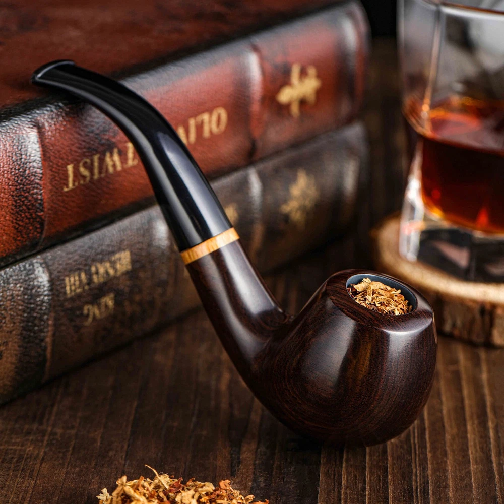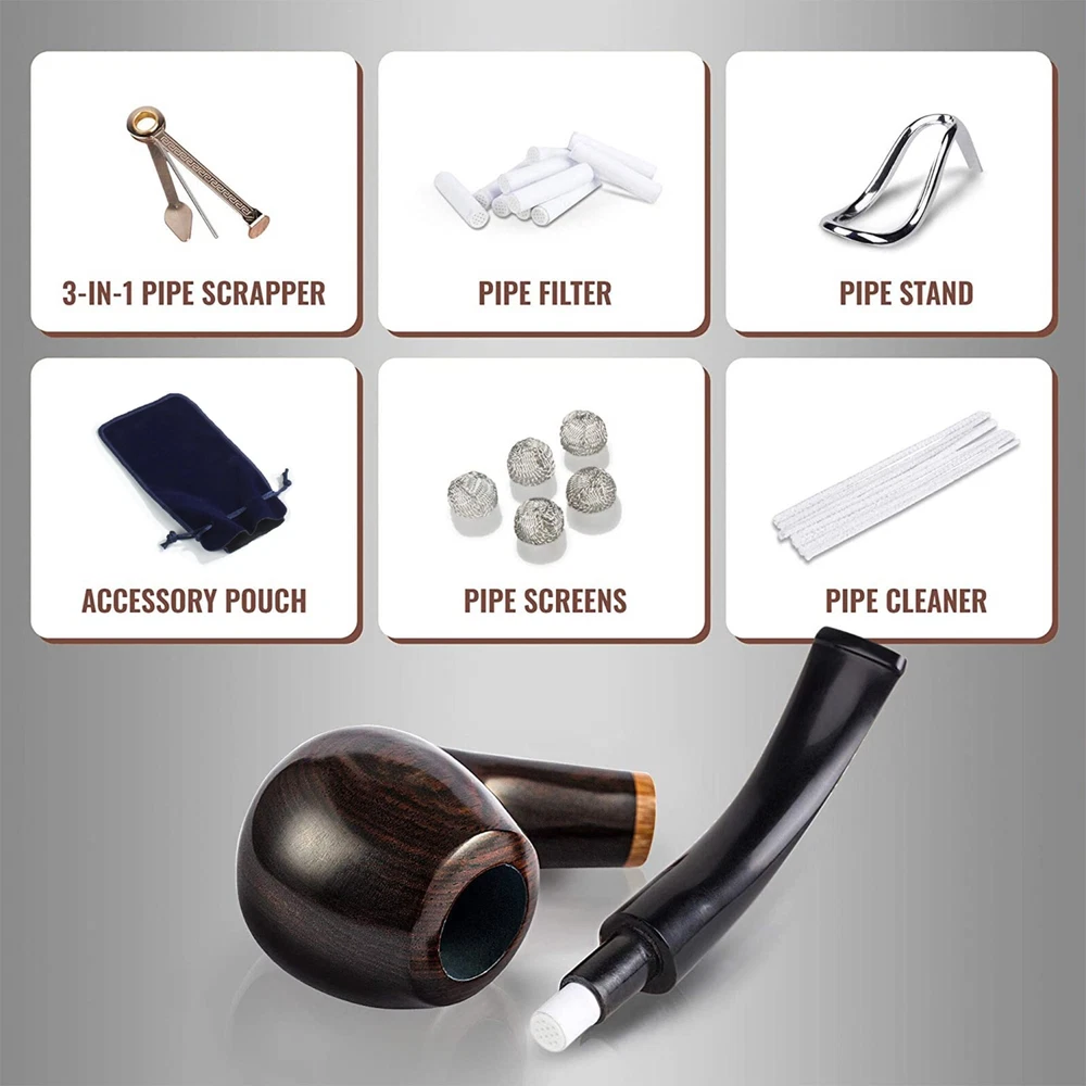 Pipe smokers expect their tobacco pipes to be as reliable as they are distinguished. Whitluck's designs their handmade wooden pipes with this exact philosophy. On the outside, the polished ebony wood catches the eye, while the large recessed bowl rests perfectly in the smoker's palm. Inside, the smooth, molded smoke chamber allows for an even smoke displacement and clean draw, and the tobacco can burn evenly. These gentleman's pipes make the PERFECT gift for a husband, dad, or grandfather. Whether it is his birthday, Christmas, or even Father's Day, he will love to relax using his Whitluck's Pipe in the backyard after a fun day spent with family and friends. Whitluck's aims to make cleaning and upkeep a breeze too, which is why we include all of the accessories you need for your pipe's upkeep! The handy 3-in-1 pipe tool allows you to clean out used ash quickly, and the pipe cleaners make clearing the smoke chamber a breeze. Whitluck's pipe kits also include standard filters as well as pipe screens, as every smoker has a different filter preference. All of the accessories are easily stored, along with the pipe itself, in the convenient and elegant carry bag. The Whitluck's Tobacco Pipe Kit includes: 1 x handmade tobacco pipe 1 x carry bag 1 x 3-in-1 pipe tool 1 x pipe stand 1 x beginners guide E-Book for smoking pipes 5 x pipe screens 10 x pipe filters (9mm) 10 x pipe cleaners Premium Quality Wood - Our handmade wooden pipe is artisanally crafted out of solid Ebony, while its design gives a modern colorful touch to one of the most traditional and reliable styles of pipe. Smoking Pipe Kit - The pipe kit is easy to use and clean, includes a high quality wood pipe and accessories (pipe stand, pouch, filters and screens) and a smoking pipe cleaning kit (3-in-1 tool and pipe cleaners) Perfect Gift Set - These gentlemen's pipes with a delicate case for avid tobacco pipes smokers and those just starting out - great for a Birthday, Father's Day or Christmas for a husband, dad, or grandfather.