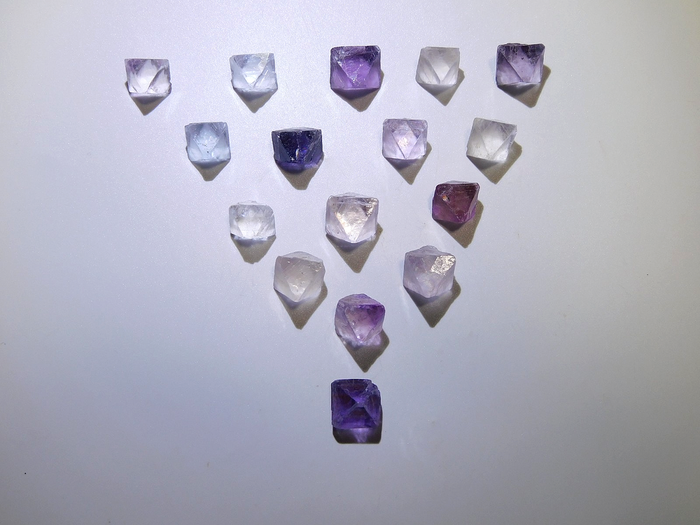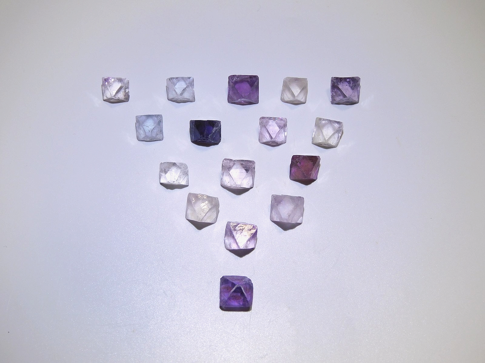 Here are 16 Octahedron fluorites from southern Illinois and are a favorite for collectors. These small gemmy and lustrous bi-color octahedrons range in colors, blue, purple, and bluish - white. Most octahedra are single colors and you don't see many anymore that are extremely gemmy. These crystals are completely terminated all the way around and measures in a variety of sizes from the largest measuring 15.3mm tall x 11.4mm wide x 11.1mm front to back and the smallest measuring 12.9mm tall x 9.6mm wide x 8.8mm front to back. The others measure between those. Comes with original label and as always we offer combine shipping in the USA, Thank you.