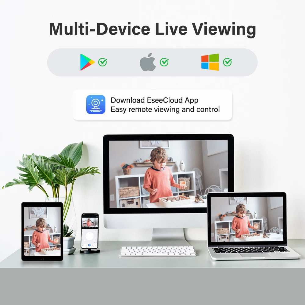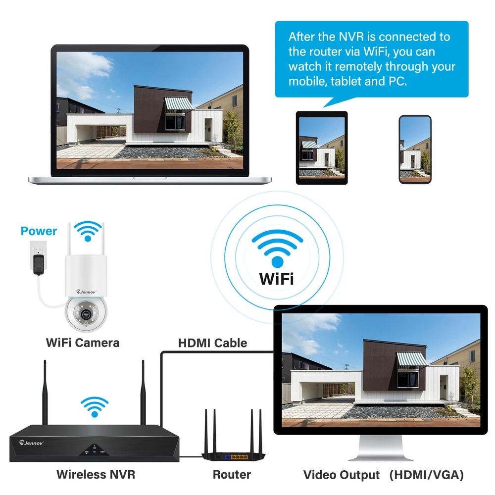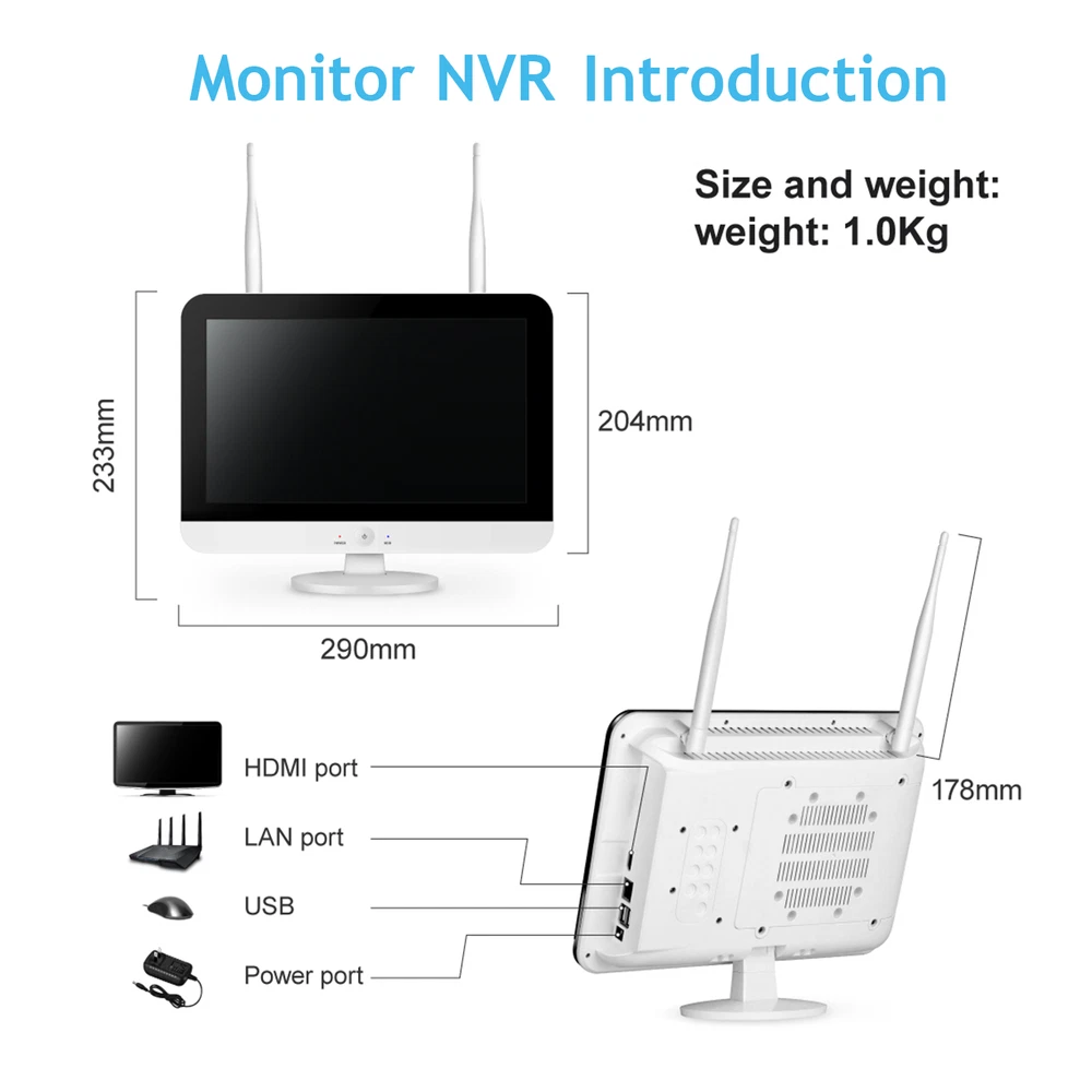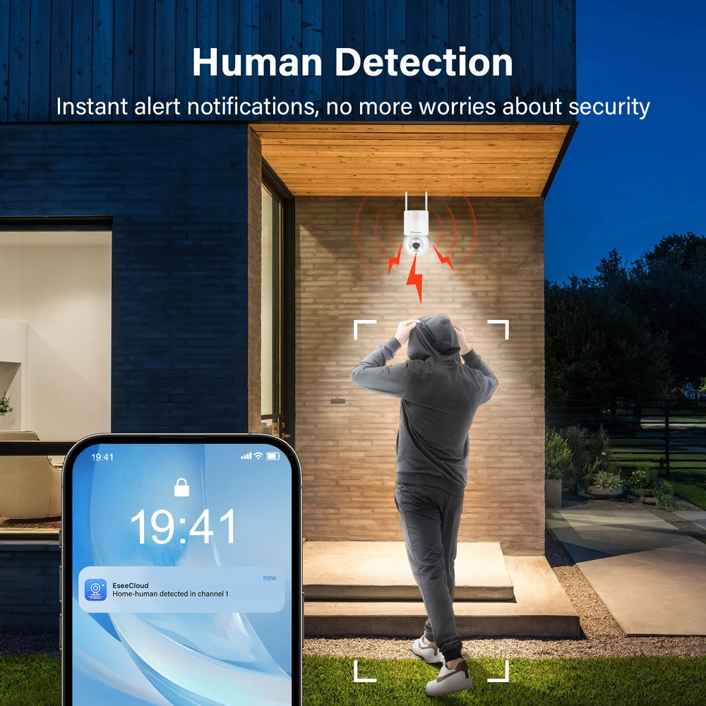Any questions please feel free to contact us at any time. Quick Reply. The power cord is 1 metre by default, if you need an extension cable please contact us, we can give you an extension cable NVR can connect up to 10 cameras What's in the box? Cameras and NVR change according to the set you choose, while power adapters, waterproof covers, and screws get a corresponding quantity 5MP Clear Vision, Day or Night 5MP super HD, even in the darkest nights. Benefit from infrared night vision that reveals details up to 100ft away, featuring professional optical lenses for vivid colors and fine image quality. Human Motion Detection & Real Time Alerts The System can reduce false alarms with a human filtering function and receive instant alerts on your phone when motion is detected. Alert notifications will be sent to your phone immediately if human motion is detected. It supports adjusted sensibility to ensure you won't be disturbed by frequent alarms. 2-Way Audio Talk The wireless security camera system comes with advanced noise-filtering microphone and speaker, ensuring clear and fluent voice communication between the app and the cameras. No matter where you are, you can easily share joy with your kids or interact with your pet. It also allows you to keep unwelcome guests at bay Three Recording Modes Save time and effort over general motion detection. You can also set and apply timed recording or 24/7 recording as needed. EseeCloud Intelligent Playback also makes it easy for you to quickly view each event. Works with Alexa This security system is able to work with Amazon Alexa, allowing engaging voice control to take a glance at your rooms or yards. Auto Pairing and WiFi Repeater Once connected to power, the Wi-Fi cameras will pair with the NVR automatically without any manual setting. The nearest wifi-connected camera can serve as a repeater to bolster the connection distance. Multiuser and Smartphone Online at the Same Time This WiFi camera system supports users online at the same time. If you connect it to your home WiFi network, you can access it remotely via your phone (supports both Android and IOS). You can check the real-time status anywhere and anytime. H.265+ Video Compression,More Save HDD Space Saving up to 50% of storage space than H.264 coding without losing 5MP clarity. You will enjoy smooth & fast live stream without latency. Free Local & Cloud Recording 1TB HDD stores months of video before overwriting old files. Or pay for a paid order cloud storage service and don't worry about hard drive damage and lost playback footage. NVR supports hard drives up to 6TB (not included) NVR Multi-Language Support The NVR support 11 languages ,English Korean, Japanese, Portuguese, Spanish, German, etc. NVR (without monitor) Video & Audio Video Compression: H.265+ / H.264+ IP Video Input 10 CH Video Output HDMI / VGA Audio Output Support 3.5mm Audio Cable Max Playback Channel 4 CH Hard Drive HDD 1 SATA Interface Supports up to capacity Up to 6TB Capacity External Interface Network Interface RJ45 X1 Wireless Antenna 2 Ports (IEEE802.11b/g/n) USB 1X USB 2.0 WiFi 2.4 GHz (Built-in Antenna) General Housing Metal+Plastic Operating Power DC 12V Power Consumption 6W (Without HDD) Working Temperature 14 °F ~ 131 °F/-10 °C ~ 55 °C PTZ Camera Camera Video Pixels 5MP Image Sensor 1/2.8" Progressive Scan CMOS Audio Compression G.711A Video Compression H.265+ Lens 2.8mm Angle of View 110° Audio Input/Output Build in microphone & speaker, support 2 way audio Number of Infrared LEDs 2 Night Vision Distance Up to 100 ft/30 m IR-Cut Filter Yes Ethernet RJ45 X1 General Wireless IEEE802.11b/g/n Housing Plastic Operating Temperature 14 °F ~ 131 °F/-10 °C ~ 55 °C Operating Power DC 12V Applicable Scenarios Indoor/Outdoor Weatherproof Rating IP66 If you'd like to buy other J Series add on camera, you can click on the link below or search for them in the store! https://www.ebay.com/itm/116217725838 (A95) https://www.ebay.com/itm/355819262950 (A61) https://www.ebay.com/itm/355877289316 (P41) P41 A61 A95