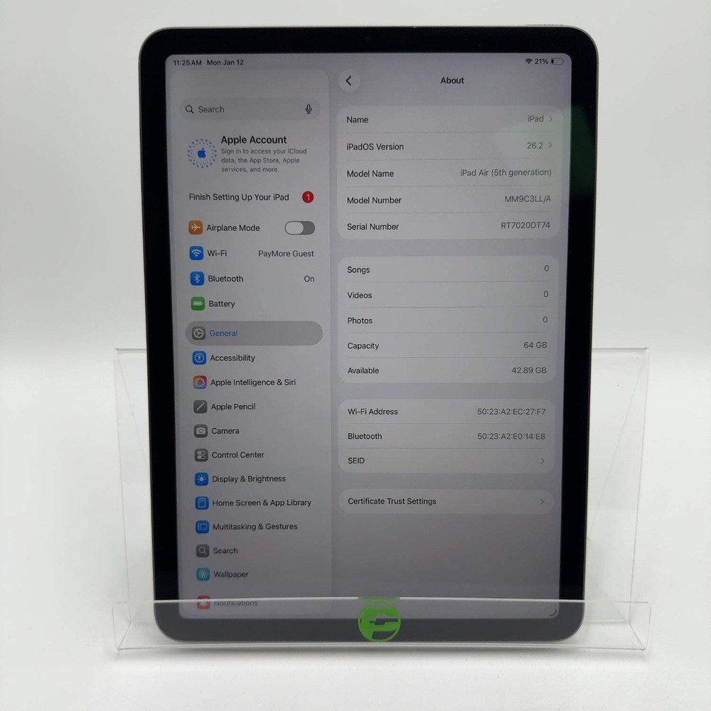 WiFi Only Apple iPad Air 5th Gen 64GB Space Gray MM9C3LL/A WiFi Only Apple iPad Air 5th Gen 64GB Space Gray MM9C3LL/A Items included in this sale: WiFi Only Apple iPad Air 5th Gen 64GB Space Gray MM9C3LL/ASorry, no box or anything else included *Please note, if it is not listed it is not included - such as power cables or other accessories. Specifications: Collection Apple iPad Brand Apple Model iPad Air 5th Gen MPN MM9C3LL/A Series Apple iPad Air Type Tablet Condition Good iOS Version 26.2 Screen Size 10.9" Internet Connectivity Wi-Fi Connectivity/Carrier WiFi Only Storage Size 64GB RAM 8GB Color Space Gray UPC 194252794593 Serial# RT7020DT74 MFG Warranty? No Cosmetic condition: This tablet is in good cosmetic condition with some minor wear. The charging port is clean and in excellent condition! Please view our close up photos, as these are taken of the actual item being offered for sale. Functionality condition: The device has been tested and is fully functional. The display is bright and clear. The touchscreen responds well. The cameras, speakers, and mic all work just fine. It takes great photos and videos. The WiFi, Bluetooth, Touch ID and True Tone all work properly. The iCloud account has been removed and the device has been wiped. Welcome to the PayMore Lexington eBay store, where you can get the best deals on all the best pre-owned tech. Store Home Items for Sale Feedback Contact Us Pre-owned Tech from PayMore: Smartphones Games & Consoles Digital Cameras Headphones Apple Laptops WiFi Only Apple iPad Air 5th Gen 64GB Space Gray MM9C3LL/A $299.99 Buy it Now You can shop with confidence at PayMore Lexington's eBay store. We stand proudly behind every product. Every device we sell comes with an industry-leading 30-day warranty. 30-day Warranty WiFi Only Apple iPad Air 5th Gen 64GB Space Gray MM9C3LL/A Items included in this sale: WiFi Only Apple iPad Air 5th Gen 64GB Space Gray MM9C3LL/A Sorry, no box or anything else included *Please note, if it is not listed it is not included - such as power cables or other accessories. Specifications: Collection Apple iPad Brand Apple Model iPad Air 5th Gen MPN MM9C3LL/A Series Apple iPad Air Type Tablet Condition Good iOS Version 26.2 Screen Size 10.9" Internet Connectivity Wi-Fi Connectivity/Carrier WiFi Only Storage Size 64GB RAM 8GB Color Space Gray UPC 194252794593 Serial# RT7020DT74 MFG Warranty? No Cosmetic condition: This tablet is in good cosmetic condition with some minor wear. The charging port is clean and in excellent condition! Please view our close up photos, as these are taken of the actual item being offered for sale. Functionality condition: The device has been tested and is fully functional. The display is bright and clear. The touchscreen responds well. The cameras, speakers, and mic all work just fine. It takes great photos and videos. The WiFi, Bluetooth, Touch ID and True Tone all work properly. The iCloud account has been removed and the device has been wiped. We stand proudly behind every product Condition is thoroughly assessed Wiped of all data Rigorously tested and cleaned Devices have not been reassembled Thoroughly inspected by experts The Brands at the Best Prices on eBay Your New Home for Pre-owned Tech Get the best deals on everything from smartphones, tablets, laptops, camera gear, and even the best gaming gear. Every device we sell is thoroughly inspected, tested, and backed by a warranty. Shop Now Shop Our Top Categories Apple and Android Smartphones Gaming Gear Games & Consoles Camera Gear Cameras & Lenses Apple and Android Tablets Mac & PC Laptops Pre-Owned Tech All Other Tech Shipping Returns Secure Payments Shipping Info Free shipping applies to all shippable items. Local Pickup Only items are excluded and must be collected in person. The PayMore Return Policy Returns are accepted. All return requests must be submitted within 30 days of delivery Seller will pay for return shipping. Secure Payments Accepted Payment Methods Immediate payment is required upon selecting "Buy It Now" or upon checking out through the cart. We accept payment via U.S. PayPal accounts and all Major Credit Cards, Debit Cards & Google Pay. We are legally required to collect sales tax in those states and localities where we maintain a physical presence (nexus). The applicable amount of sales tax charged to an order will be calculated based on the shipment destination's state and local sales tax laws. Thank you for shopping with us on eBay! Shop with Confidence Shop thousands of high-quality pre-owned devices at PayMore Lexington for a fraction of the price of buying new. Every device we sell is thoroughly inspected, tested, and backed by a warranty. Save money, reduce your impact, while enjoying the same great tech. The Best Deals on eBay Great Tech at Great Prices Store Home Shop Pre-owned Tech Feedback Contact Us © Copyright 2025. All Rights Reserved. eBay integration by
