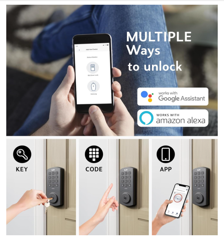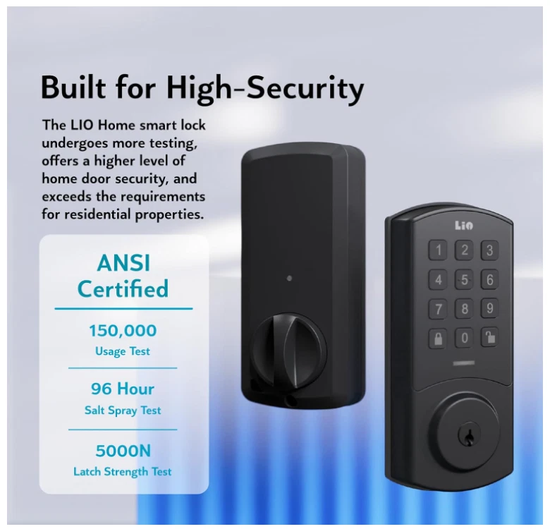 New Keyless Entry Door Lock: Experience a variety of entry options with up to 100 customizable PIN codes, remote control via app, traditional keys, and smart home integration with Amazon Alexa and Google Home. Control Your Locks from Anywhere: Thanks to the included Wi-Fi gateway, the Lio Home Smart Door Lock allows you to use voice commands through Amazon Alexa or Google Home. You can also unlock your door remotely in seconds via the Lio Home app—even while you're away on vacation. Built for High-Security: Crafted from durable materials and ANSI-certified, this lock ensures long-lasting security and reliability, day and night. Flexible Access Codes: The Lio Home app lets you create Permanent, Timed, or One-Time codes, perfect for managing access for family members, visitors, short-term rental guests, or office spaces. Hassle-Free Installation: Installing the Lio Home Smart Lock is quick and easy. With just a Phillips-head screwdriver, you can have it set up in 5–10 minutes—no additional drilling required. Upgrading your front door security has never been simpler.