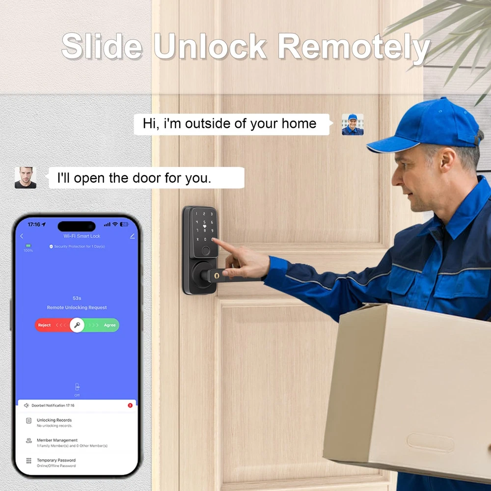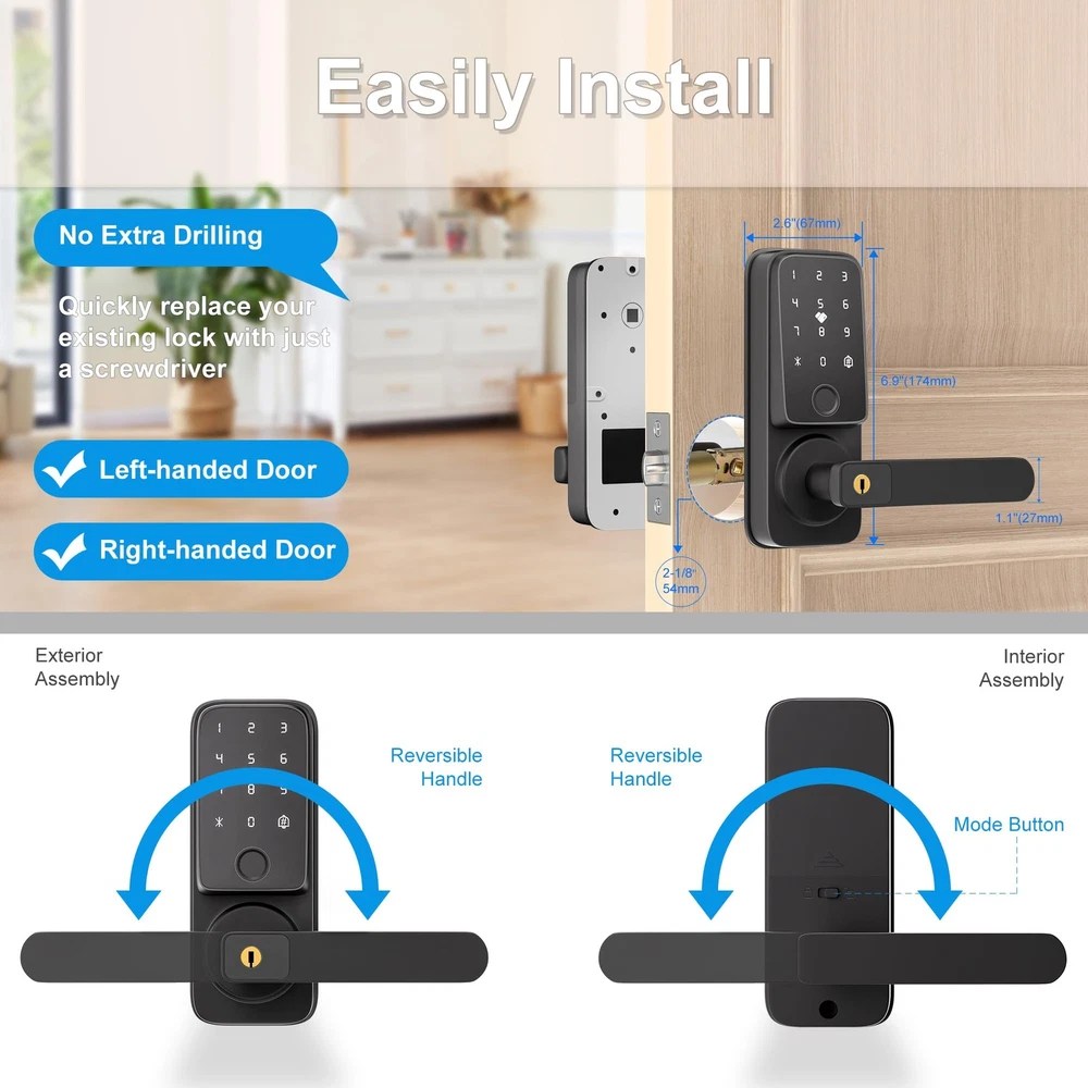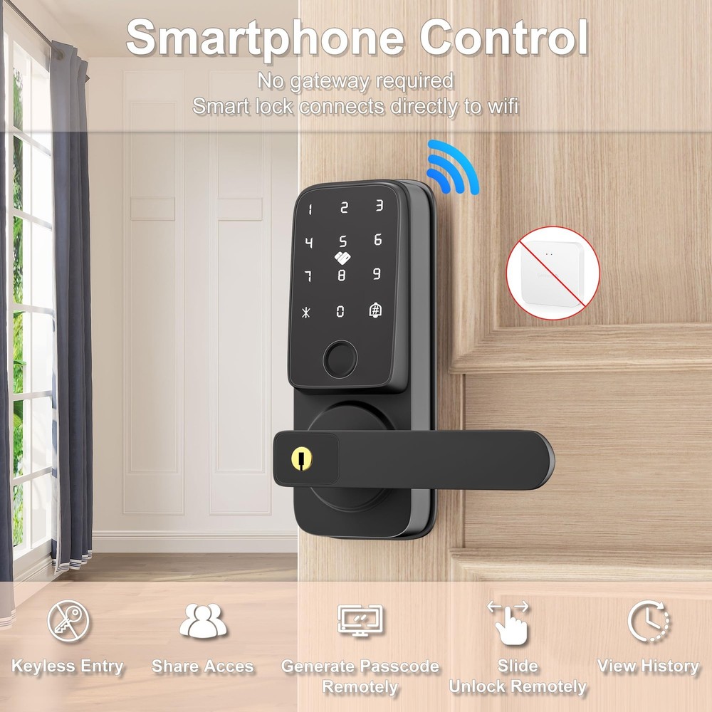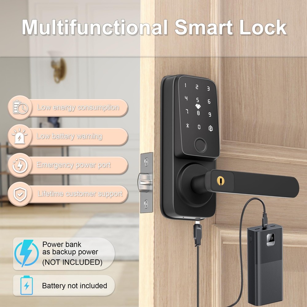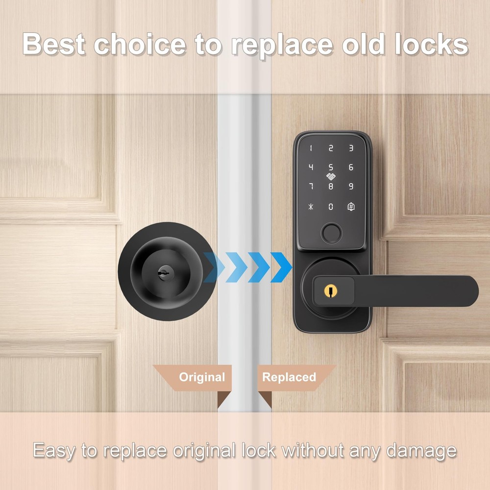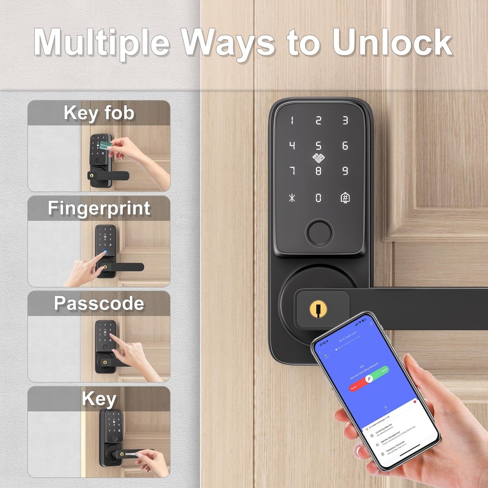 Smart door lock [5 Multiple Ways To Unlock]: Fingerprint + Passcode + APP Control(WiFi connection)+ IC Cards (2 PCS for 12-15 MHZ) + Physical Keys (2 PCS)The door lock supports adding 50+ fingerprints, 100 IC cards, and 100 passwords. The smart door lock will provide you with more options, allowing you to unlock and lock the door more easily and safely. Let us make your life more convenient and safer without keys. [TUYA APP Smart Control]: You can use the Tuya WiFi app to remotely open the door (when someone rings the doorbell), share electronic passwords, view log records, alarm prompts, manage users, and unlock and manage your smart door lock more conveniently anytime and anywhere. (Built-in WiFi connection lock, APP does not charge any fees) [Fingerprint Quick Unlock]: With the newly upgraded 99% recognition rate fingerprint access technology, the unlocking speed is faster, only 0.5 seconds. You don't have to worry about forgetting your keys when you go out, you can use fingerprint to unlock at any time. Note: Before unlocking with fingerprint or password, please wake up the lock first. [More Compatible and Easy Installation]: Install in just 15 minutes without drilling. This smart lever lock is compatible with doors that open on the left and right. Perfect for securing garage doors, side doors, office doors, or basement doors, it offers a seamless fit and straightforward installation process. [Auto-Lock & Anti-Lock]: This keyless entry door lock can set to be locked automatically in 5s after the door closed while you leave home in hurry. One-Key Anti lock function set on the backside lock handle and only support the Admins to unlock it. It provide an more secure and privacy space option for you. [Excellent Customer Service]: offers 24/7 support and 12-month protection, backed by professional customer service. You can contact us by email and live chat for a worry-free experience.