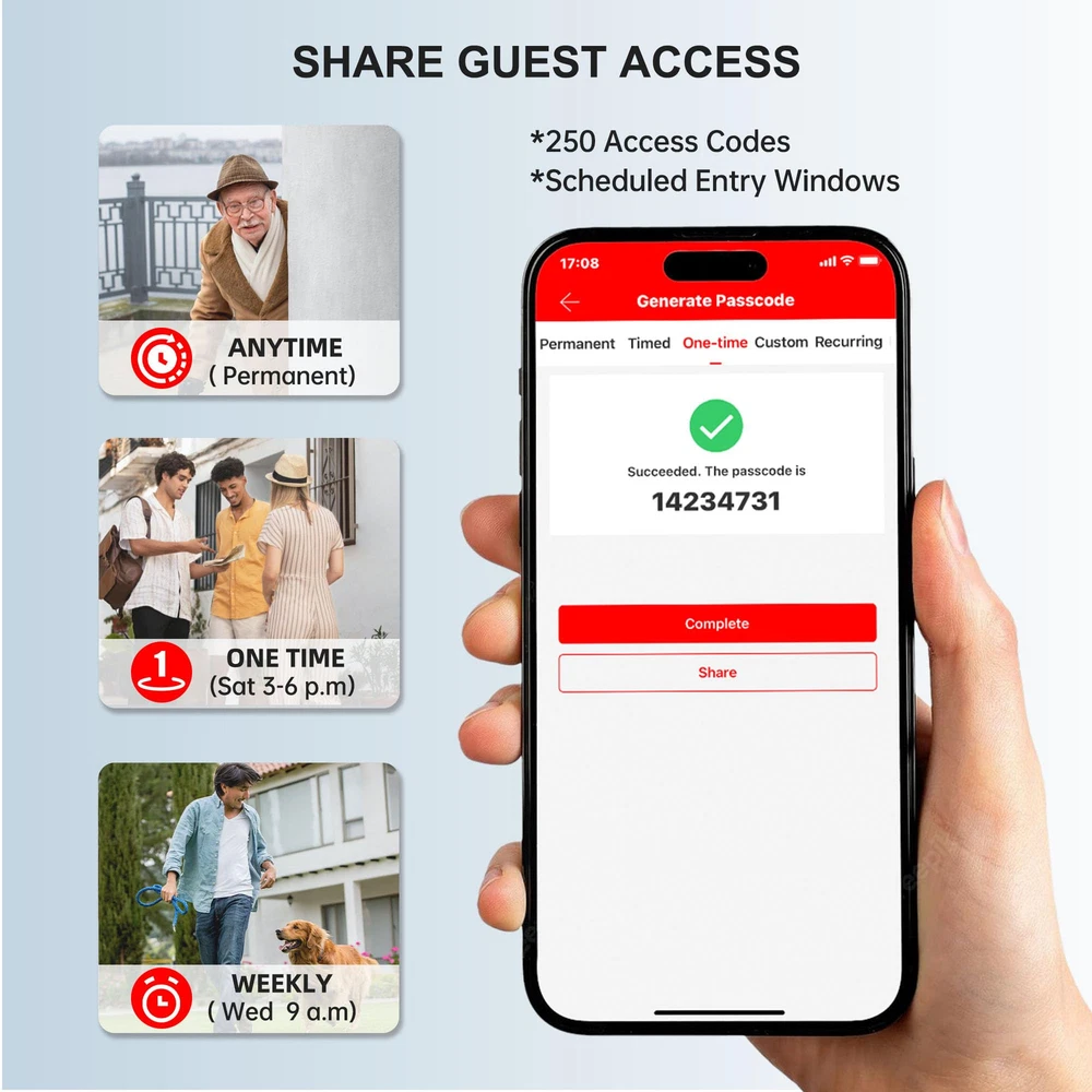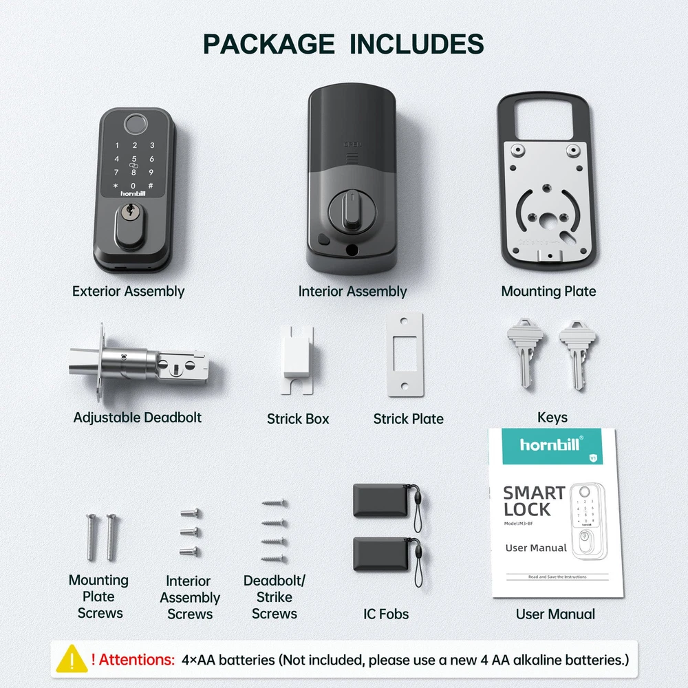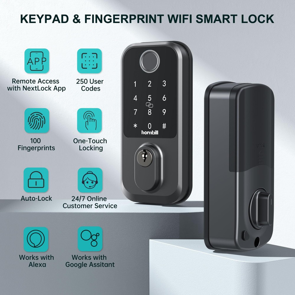 【9-in-1 Smart Keyless Entry Door Lock】Integrates with Next Lock App. Features fingerprint recognition, passcodes, IC fobs, keys, auto-lock, 1-touch locking, WiFi, Bluetooth, and voice control. Manage your lock easily from anywhere with the app. 【Voice-Controlled Security for Your Home】Smart Lock integrates smoothly with front/back doors. Includes G2 gateway for 2.4GHz WiFi. Control with Alexa or Google Home voice commands. Easily upgrade your home security with this smart lock. 【WiFi Remote Unlock/Lock】Remotely unlock ’s fingerprint door lock—perfect for vacations or when away. Keep the gateway within 16ft (10ft if walls block) of the lock and router for seamless 2.4GHz WiFi. Stay connected and in control from anywhere. 【Biometric Unlock Revolution】Unlock your smart deadbolt in 0.3 seconds with a fingerprint. Store up to 100 fingerprints in the Next Lock App for guests and backups. Say goodbye to lost or copied keys, and enjoy hassle-free access. 【Grant Flexible Temporary Access】Offer temporary access codes for dog walkers, guests, housekeepers, or staff. Assign up to 250 passcodes and revoke them anytime. No more worrying about extra keys floating around, you're in control. 【Auto-Lock & 1-Touch Locking】Never worry about forgetting to lock your door again. Set the auto-lock to engage 1-900 seconds after closing, or tap the "#" sign on the keypad for immediate locking. Perfect for busy lifestyles or added peace of mind. 【Low Battery Alerts & Type-C Emergency Charging】Monitor battery life in the Next Lock App. Get notified when battery drops below 20%. Includes a Type-C backup charging port for temporary power, ensuring you're never locked out due to a dead battery.