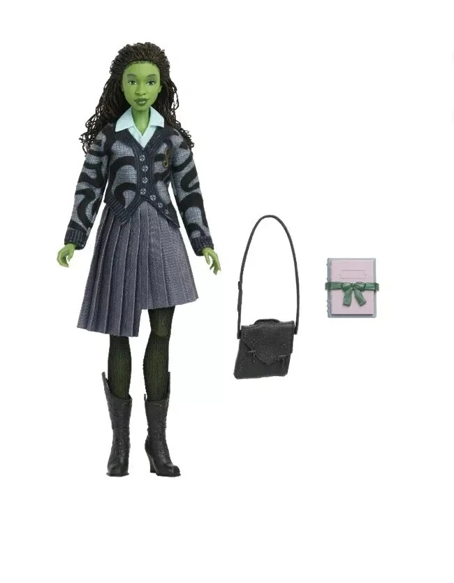 Welcome to Jolly Old Shiz with the Elphaba at Shiz University fashion doll! Inspired by Universal Pictures’ Wicked, Elphaba doll wears her removable school uniform, like her button up cardigan, asymmetrical skirt, leggings, and boots. Elphaba is ready for her thrillifying magic lessons – Elphaba features her school bag and Ozian textbook accessory! She features her green skin and black braided hair styled in a half ponytail, along with flexibility at the torso, elbows, wrists and knees for play and display! Highlighting the magic of sisterhood and friendship, Wicked dolls make an inspiring gift for kids -- and kidults -- to play out their enchanting and thrillifying dreams! Doll is brand new in sealed box; box has 1/2" crack on the bottom of the clear plastic covering. From a smoke-free home Returns accepted if I missed a flaw or made a mistake and I will pay the return shipping. Otherwise return shipping is at buyer's expense. I am happy to combine and reduce shipping on all items if possible. I ship within 1-2 business days