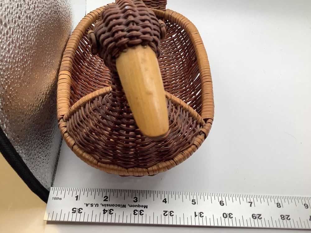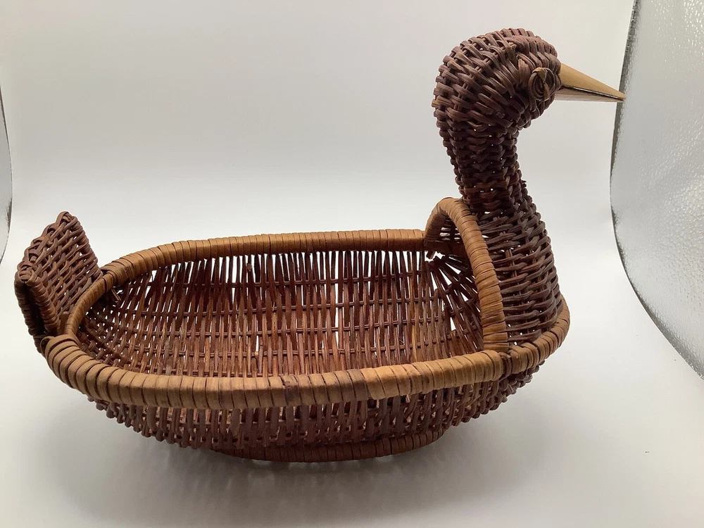 This vintage wicker duck basket features an oval shape with a bamboo wood beak, adding a charming touch to any farmhouse or country-themed decor. The duck character design is accented by a stained finish, giving it a rustic look. Perfect for collectors of decorative items, this miniature wicker basket is a unique and whimsical addition to any home.