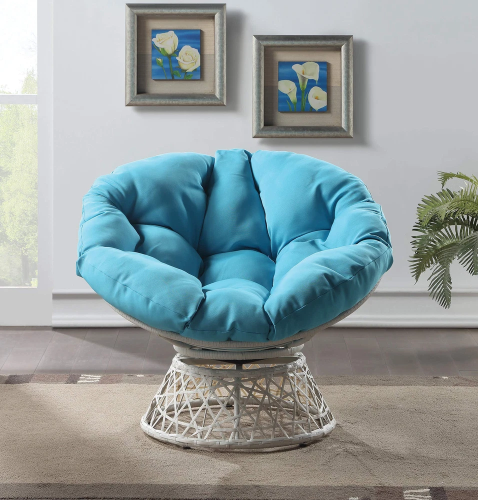Create a laid back vibe in your home with our twist on the classic papasan chair design. Nest into the generously large Dacron-filled cushion. Enjoy the boho styling of our durable resin wicker wrapped over a metal frame. Complete with a 360° swivel to twist and turn to your heart’s content. Tune in to a time when listening to your favorite albums and sipping on a cool, refreshing drink was your only ambition for the day. Add a bit of fun to your living room, family room or dorm with our easy, casual Papasan Chair. Available in several exciting colors and finishes. Durable, well built and just plain fun! Enjoy the boho styling of our papasan chair made with durable resin wicker wrapped over a metal frame. Lounge and twist and turn to your heart’s content with virtually frictionless 360 degree swivel. Nest and relax into the generously large high quality soft Dacron-filled button tufted cushion. The seat cushion is easy to remove dust and debris since it is tied on the frame by straps. Overall Size: 40” W x 36” D x 35.25” H; Seat Size: 40” Diameter x 4.5” T; Back Size: 40” W x 18” H x 4.5” T