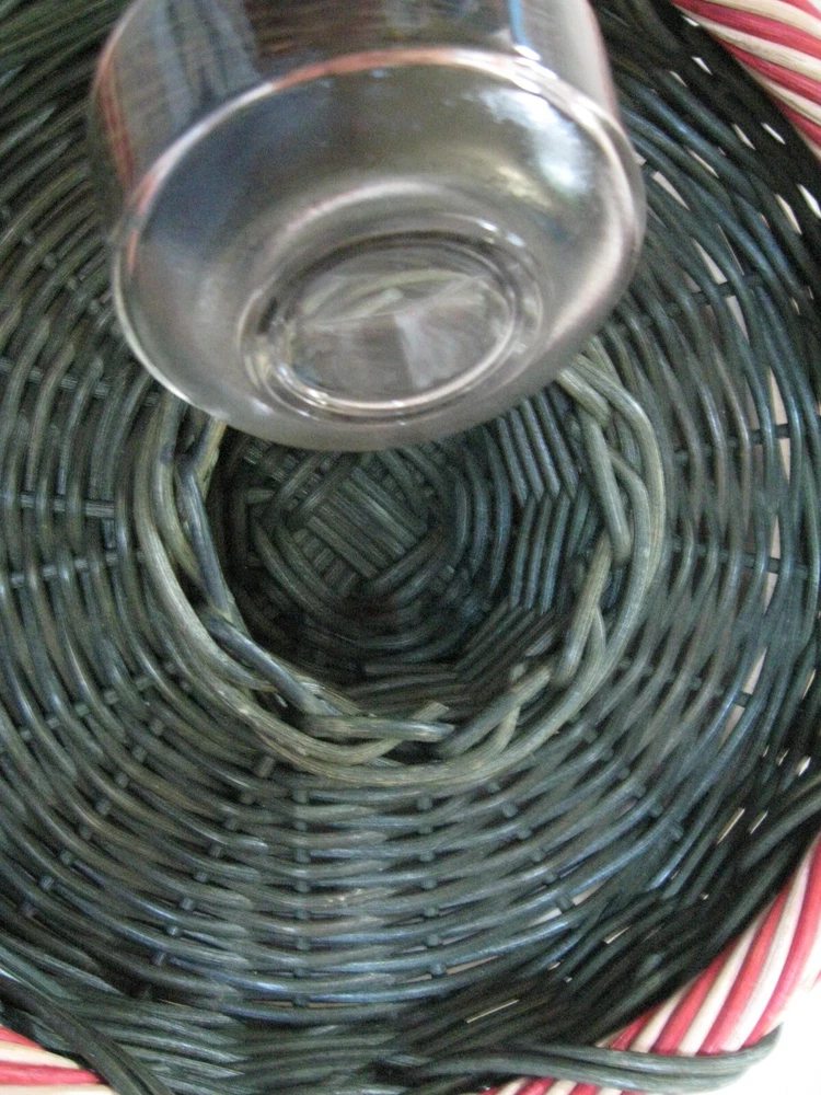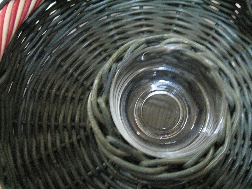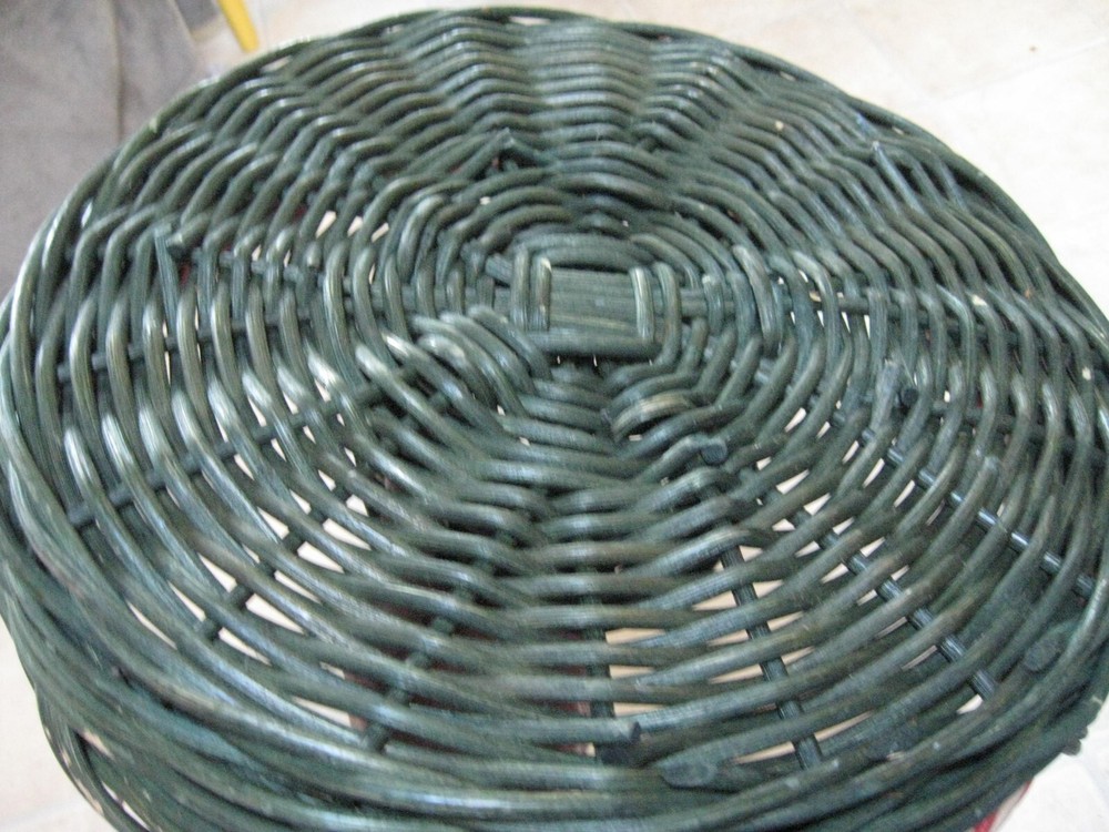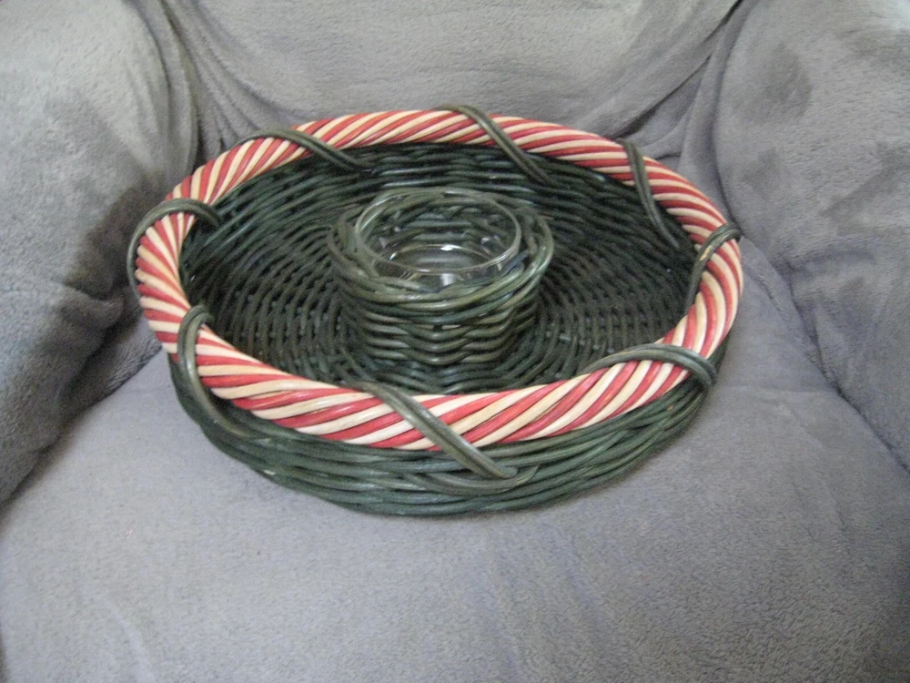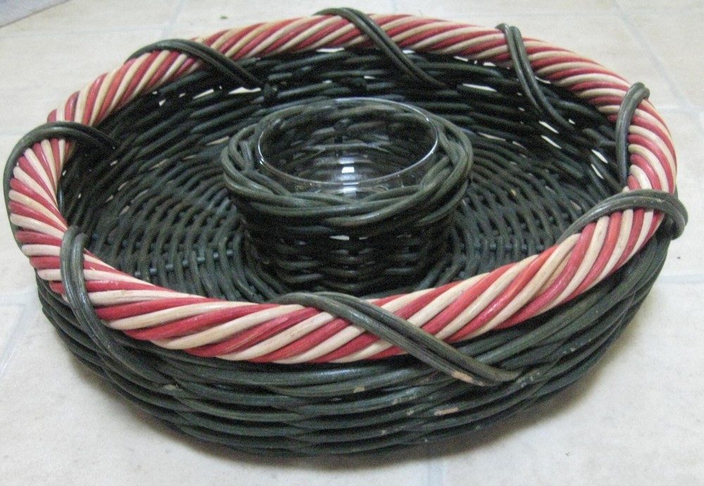 Occasion:Christmas, PartyUPC:Does not applyTheme:HolidayBrand:UnknownType:TrayFeatures:Glass bowl for dipDepartment:AdultsCountry/Region of Manufacture:UnknownShape:RoundSeller Notes:“Paint is worn in a few spots; see photos.”Material:Rattan, WickerStyle:CountryItem Height:3.5"Color:Green, Red, and Whitegtin13:Does not applyFinish:PaintedItem Diameter:14.5"