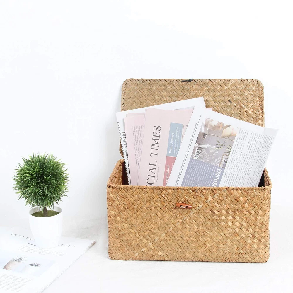 Set of 3 Wicker Basket - Multiple sizes are combined to meet daily storage needs.Large baksets:14.2"x9.4"x7.3", Medium Baskets:12.2"x7.1"5.9",Small Baskets:10.2"x5.5"x4.3" Premium Material - Woven storage basket is made of 100% natural wicker and metal frame with a light grass scent, perfect for storing nightstands. Storage basket with lid is closed by a buckle, which is dust-proof and prevents naughty babies or pets from opening the box, so that the items have a safe storage environment. Wicker baskets with lids add a boho style to home decor and are perfect for bathrooms, bedrooms, kitchens, living rooms and more. It is not only a stunning decorative boxes, but also a versatile storage boxes with a lock. Decorative Storage Bins are great for organizing Kids Toys, Snacks, Books, Make up and Hair Accessories and other small things.It can be displayed anywhere you want without taking up too much space.